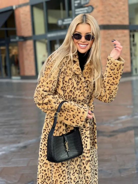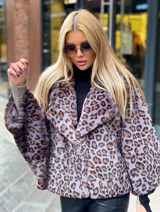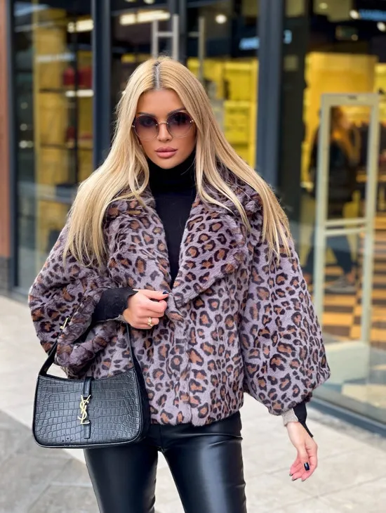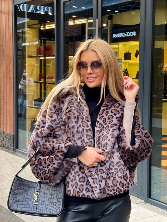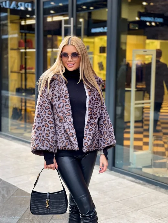 Короткая шуба под леопард из экомеха – выбор девушек, которые идут в ногу со временем. Изделия из экомеха прекрасная альтернатива для тех, кто хочет выглядеть стильно, но бюджет ограничен. Оптимальная длина комфортна в носке и не сковывает движение, что удобно при вождении машины. Теплый мех согреет в прохладное время года. Широкие рукава подчеркнут изящество кистей.