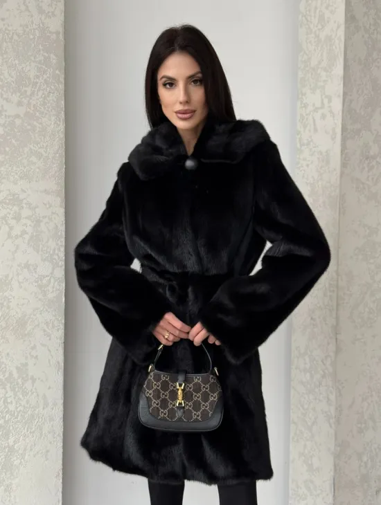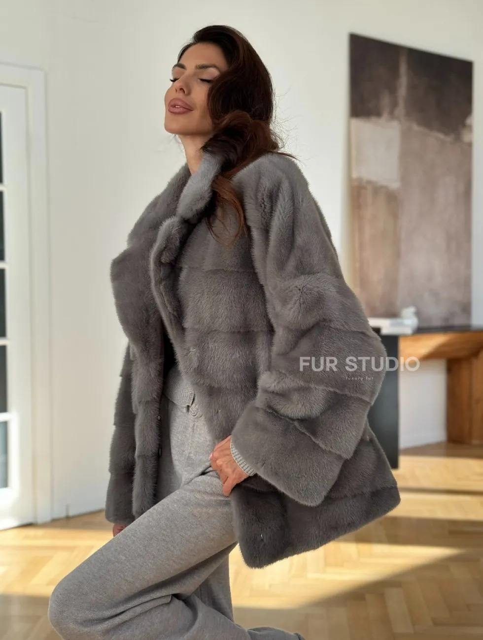 Мех данной шубы аукционная норка, цвет серый. Предлагается в размерах от 42 до 54. Длина модели 65-70 см, что выгодно подчеркивает фигуру девушек. Эта модель идеально подойдет для девушек и женщин, предпочитающих роскошные натуральные меха.