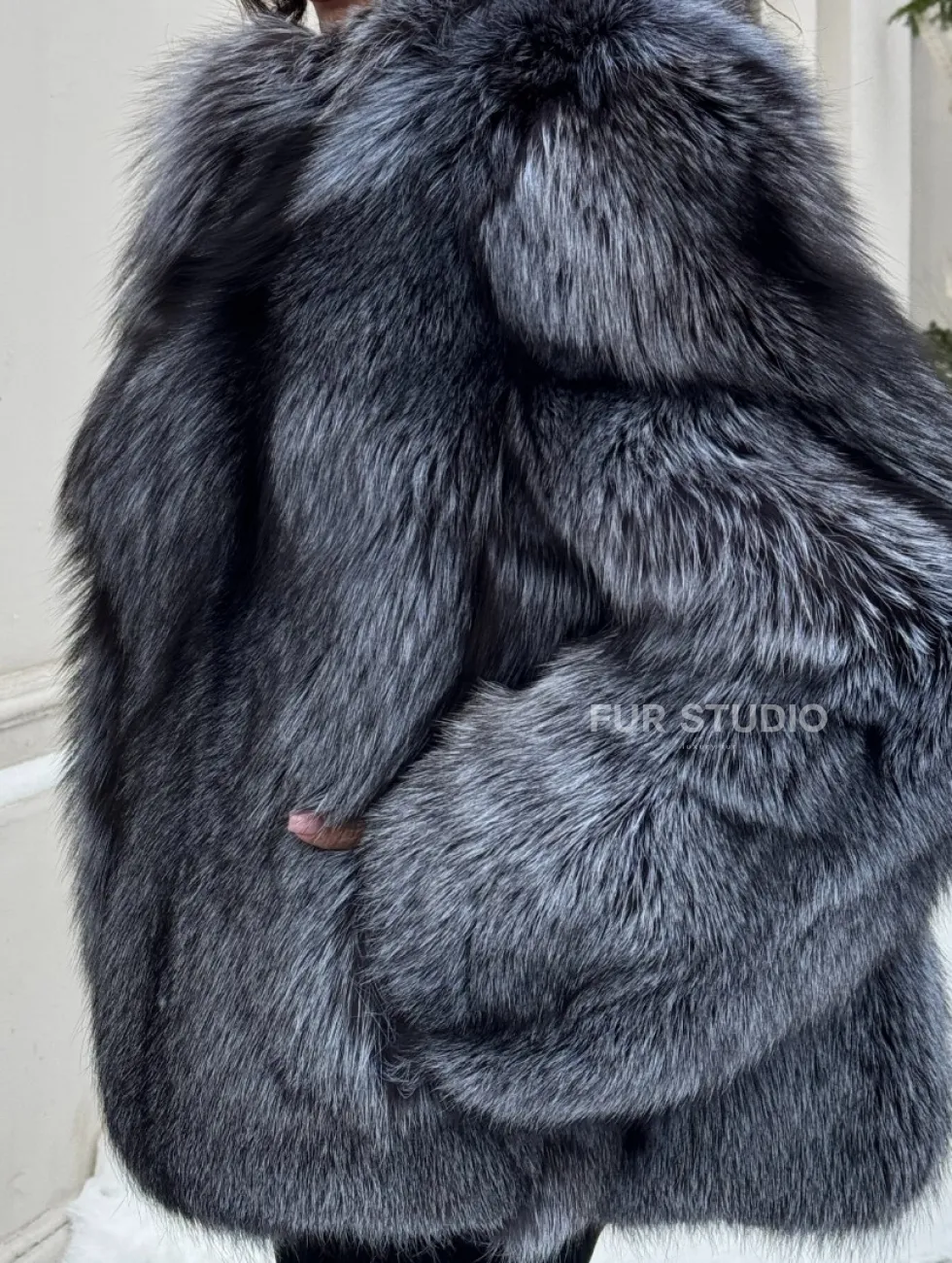 Мех данной шубы лиса, цвет серый. Предлагается в размерах от 42 до 46. Длина модели 60-65 см, что выгодно подчеркивает фигуру девушек. Эта модель идеально подойдет для девушек и женщин, предпочитающих роскошные натуральные меха.