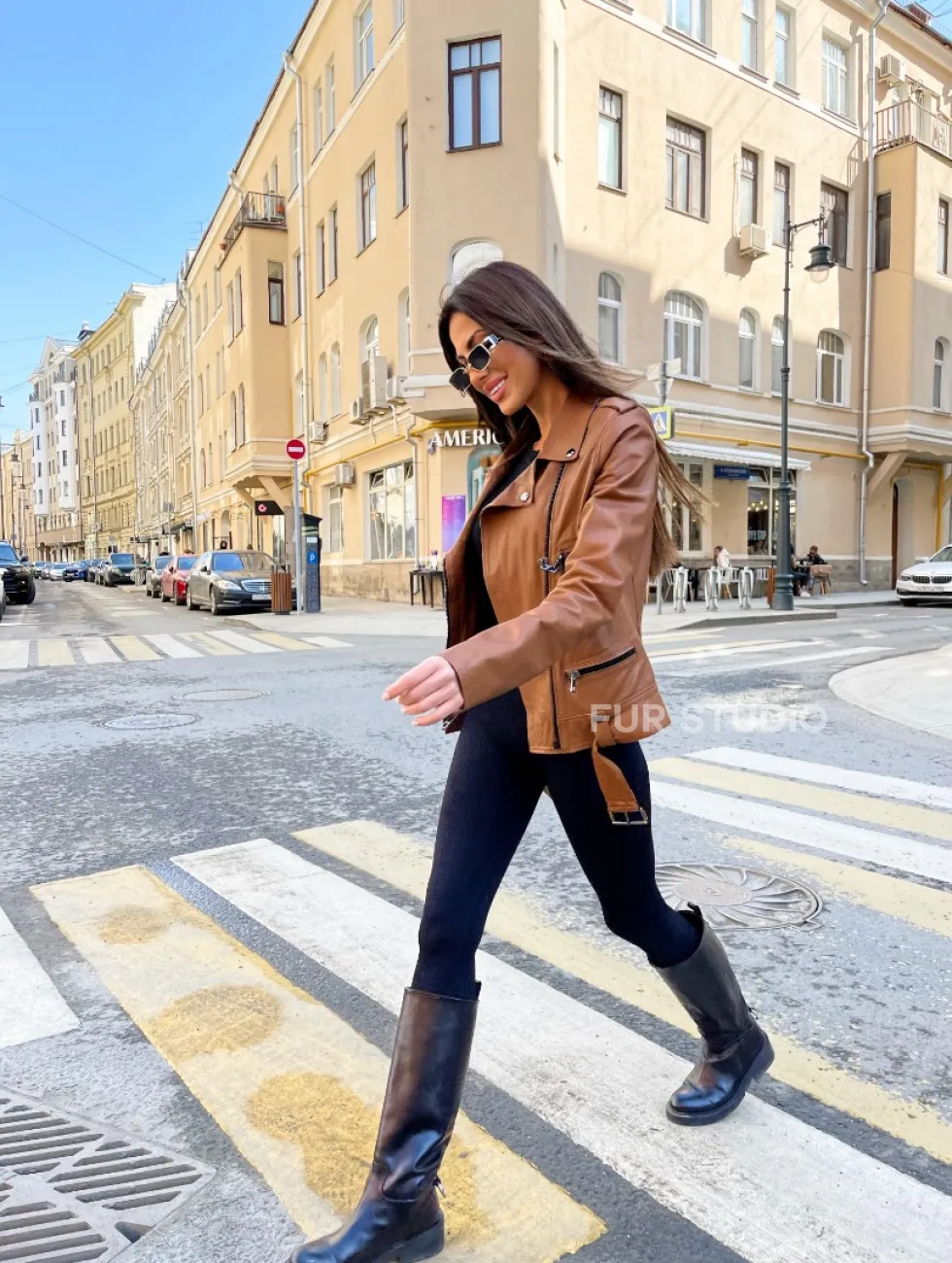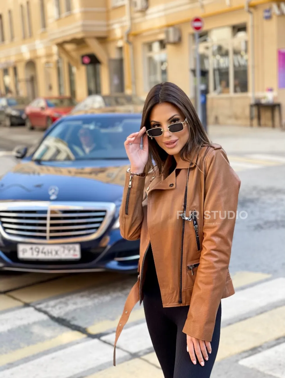 Косуха из натуральной кожи в цвете кэмел доступна для покупки в нашем шоуруме Furs Studio в Чите, где также предоставляется удобная доставка во все города России.