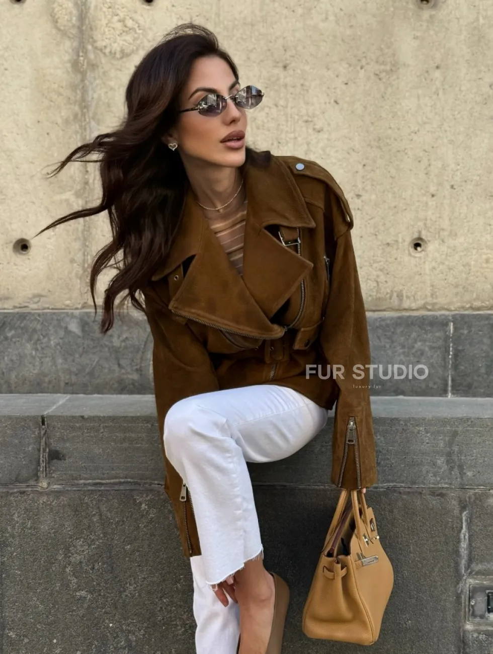 Косуха из натуральной замши под пояс "весна 2025" доступна для покупки в нашем шоуруме Furs Studio в Чите, где также предоставляется удобная доставка во все города России.