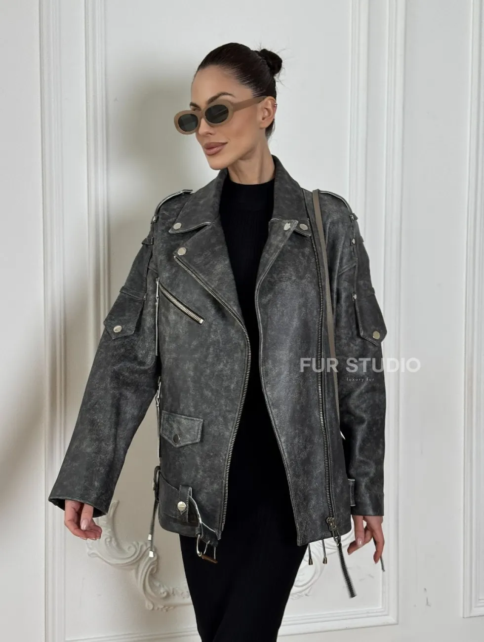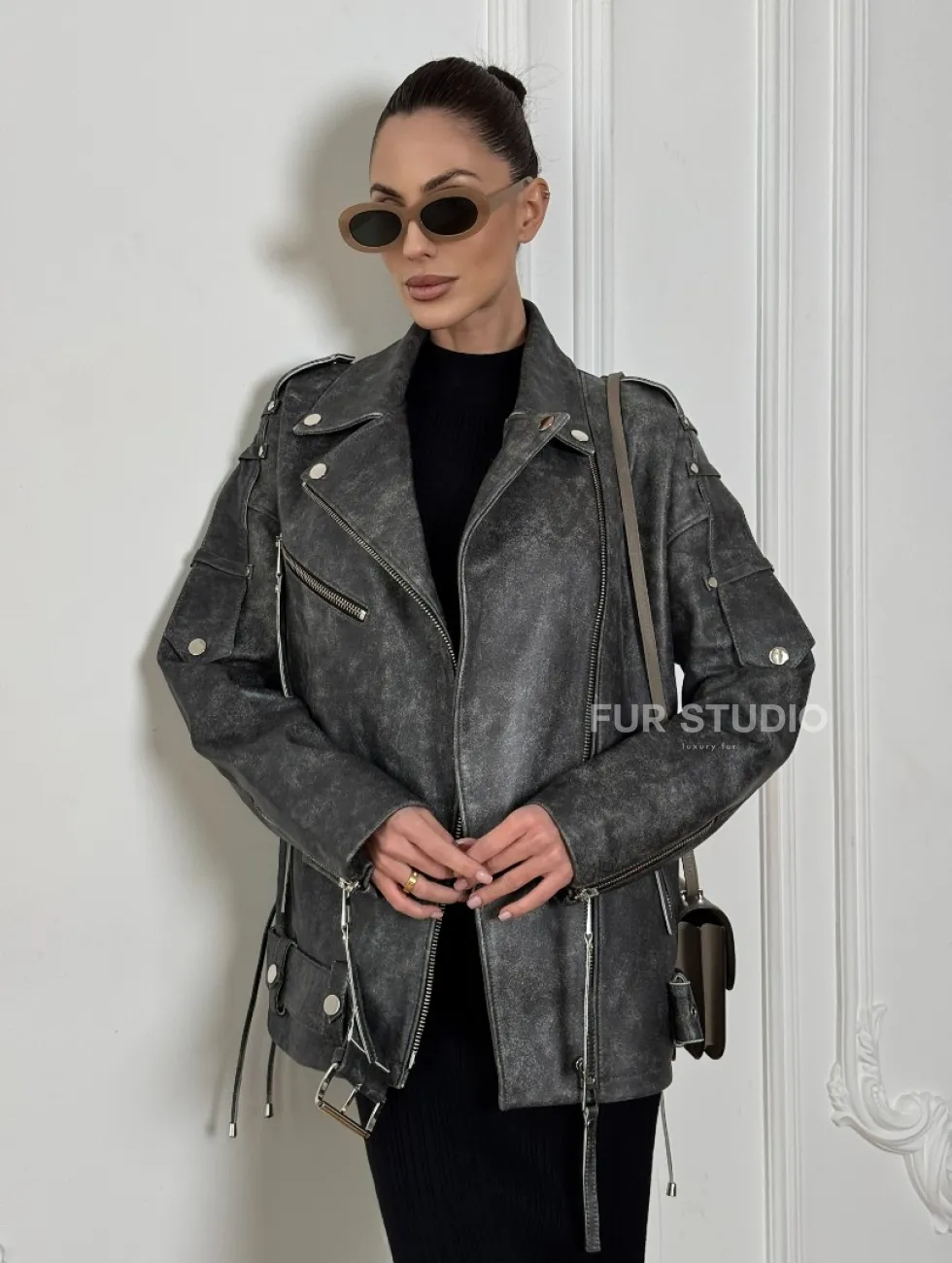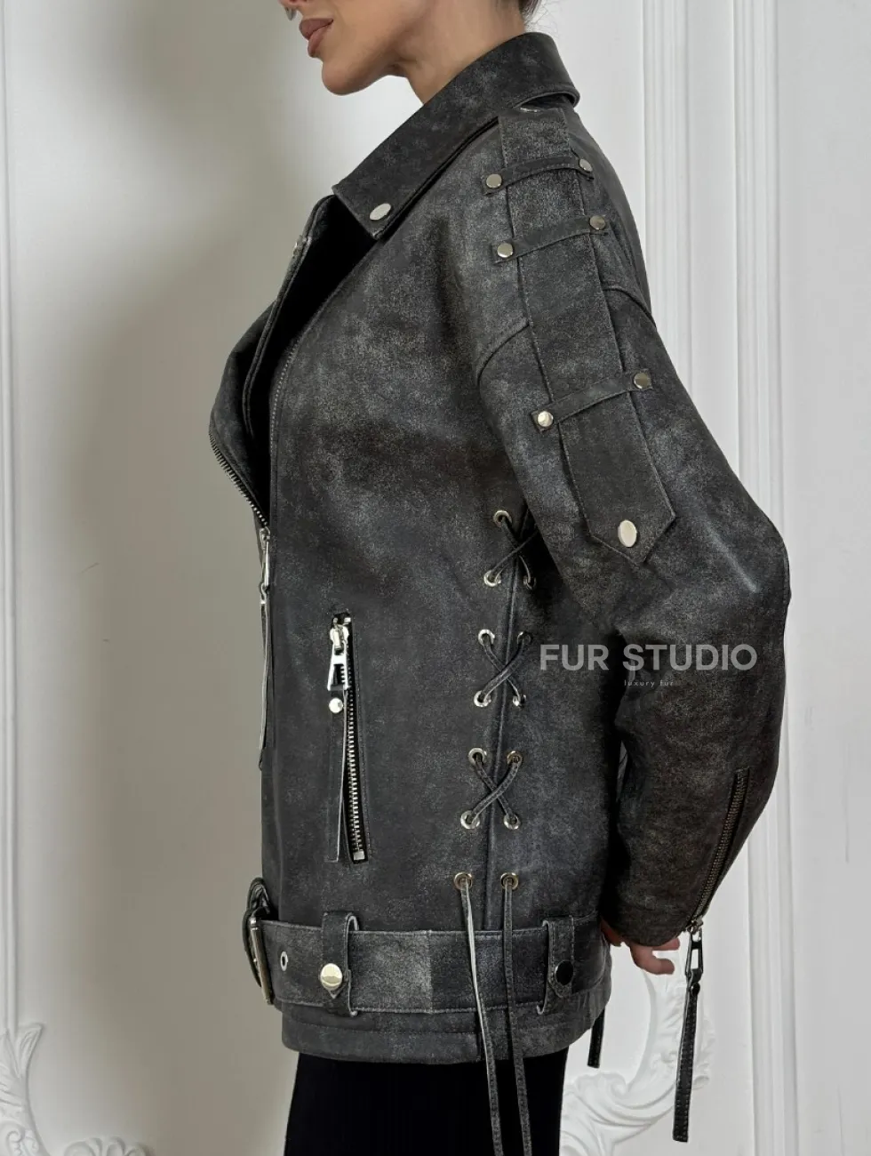Косуха женская из натуральной кожи Vintage со шнуровкой - цвет серый доступна для покупки в нашем шоуруме Furs Studio в Чите, где также предоставляется удобная доставка во все города России.