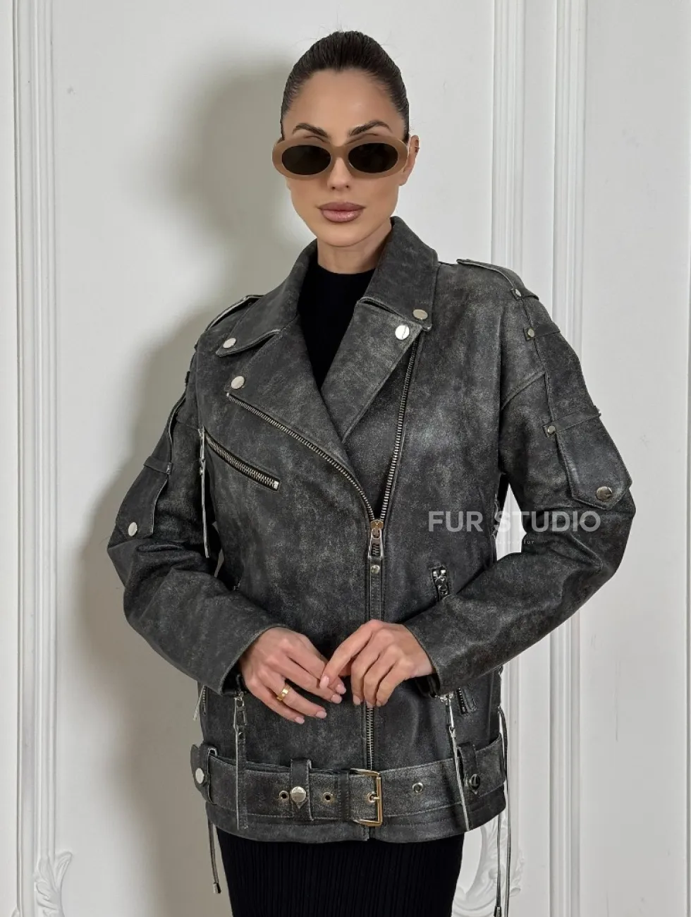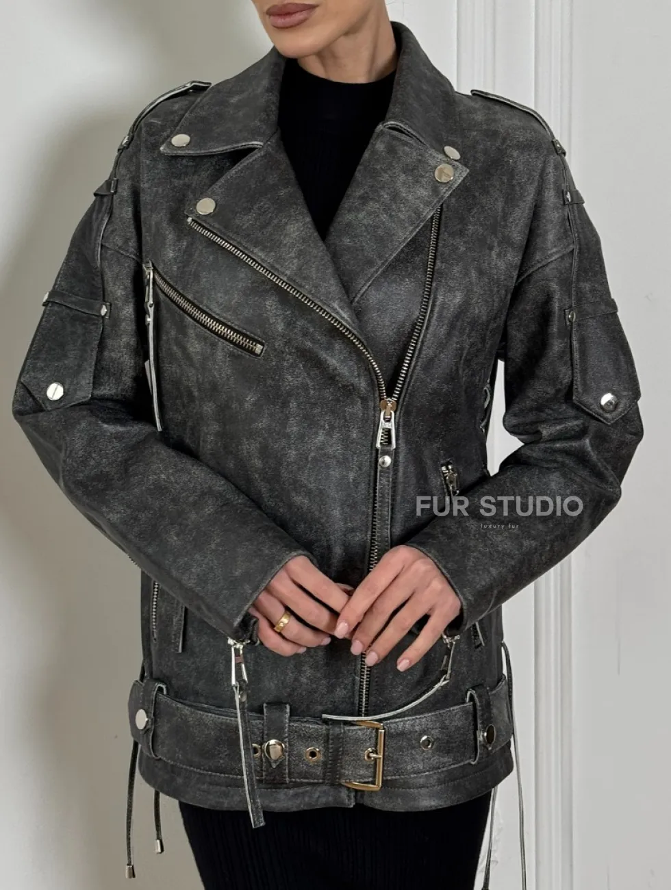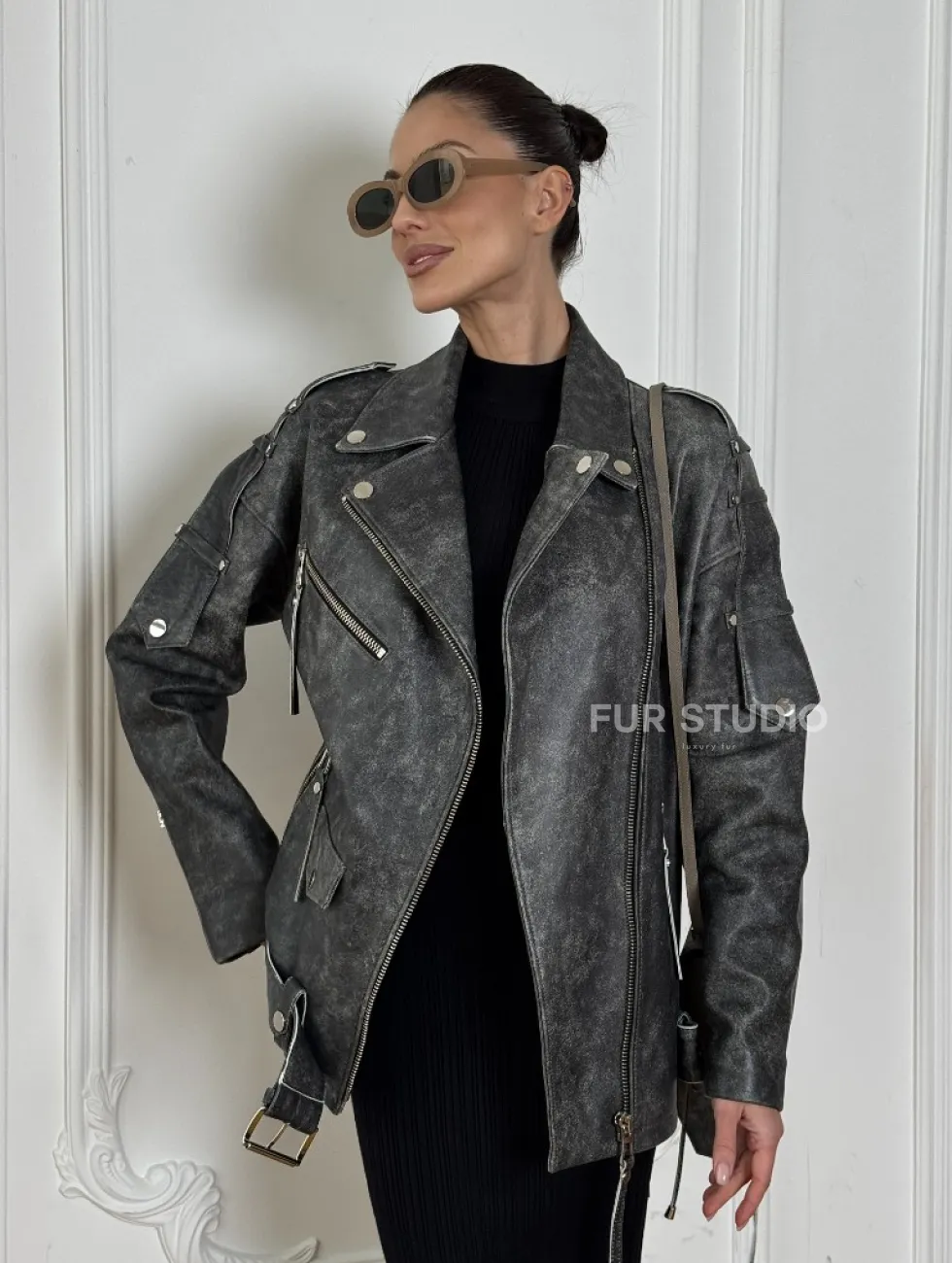 Косуха женская из натуральной кожи Vintage со шнуровкой - цвет серый доступна для покупки в нашем шоуруме Furs Studio в Чите, где также предоставляется удобная доставка во все города России.