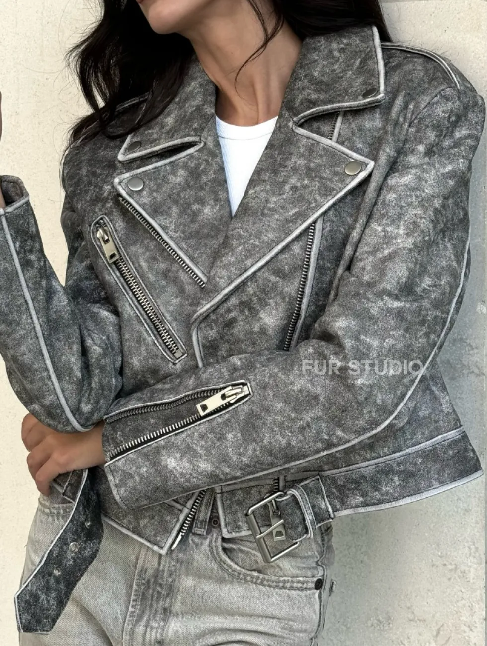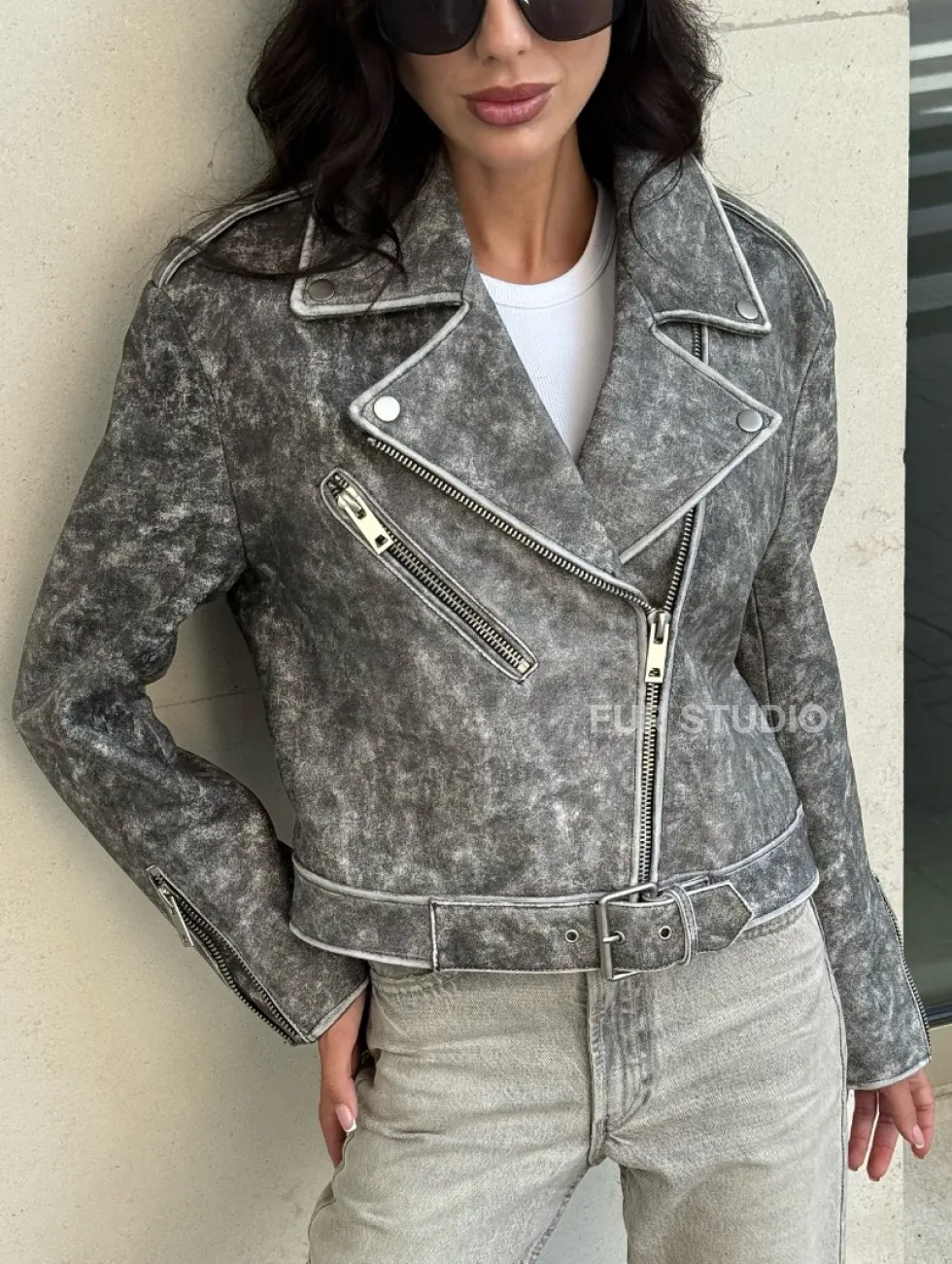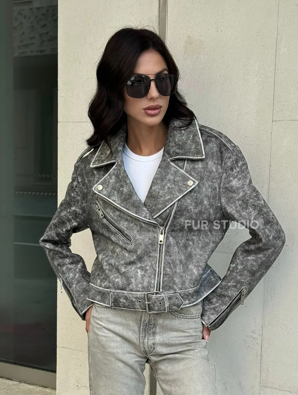 Кожаная укороченная косуха из натуральной кожи "Vintage" доступна для покупки в нашем шоуруме Furs Studio в Чите, где также предоставляется удобная доставка во все города России.