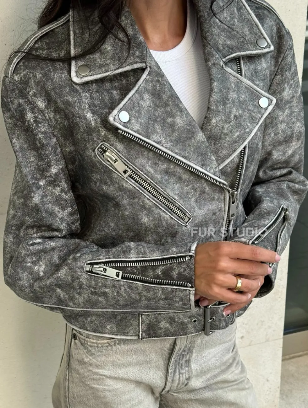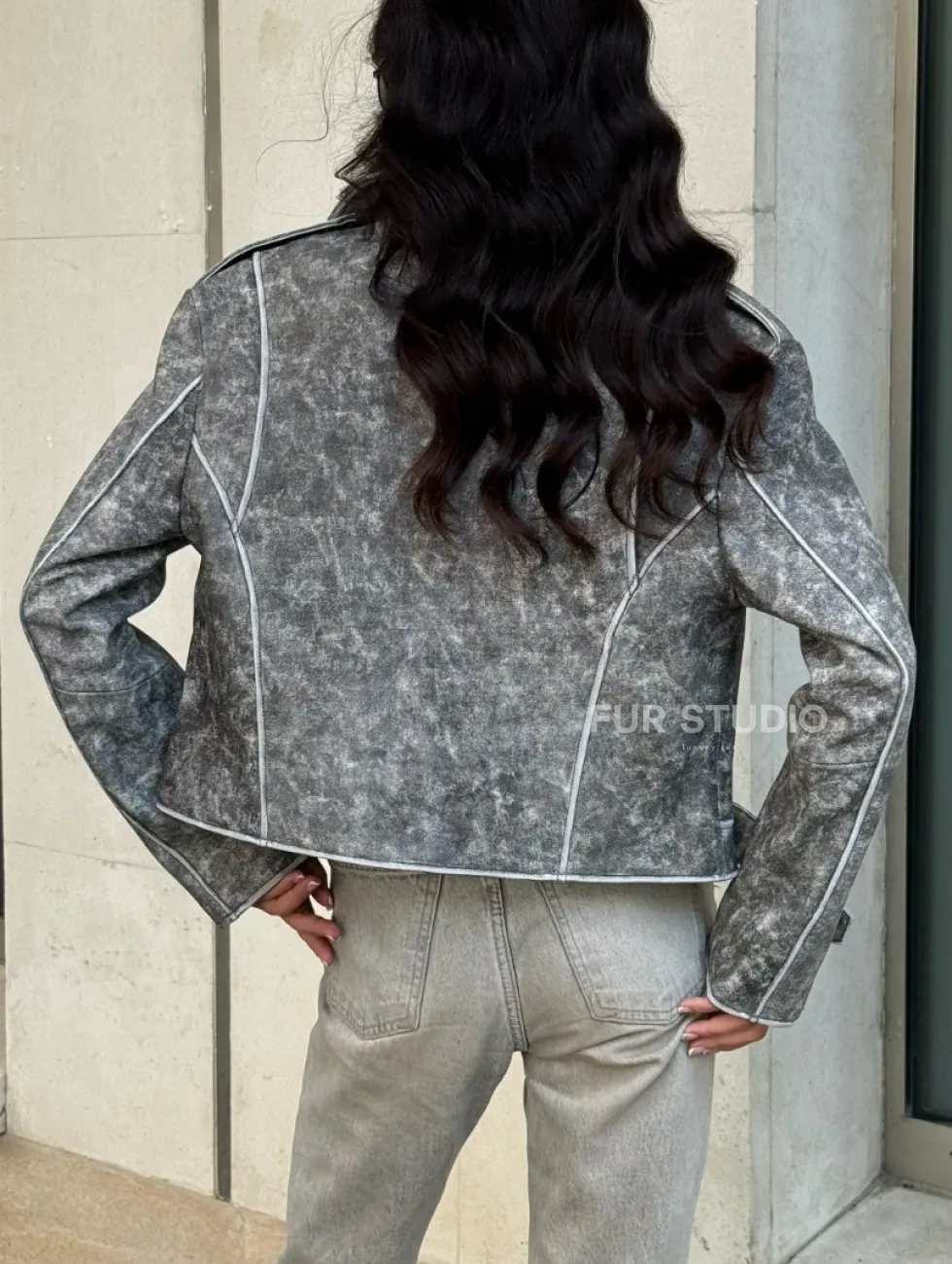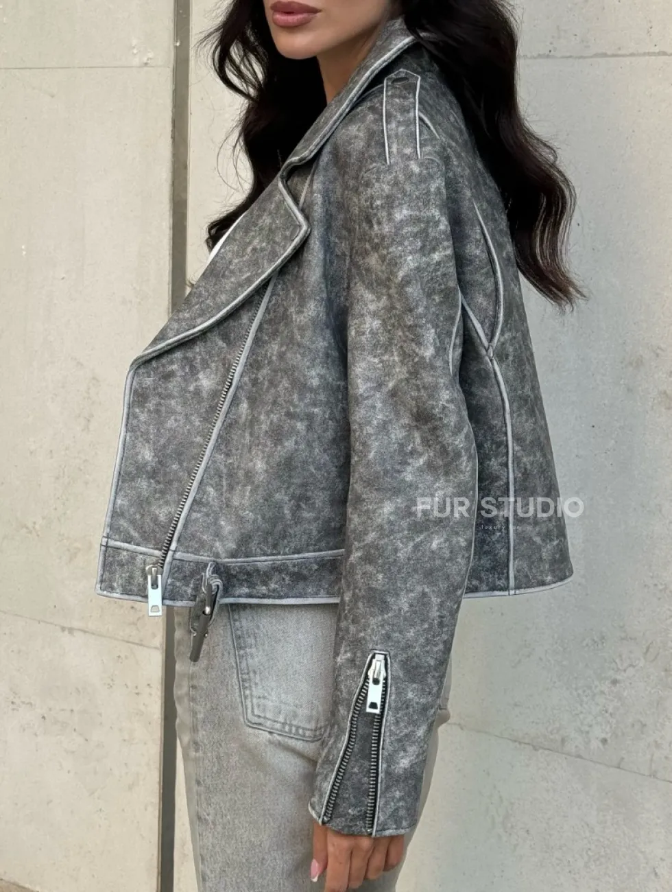 Кожаная укороченная косуха из натуральной кожи "Vintage" доступна для покупки в нашем шоуруме Furs Studio в Чите, где также предоставляется удобная доставка во все города России.
