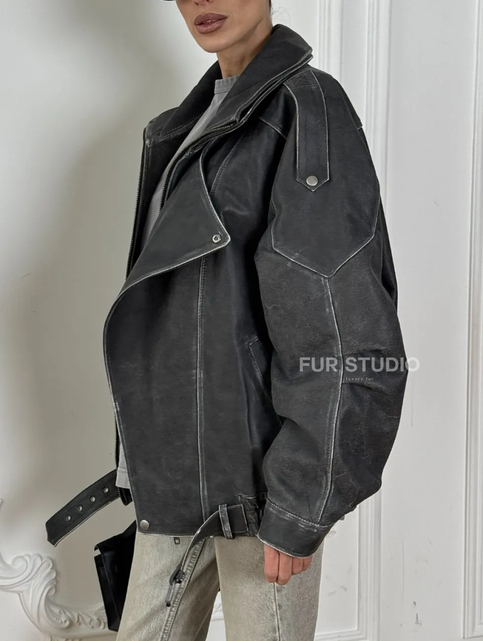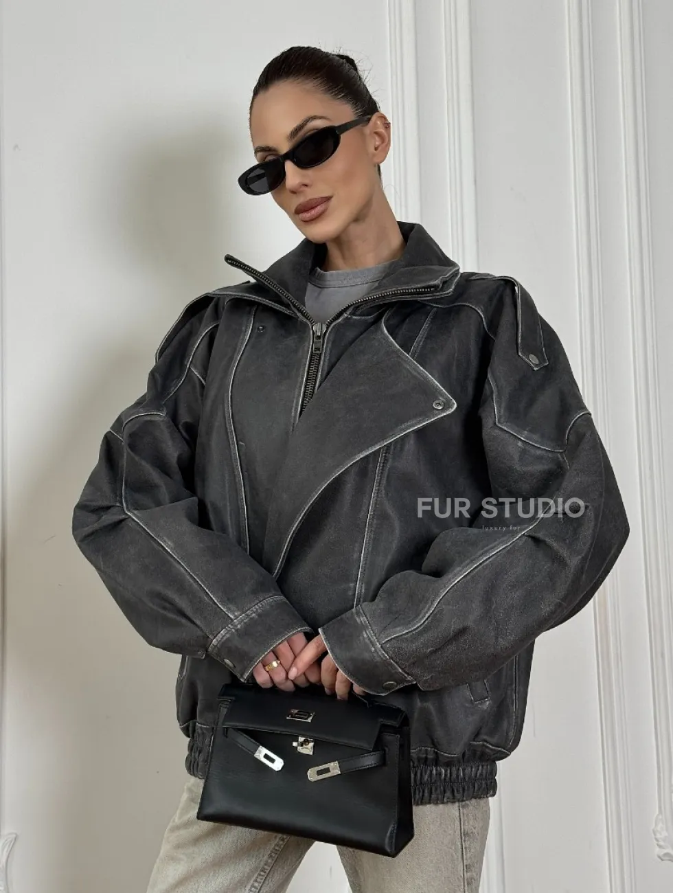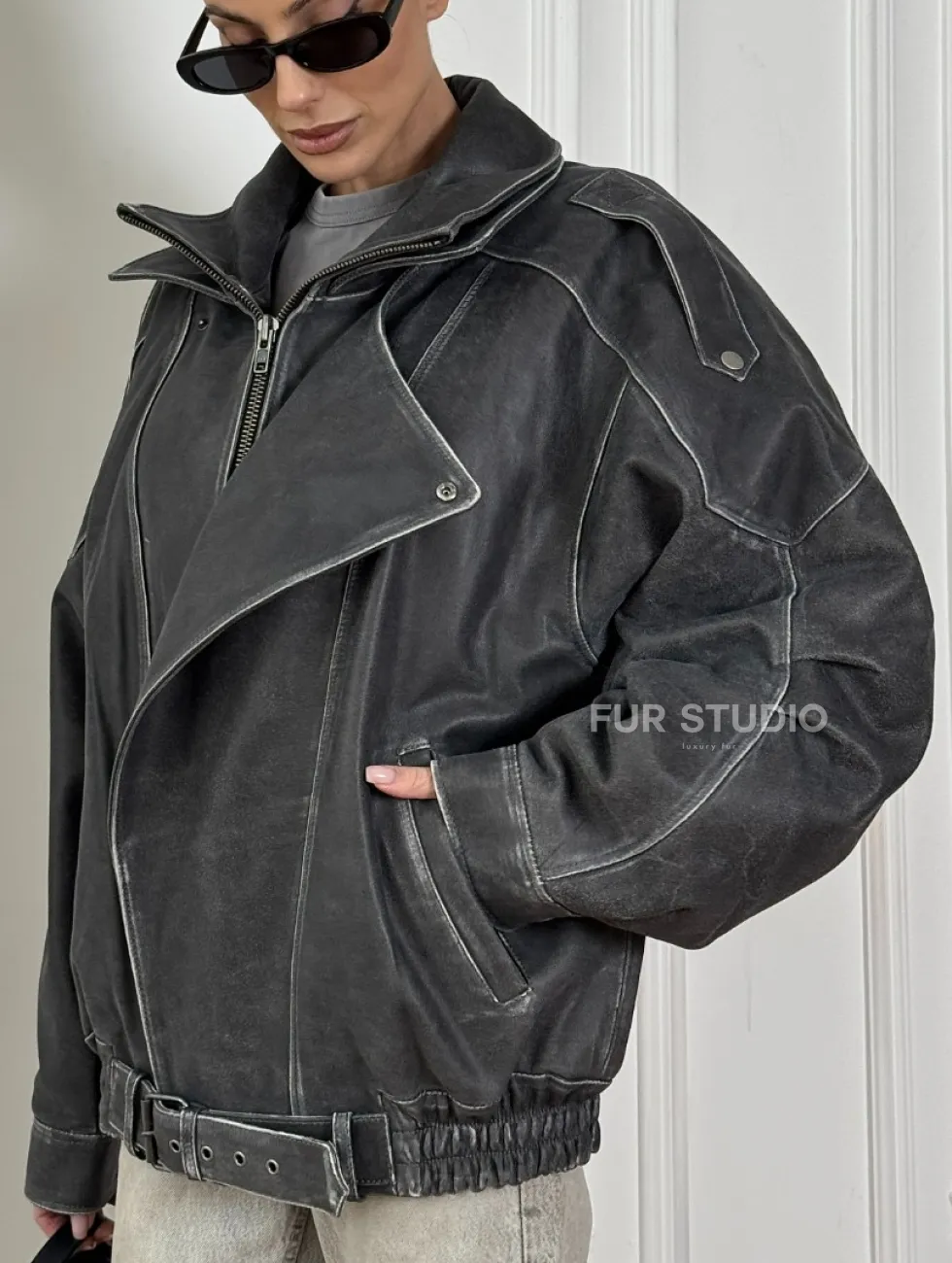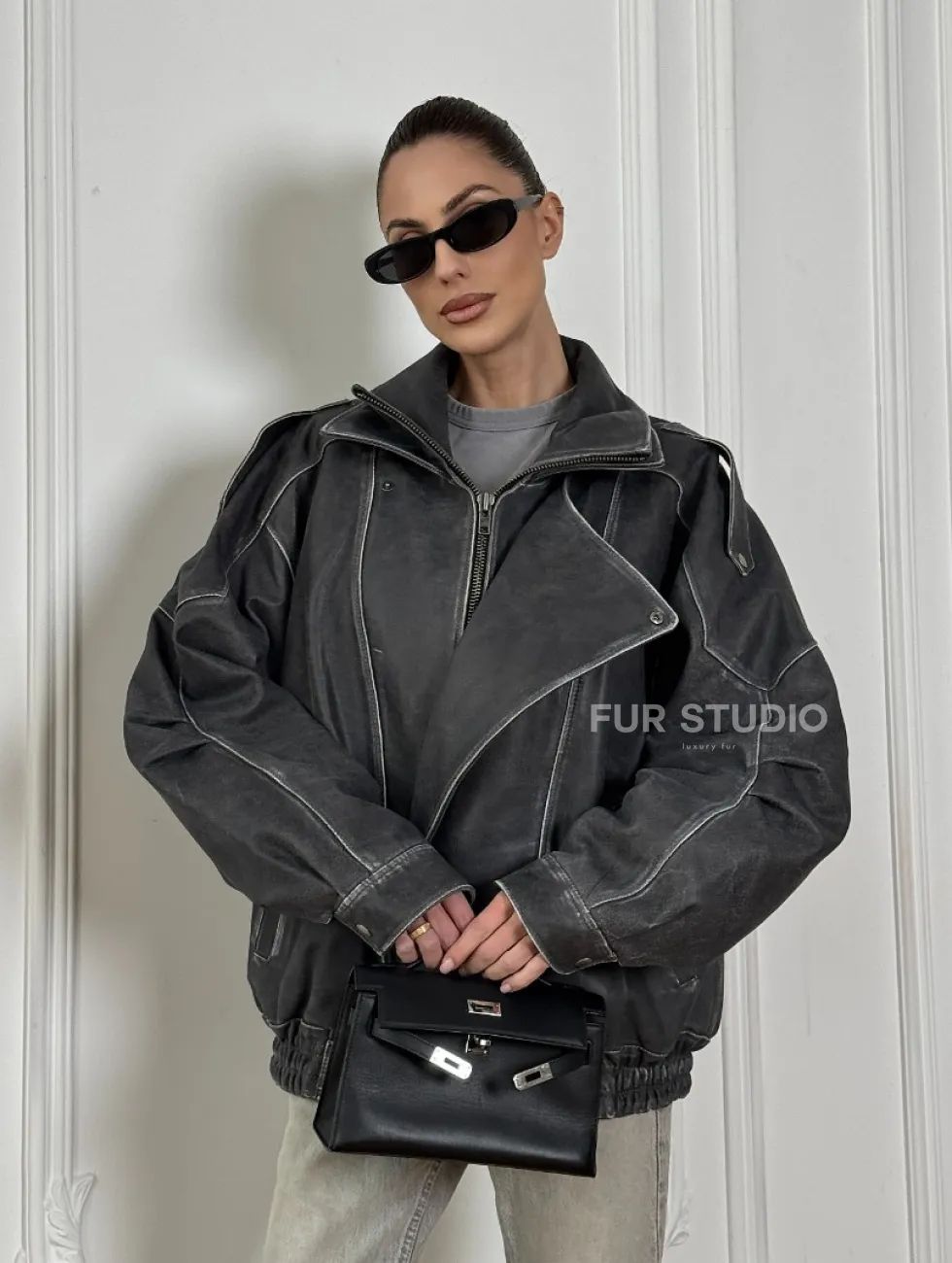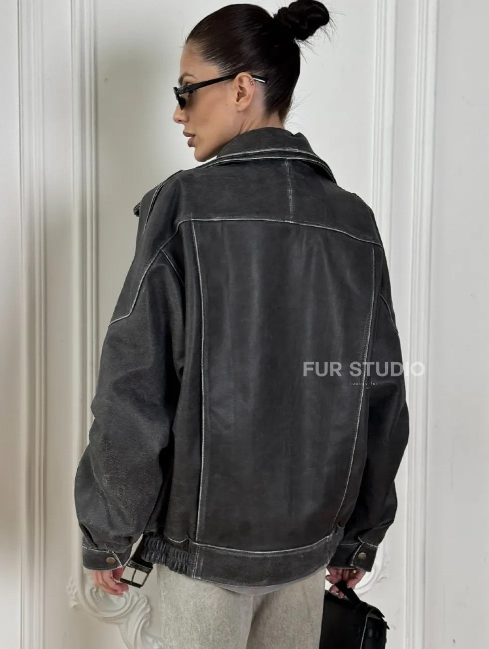 Кожаный женский бомбер Vintage grey с двойным воротником и затертыми швами доступна для покупки в нашем шоуруме Furs Studio в Чите, где также предоставляется удобная доставка во все города России.