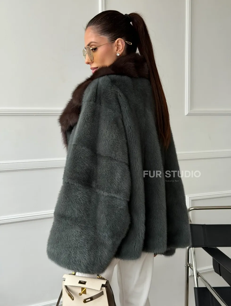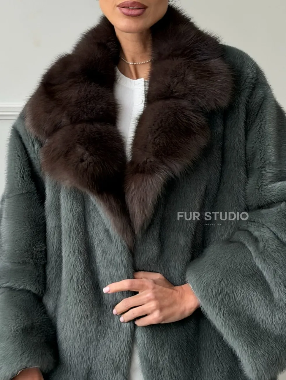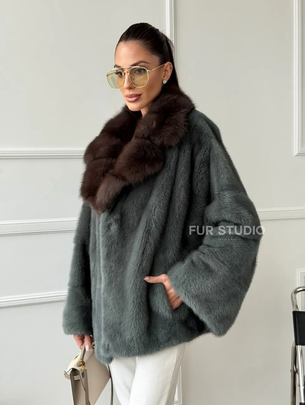 Мех данной шубы аукционная норка , цвет зеленый. Предлагается в размерах от 42 до 54. Длина модели 60-65 см, что выгодно подчеркивает фигуру девушек. Эта модель идеально подойдет для девушек и женщин, предпочитающих роскошные натуральные меха.