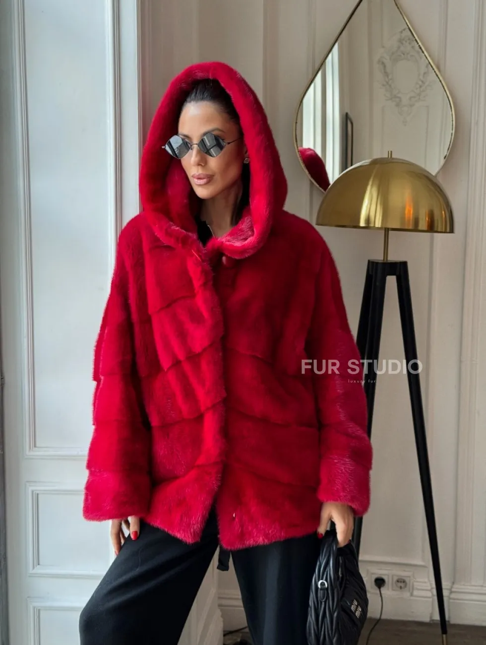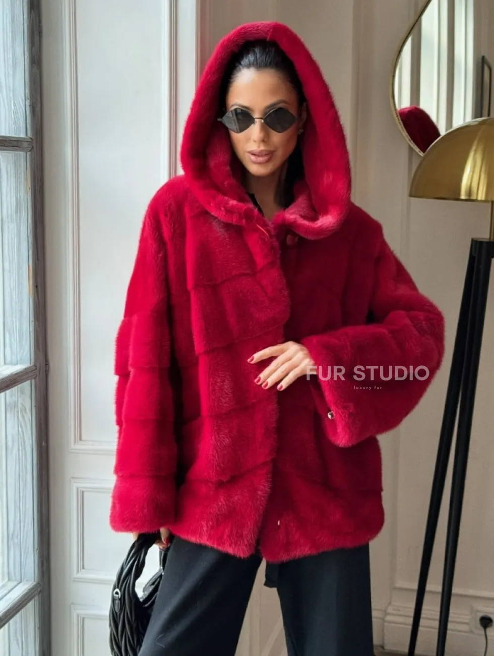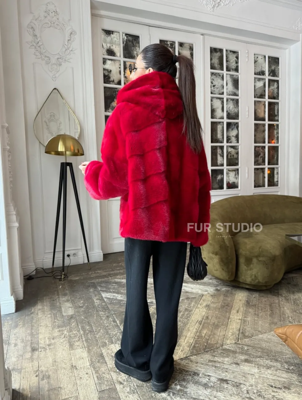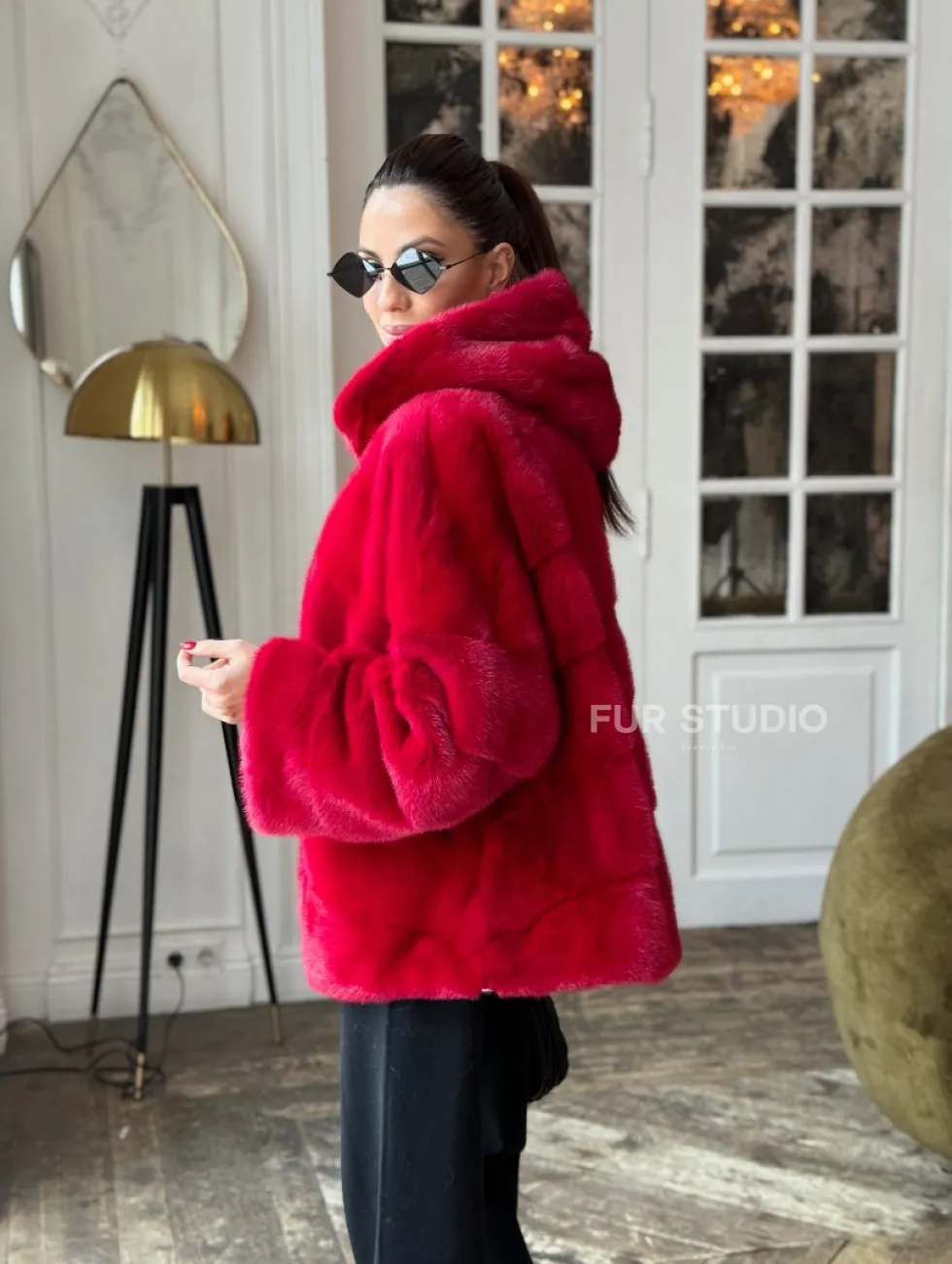 Красная короткая шуба из меха норки с капюшоном, паркет доступна для покупки в нашем шоуруме Furs Studio в Чите. У нас так же есть доставка во все города России. Добавьте немного роскоши в свой гардероб с этой шубой, которая будет служить вам многие годы.
