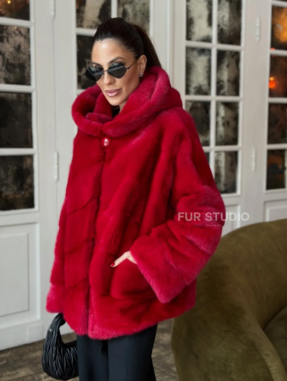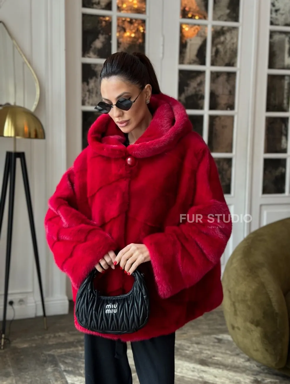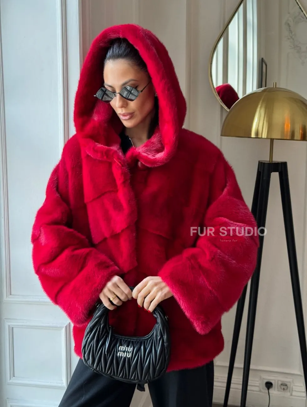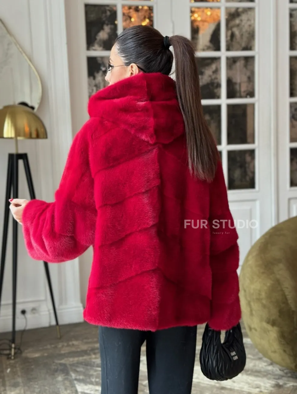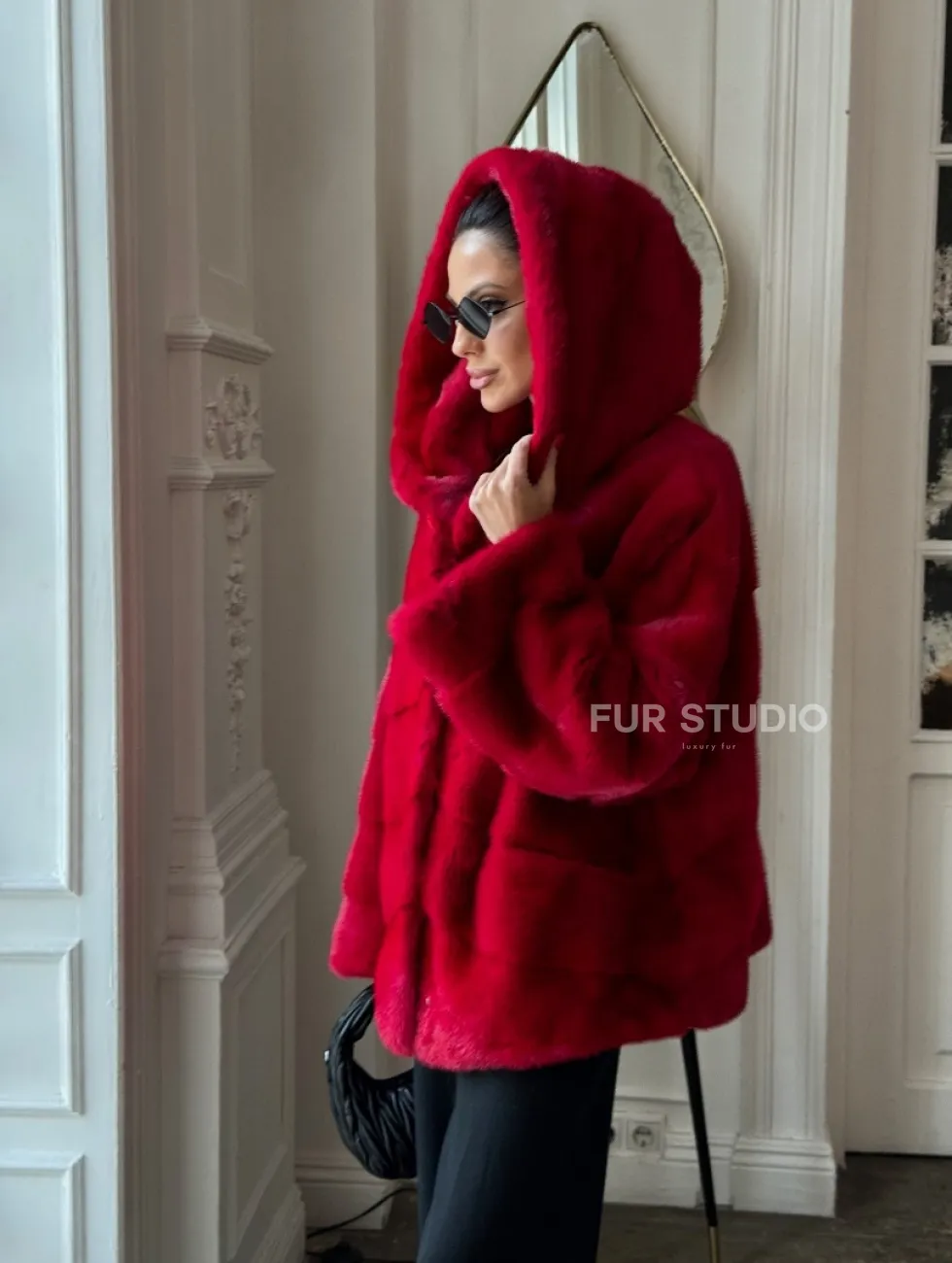Красная короткая шуба из меха норки с капюшоном, паркет доступна для покупки в нашем шоуруме Furs Studio в Чите. У нас так же есть доставка во все города России. Добавьте немного роскоши в свой гардероб с этой шубой, которая будет служить вам многие годы.