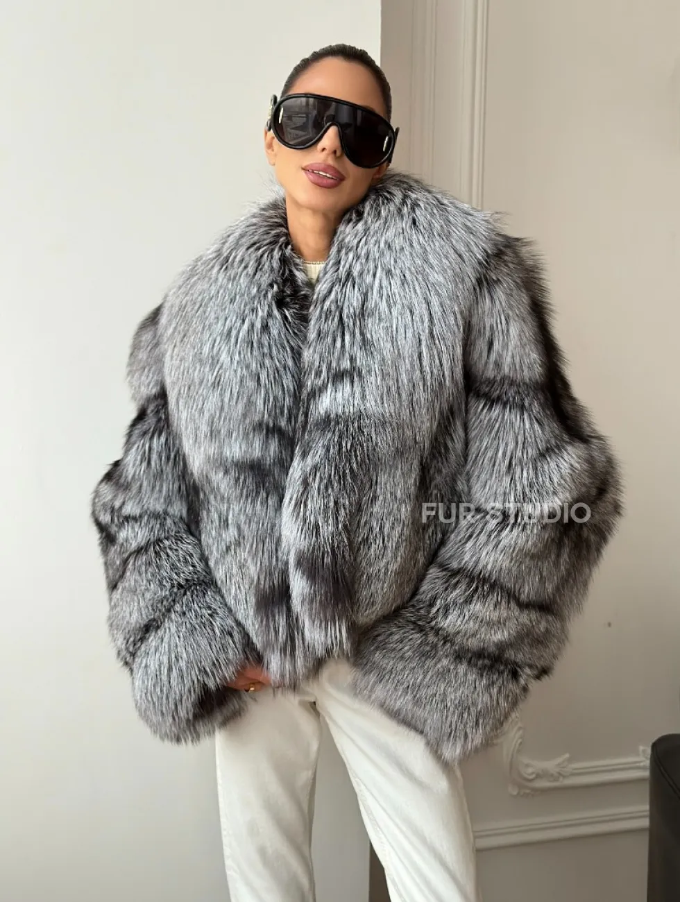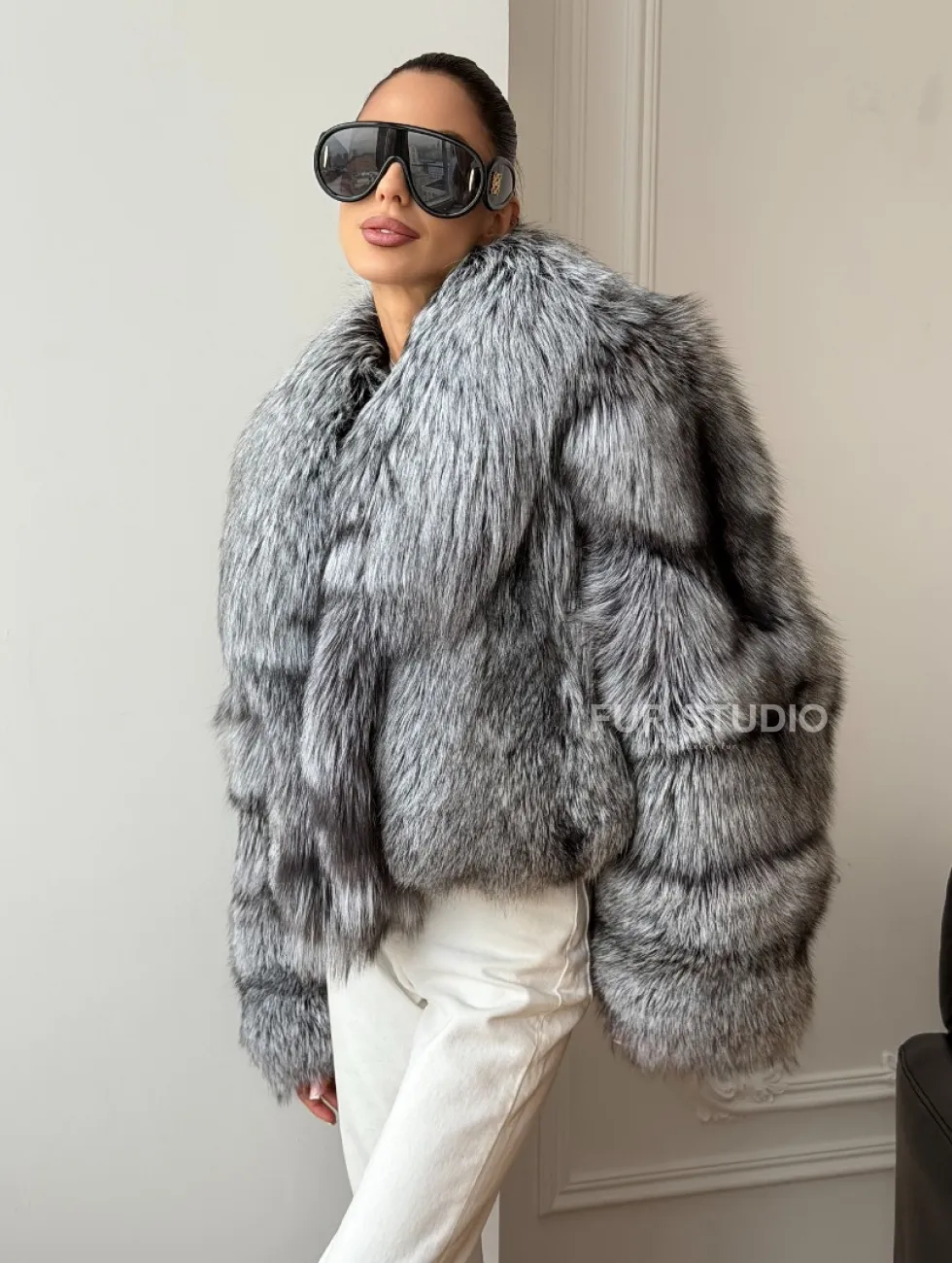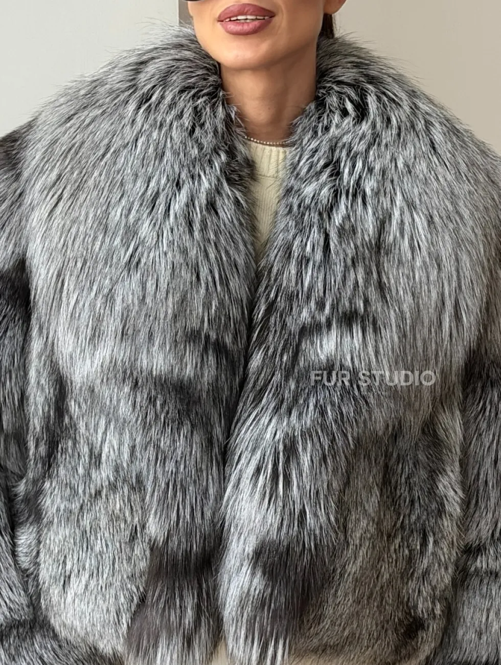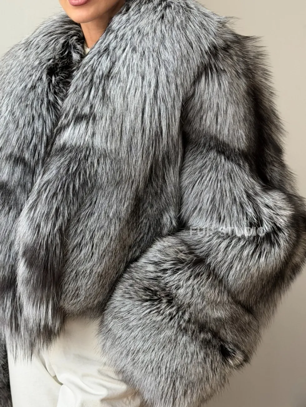 Мех данной шубы лиса, цвет серый. Предлагается в размерах от 42 до 48. Длина модели 50-55 см, что выгодно подчеркивает фигуру девушек. Эта модель идеально подойдет для девушек и женщин, предпочитающих роскошные натуральные меха.