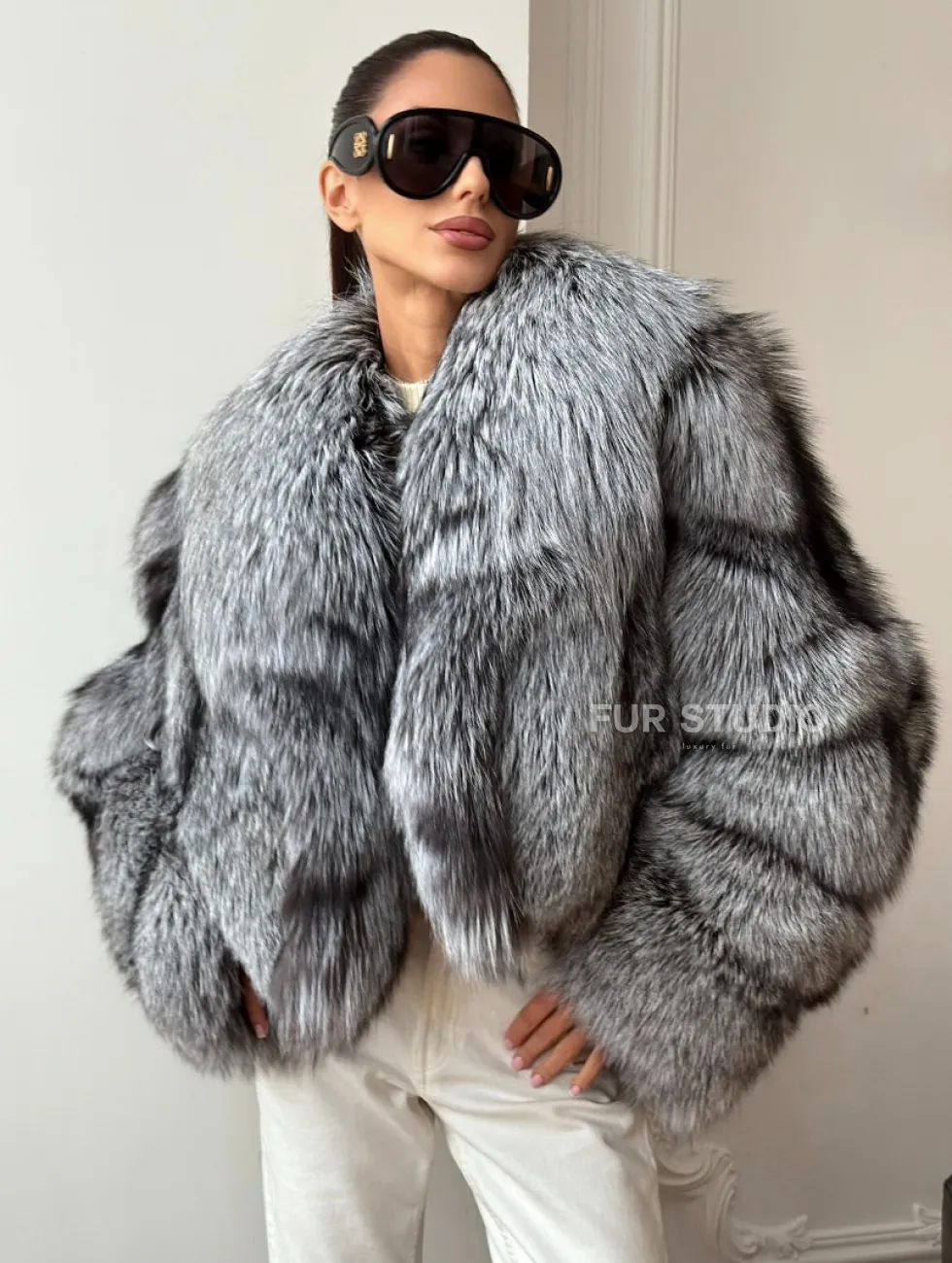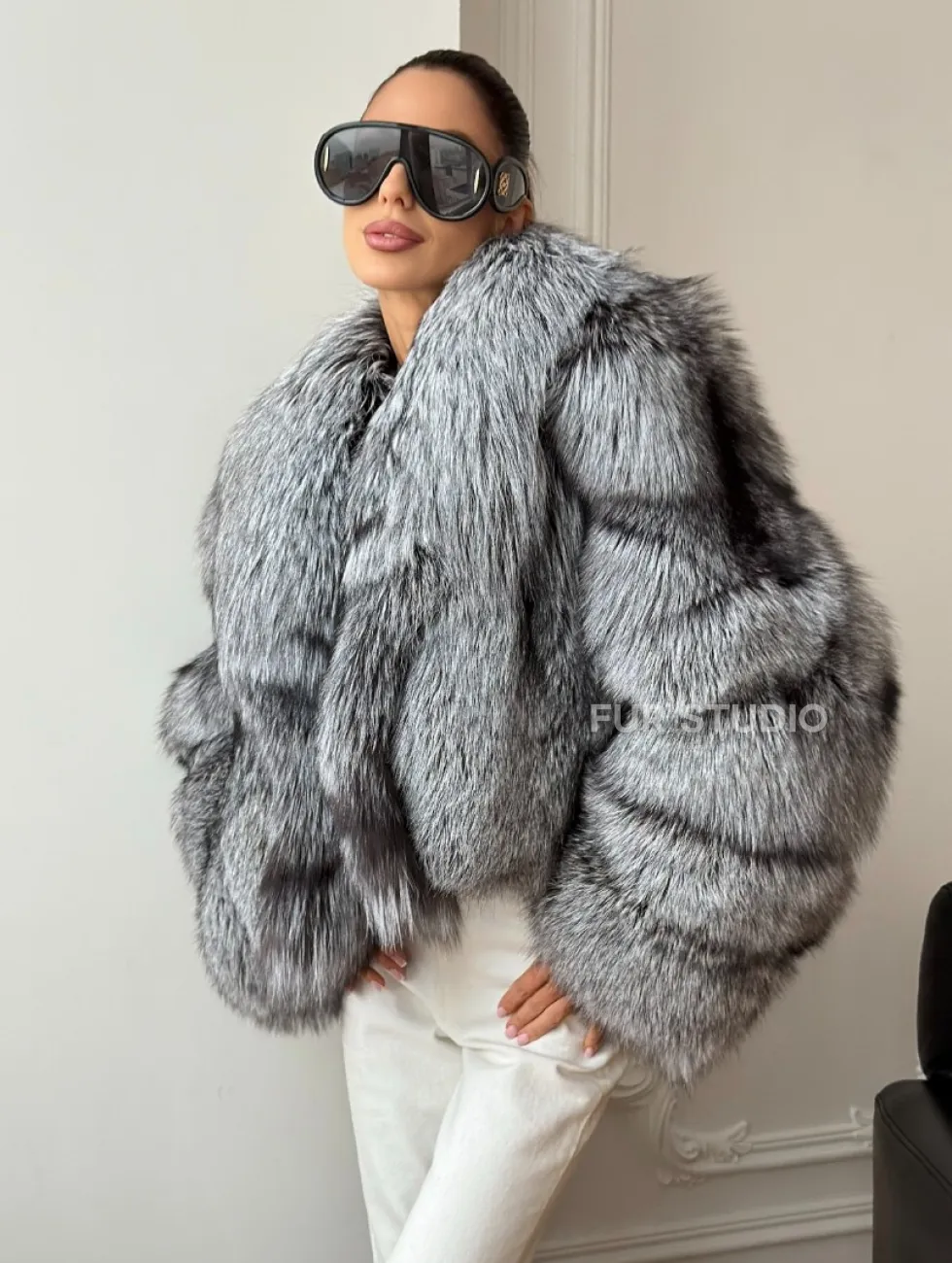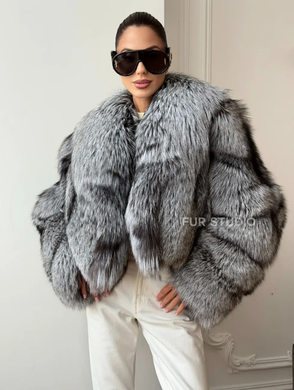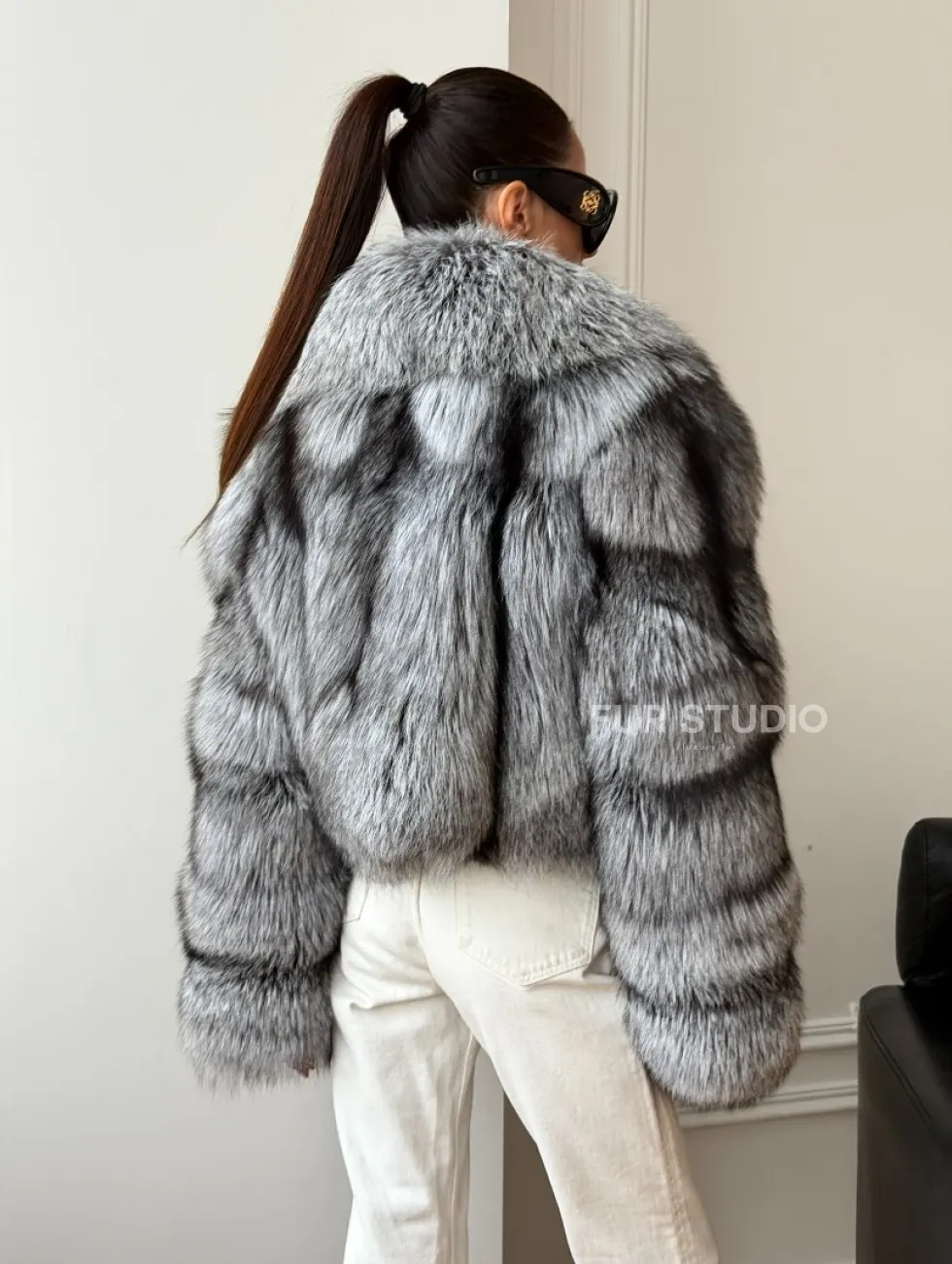 Мех данной шубы лиса, цвет серый. Предлагается в размерах от 42 до 48. Длина модели 50-55 см, что выгодно подчеркивает фигуру девушек. Эта модель идеально подойдет для девушек и женщин, предпочитающих роскошные натуральные меха.