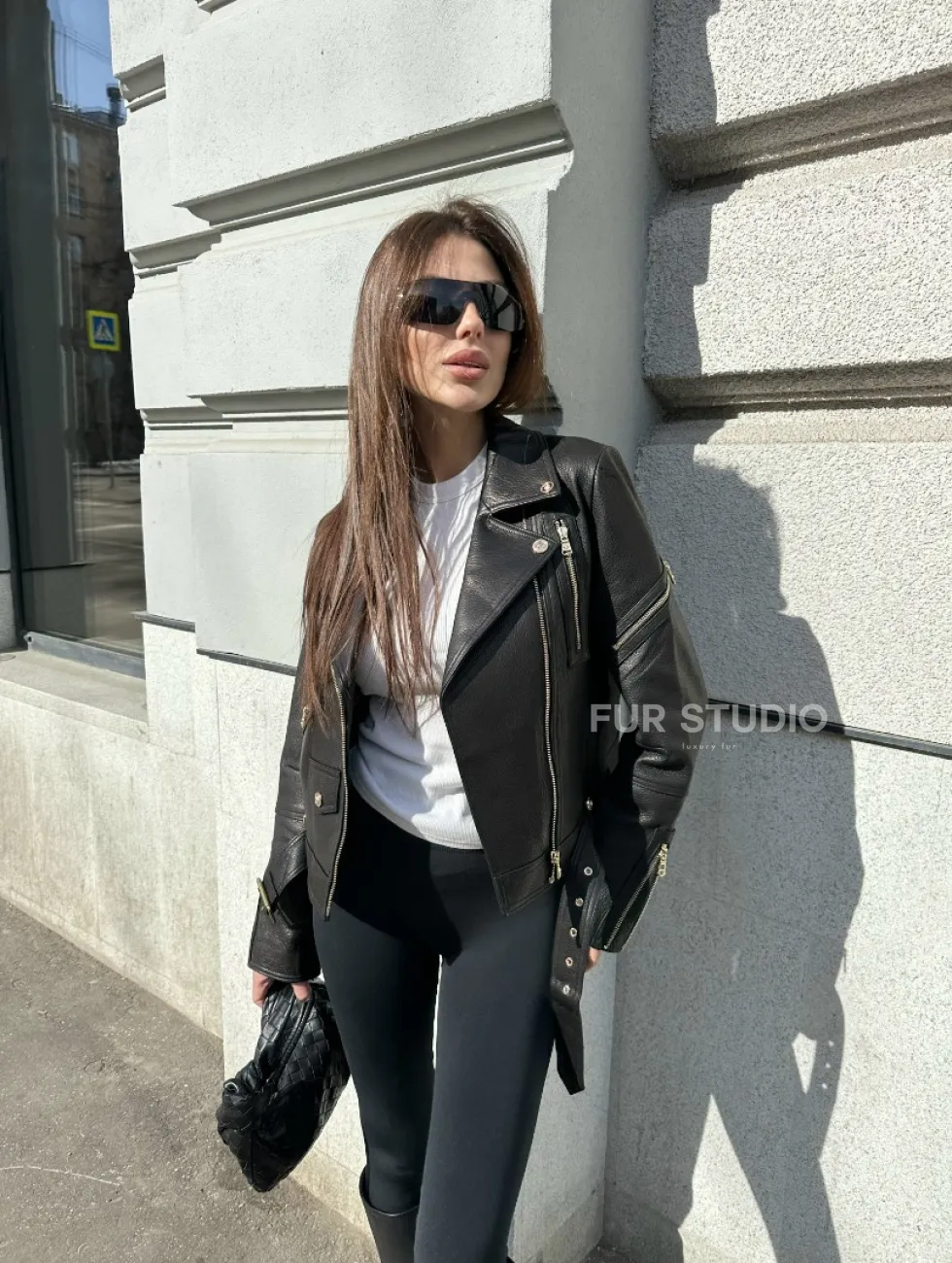 Куртка из натуральной кожи черного цвета доступна для покупки в нашем шоуруме Furs Studio в Чите, где также предоставляется удобная доставка во все города России.