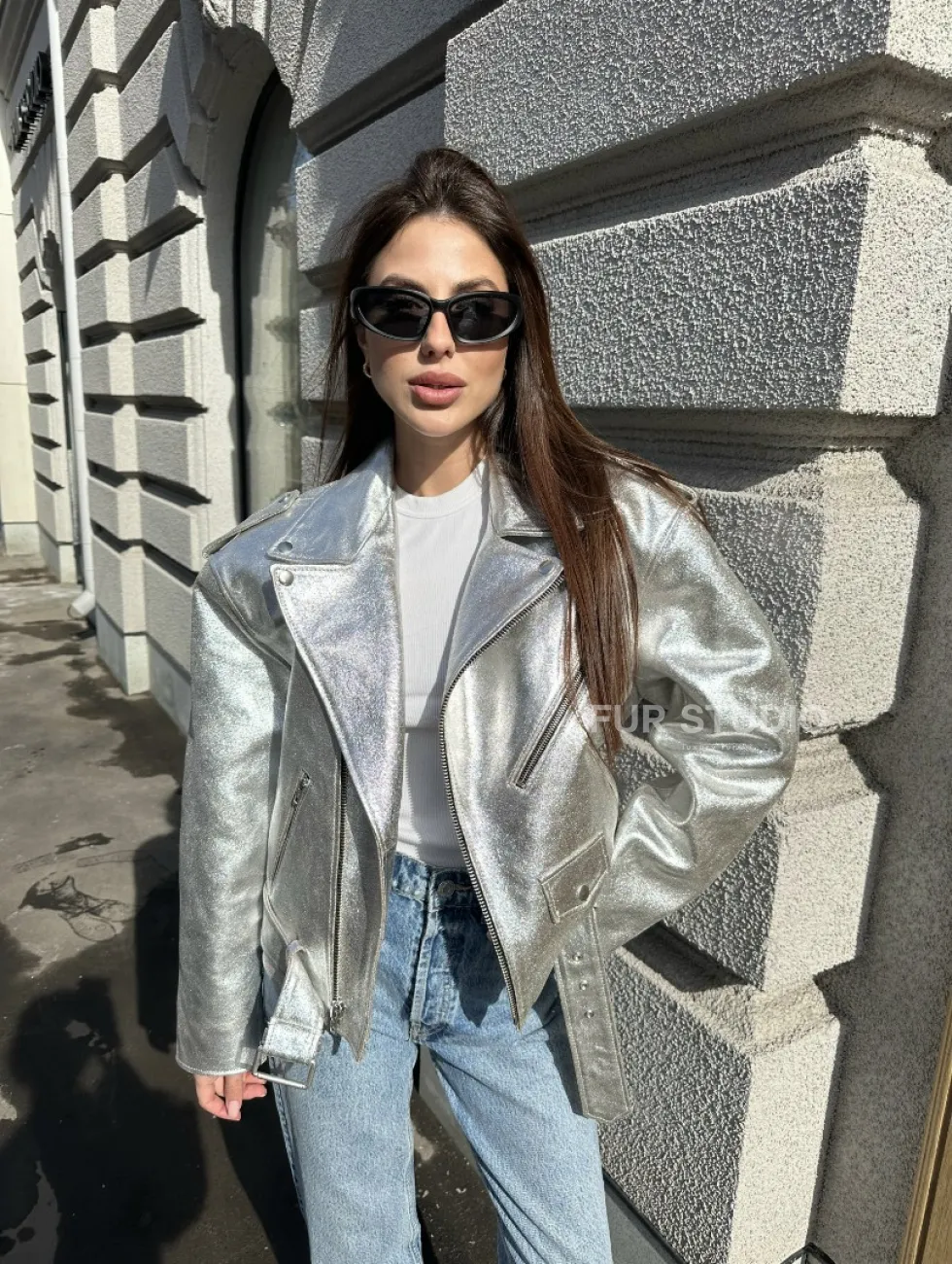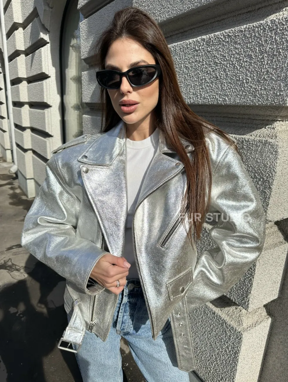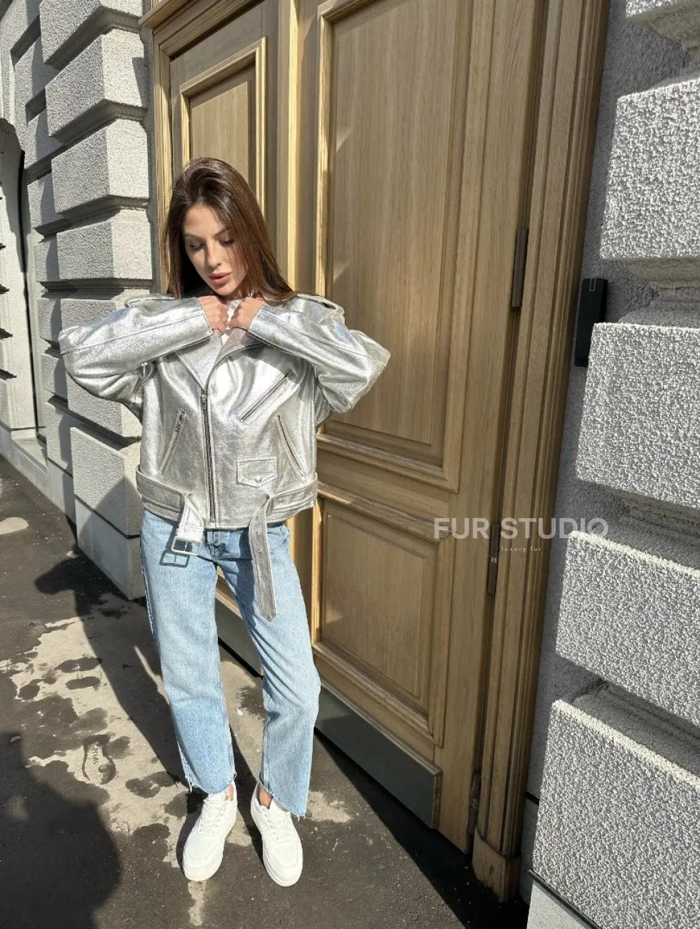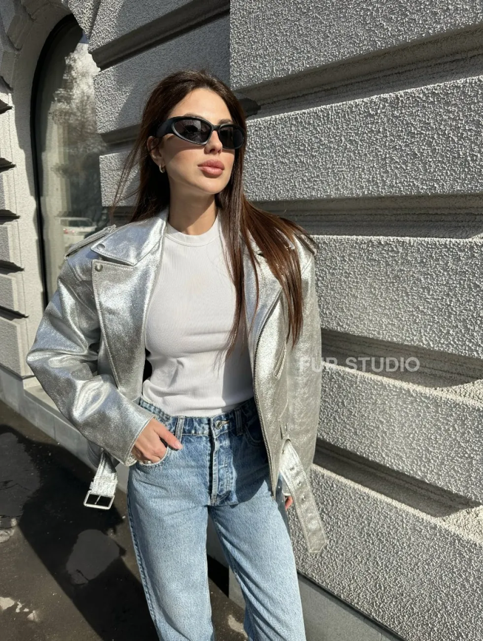 Куртка - косуха из натуральной кожи цвет серебристый доступна для покупки в нашем шоуруме Furs Studio в Чите, где также предоставляется удобная доставка во все города России.