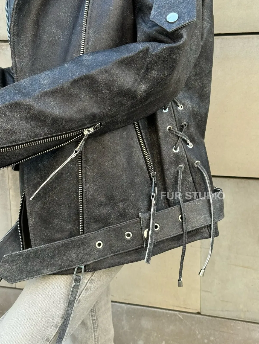 Куртка-косуха винтажная из натуральной кожи со шнуровкой доступна для покупки в нашем шоуруме Furs Studio в Чите, где также предоставляется удобная доставка во все города России.