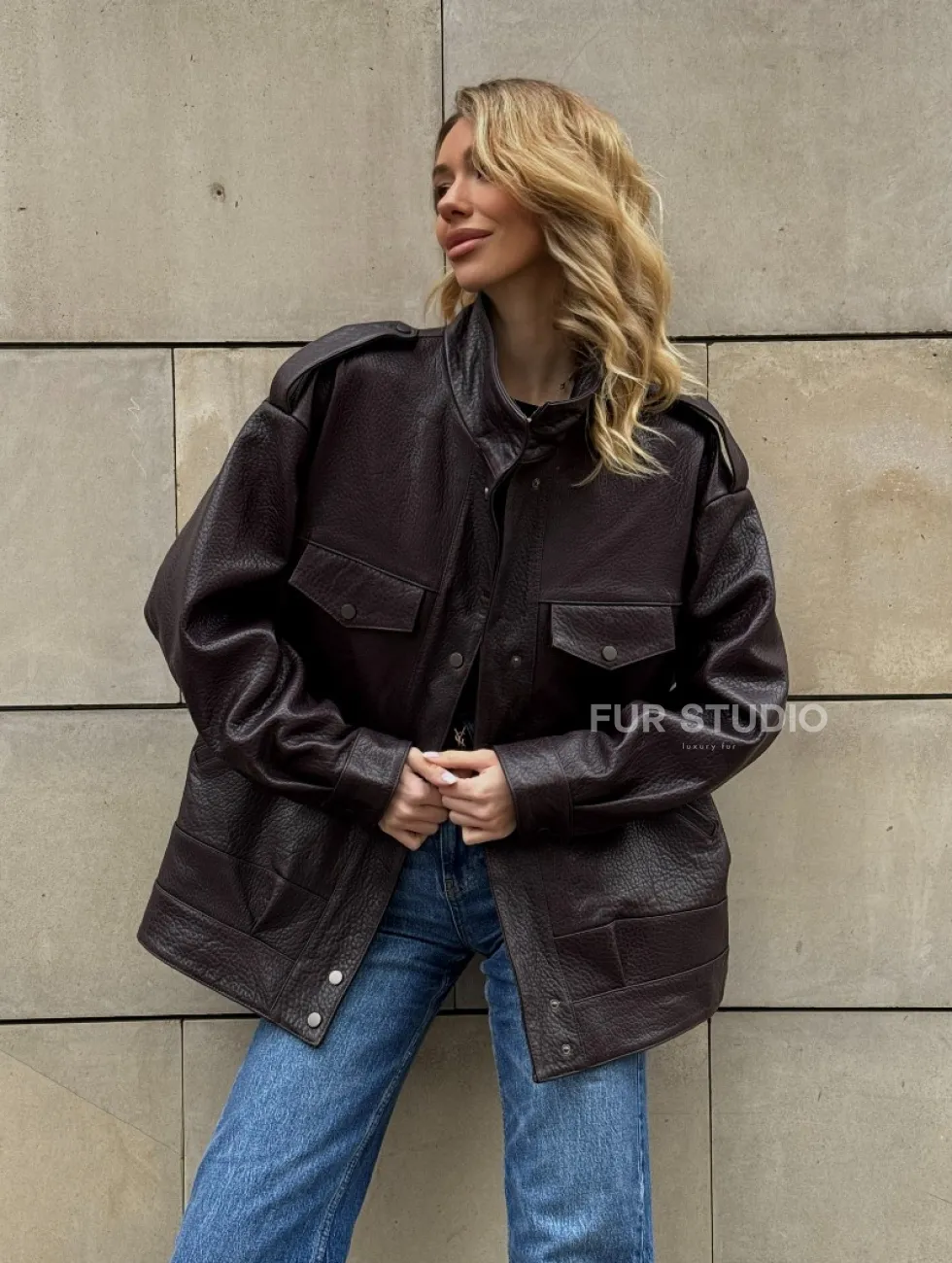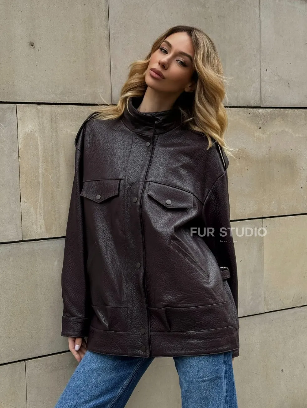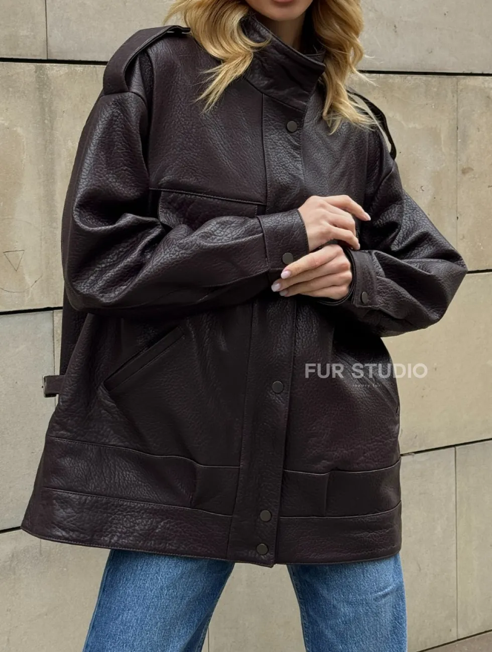 Кутка - бомбер оверсайз из натуральной кожи в стиле Y2K доступна для покупки в нашем шоуруме Furs Studio в Чите, где также предоставляется удобная доставка во все города России.