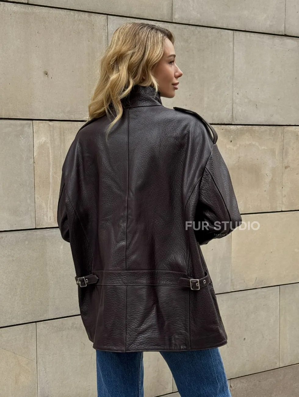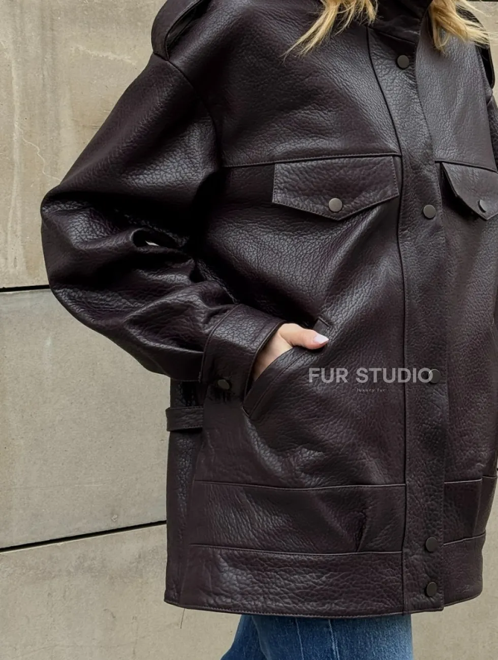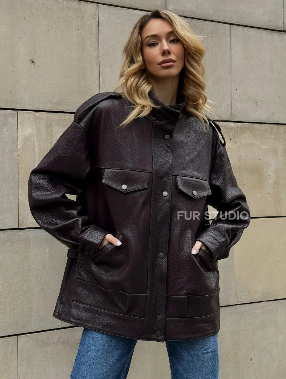 Кутка - бомбер оверсайз из натуральной кожи в стиле Y2K доступна для покупки в нашем шоуруме Furs Studio в Чите, где также предоставляется удобная доставка во все города России.