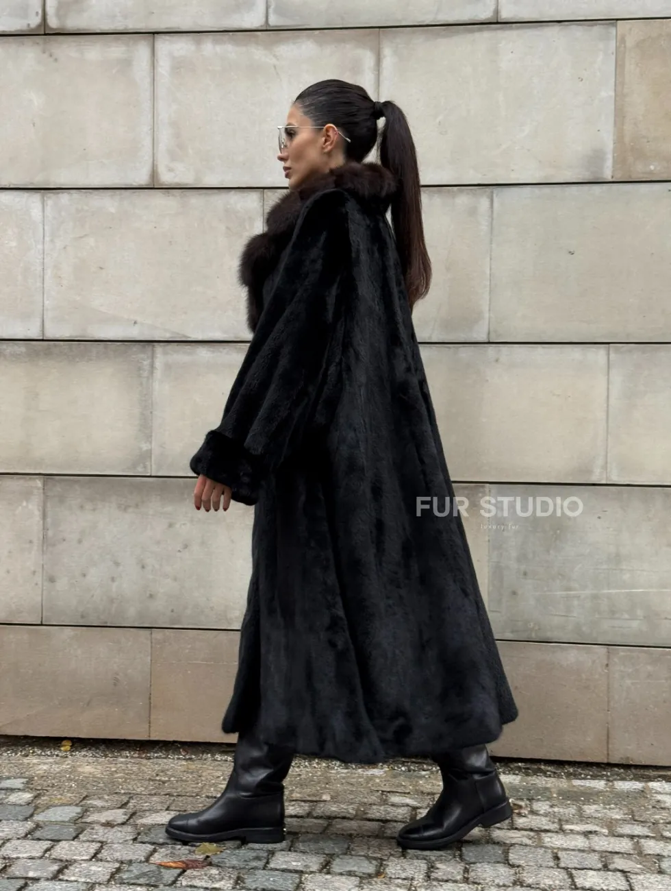 Мех данной шубы скандинавская норка, цвет черный. Предлагается в размерах от 42 до 50. Длина модели 125-130 см, что выгодно подчеркивает фигуру девушек. Эта модель идеально подойдет для девушек и женщин, предпочитающих роскошные натуральные меха.