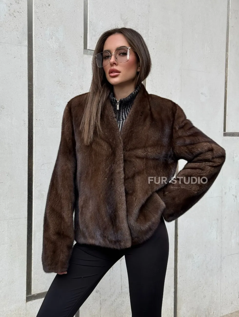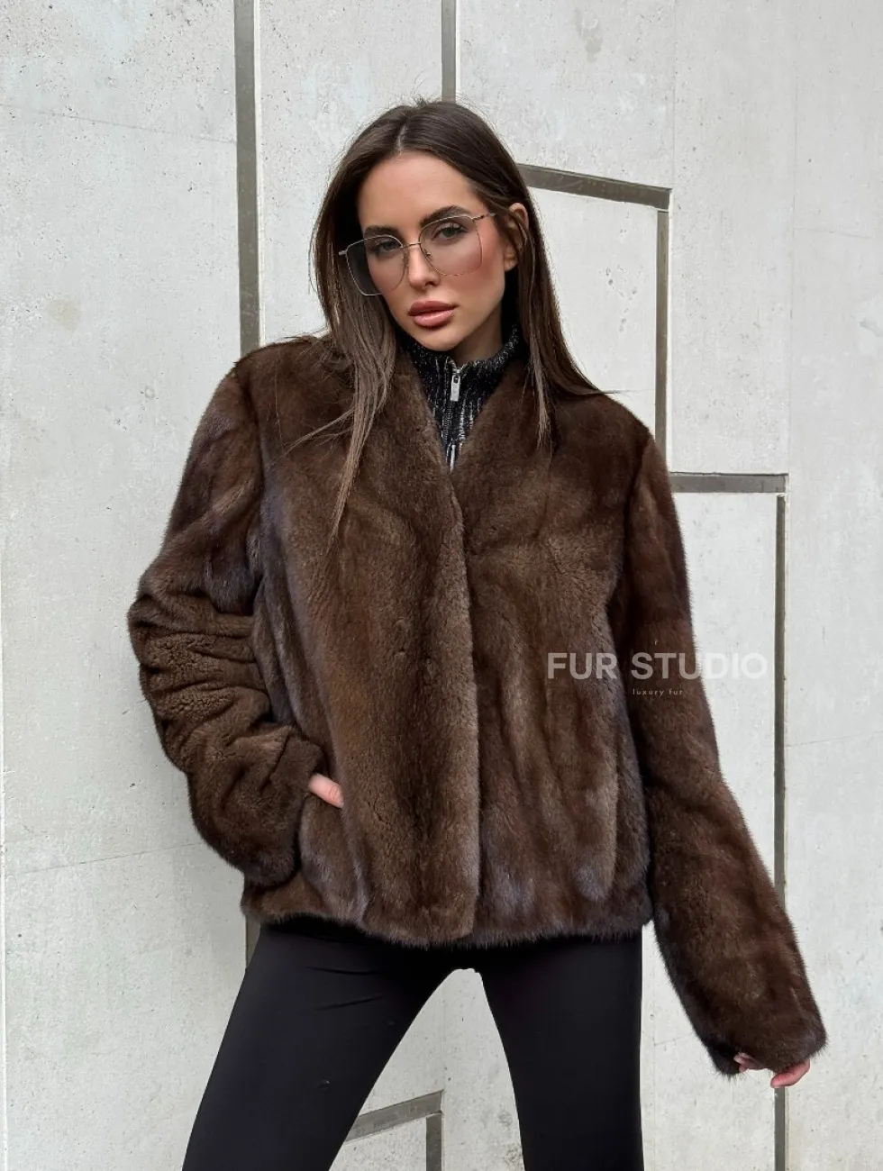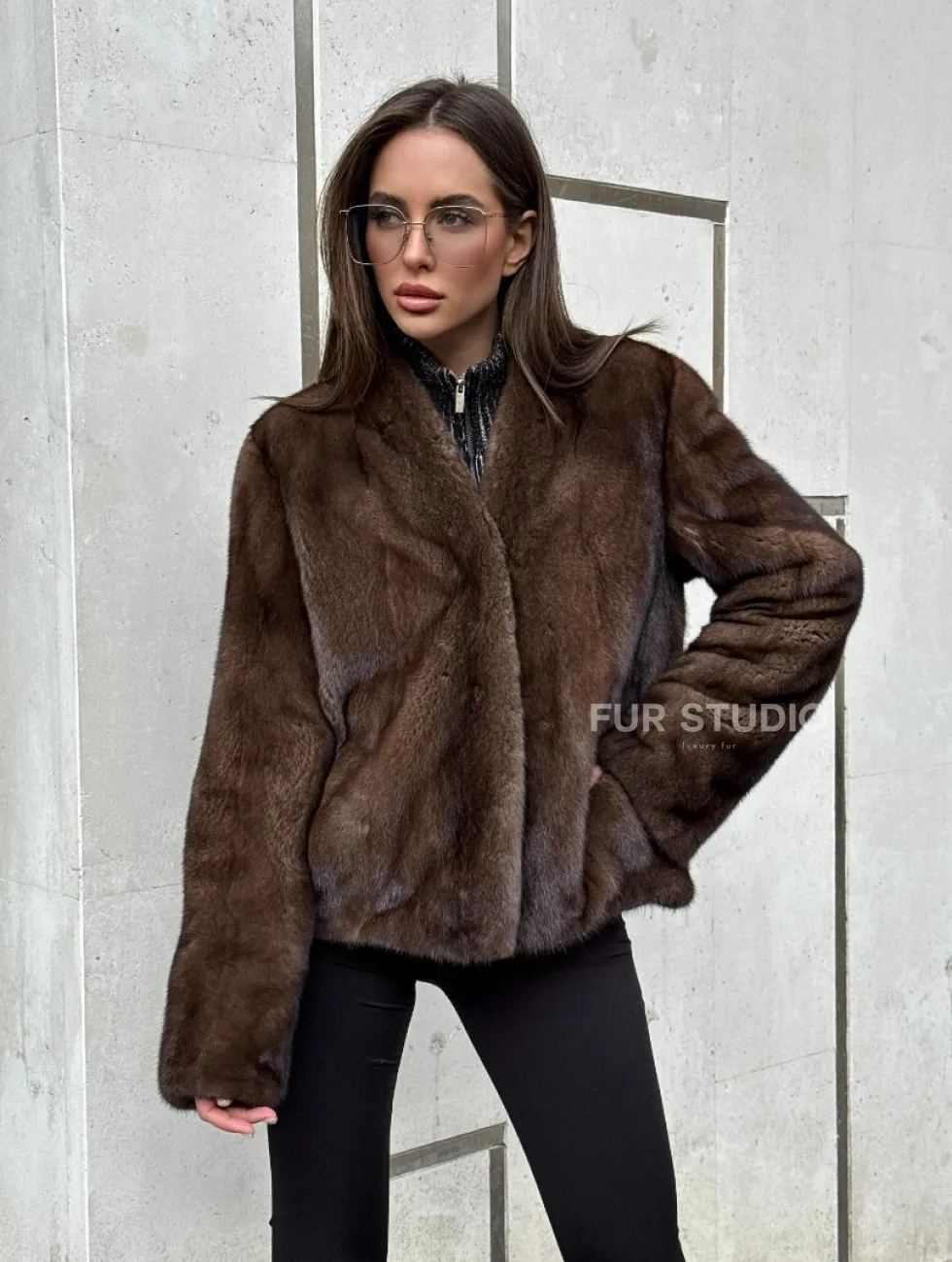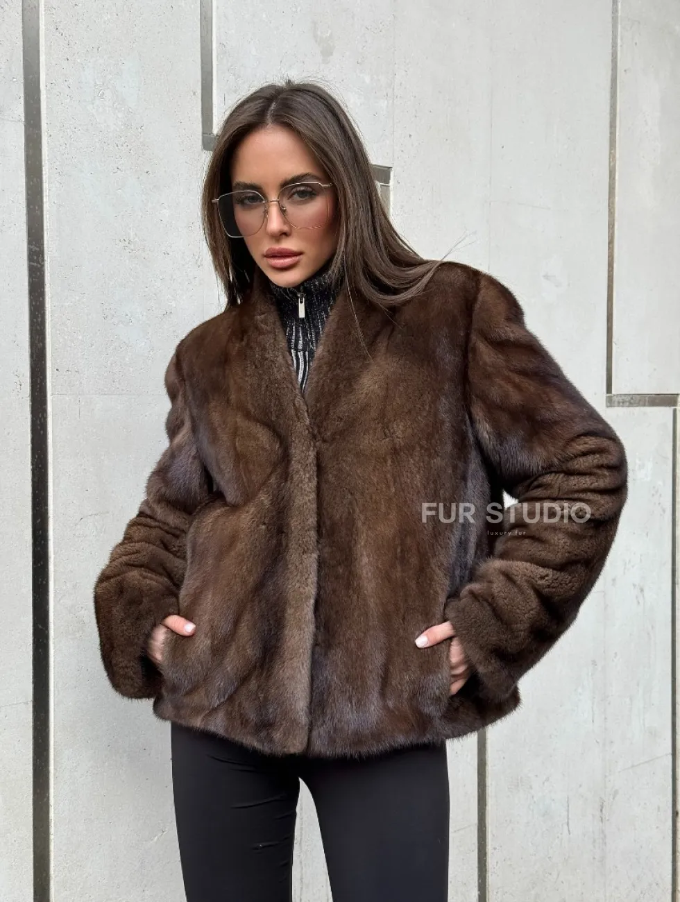 Меховой кроп - жакет из норки цвета соболь с V-образным воротником доступна для покупки в нашем шоуруме Furs Studio в Чите. У нас так же есть доставка во все города России. Добавьте немного роскоши в свой гардероб с этой шубой, которая будет служить вам многие годы.