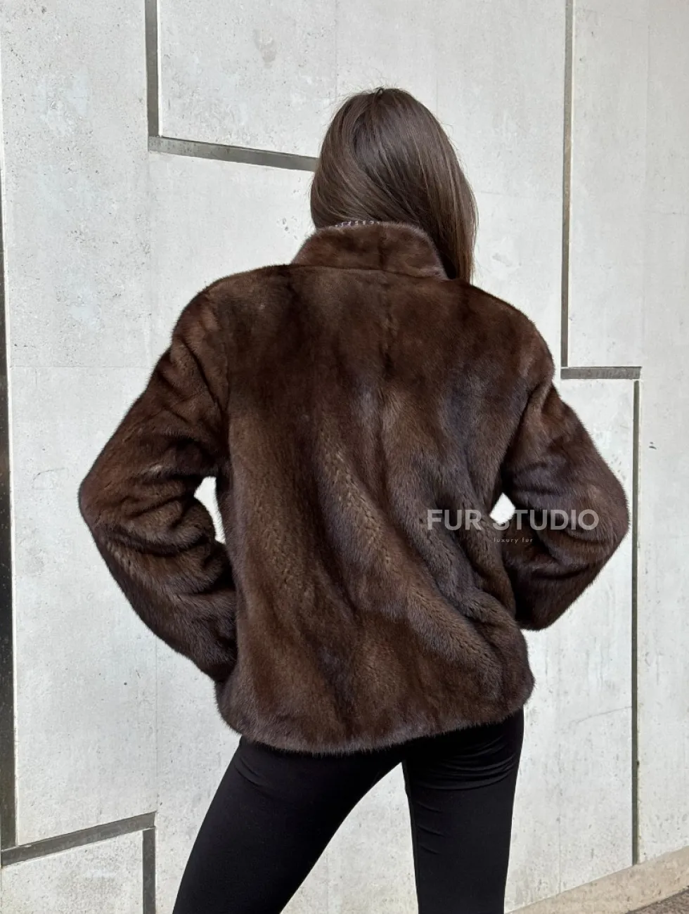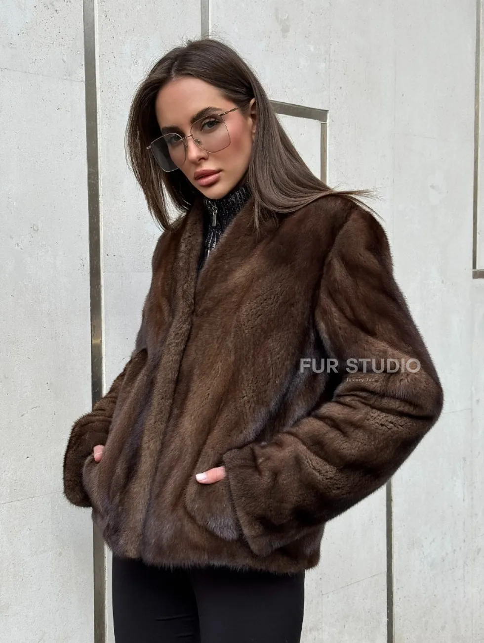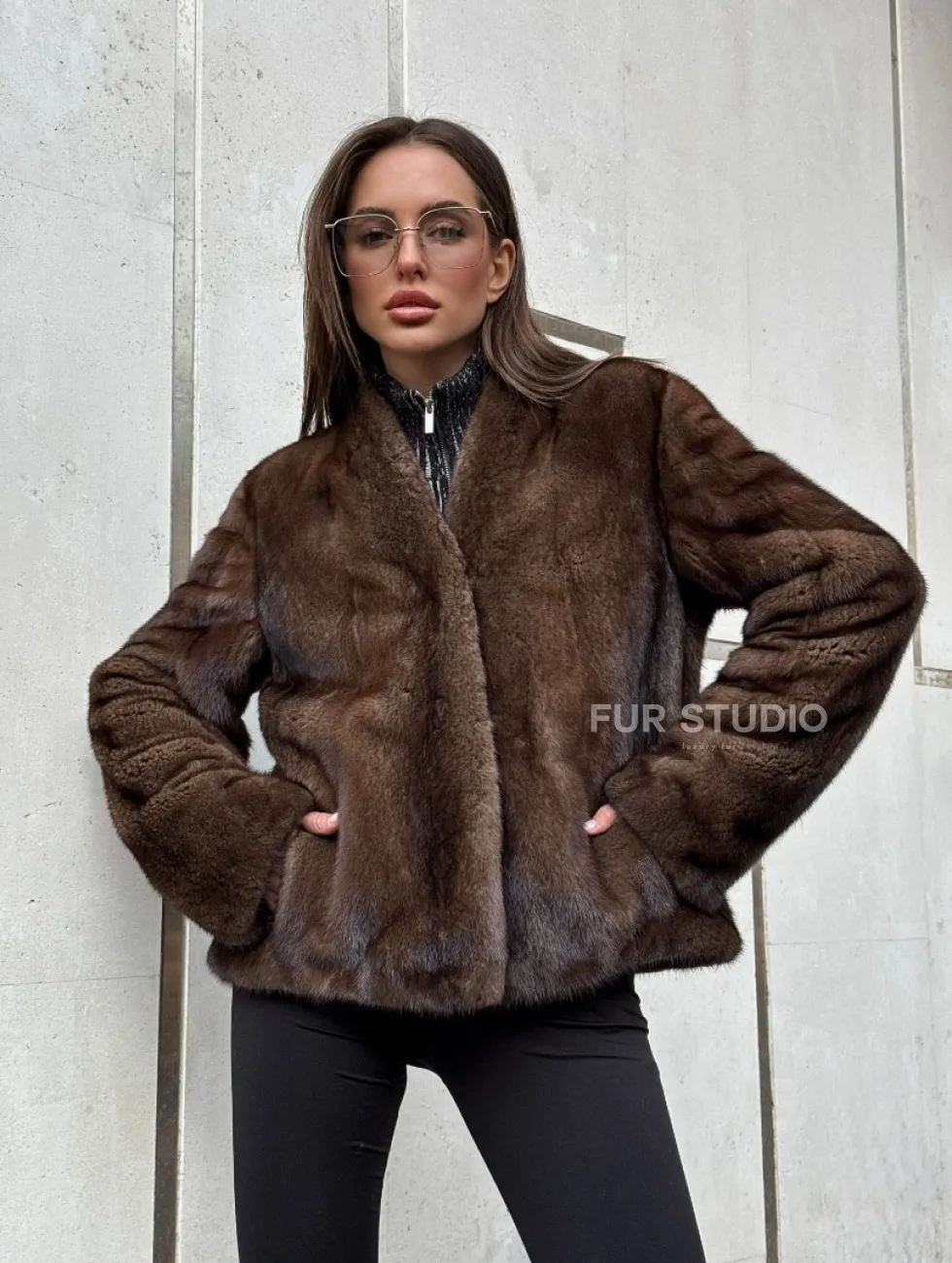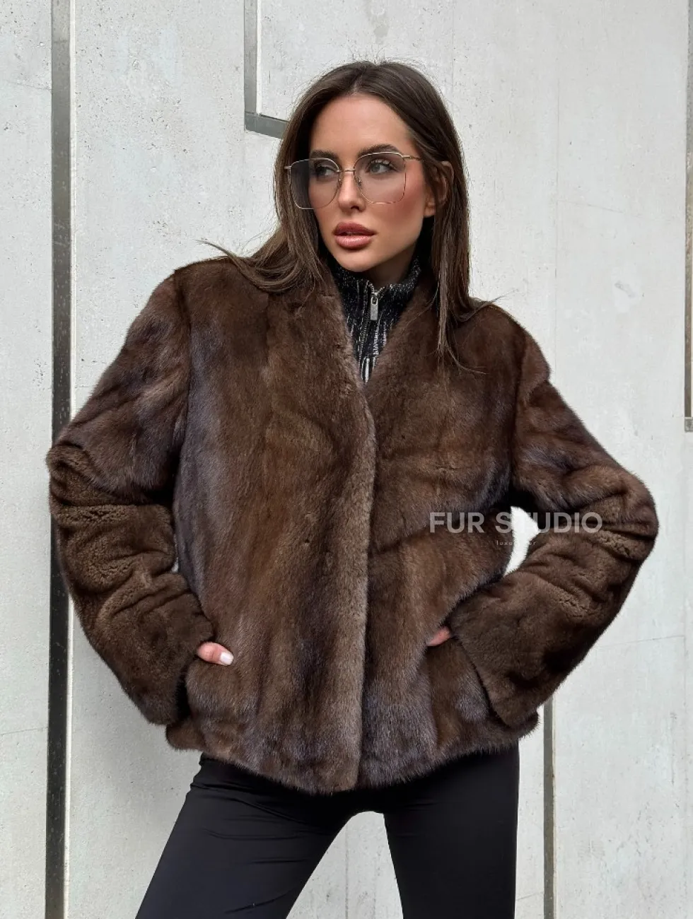 Меховой кроп - жакет из норки цвета соболь с V-образным воротником доступна для покупки в нашем шоуруме Furs Studio в Чите. У нас так же есть доставка во все города России. Добавьте немного роскоши в свой гардероб с этой шубой, которая будет служить вам многие годы.