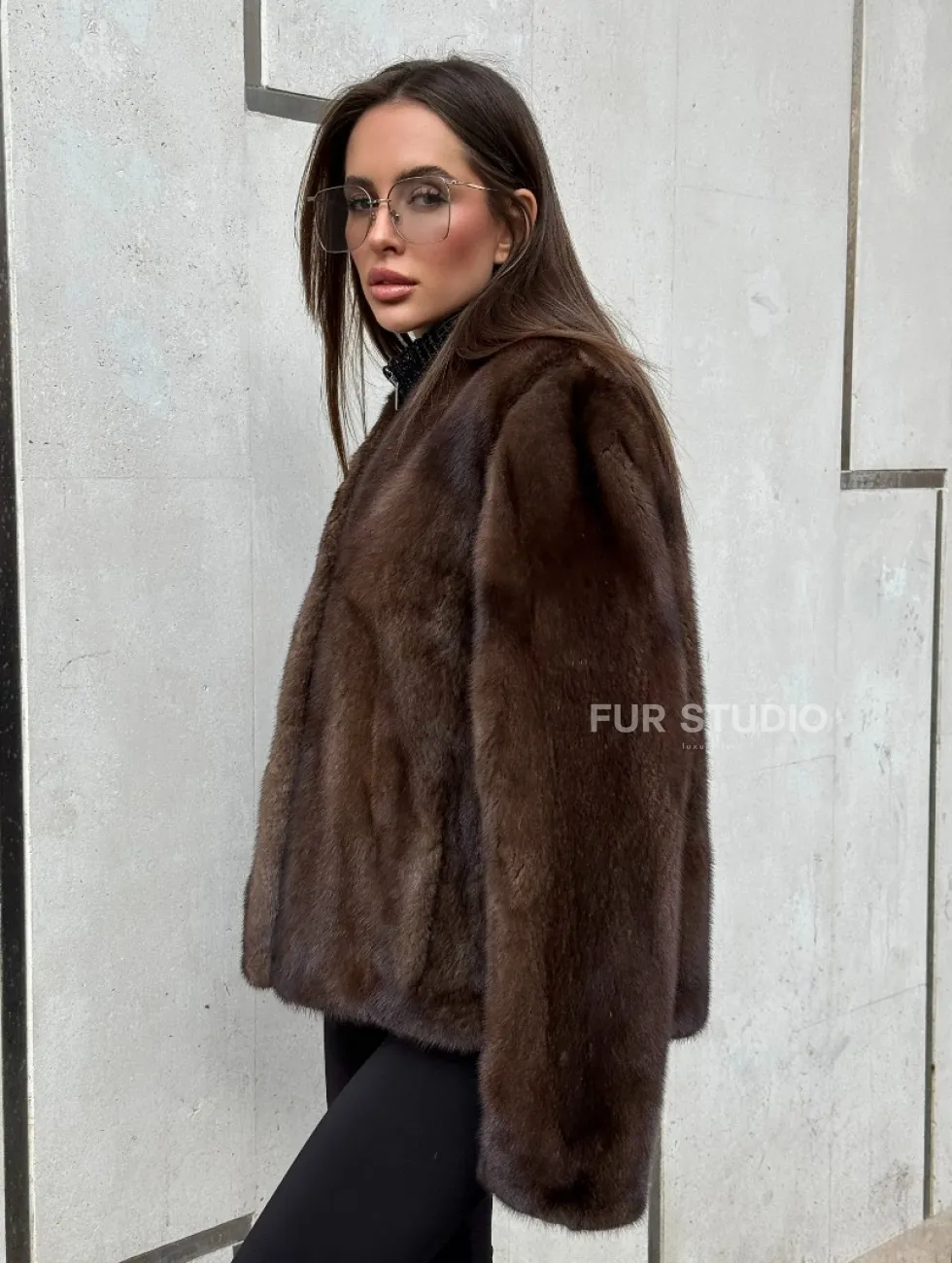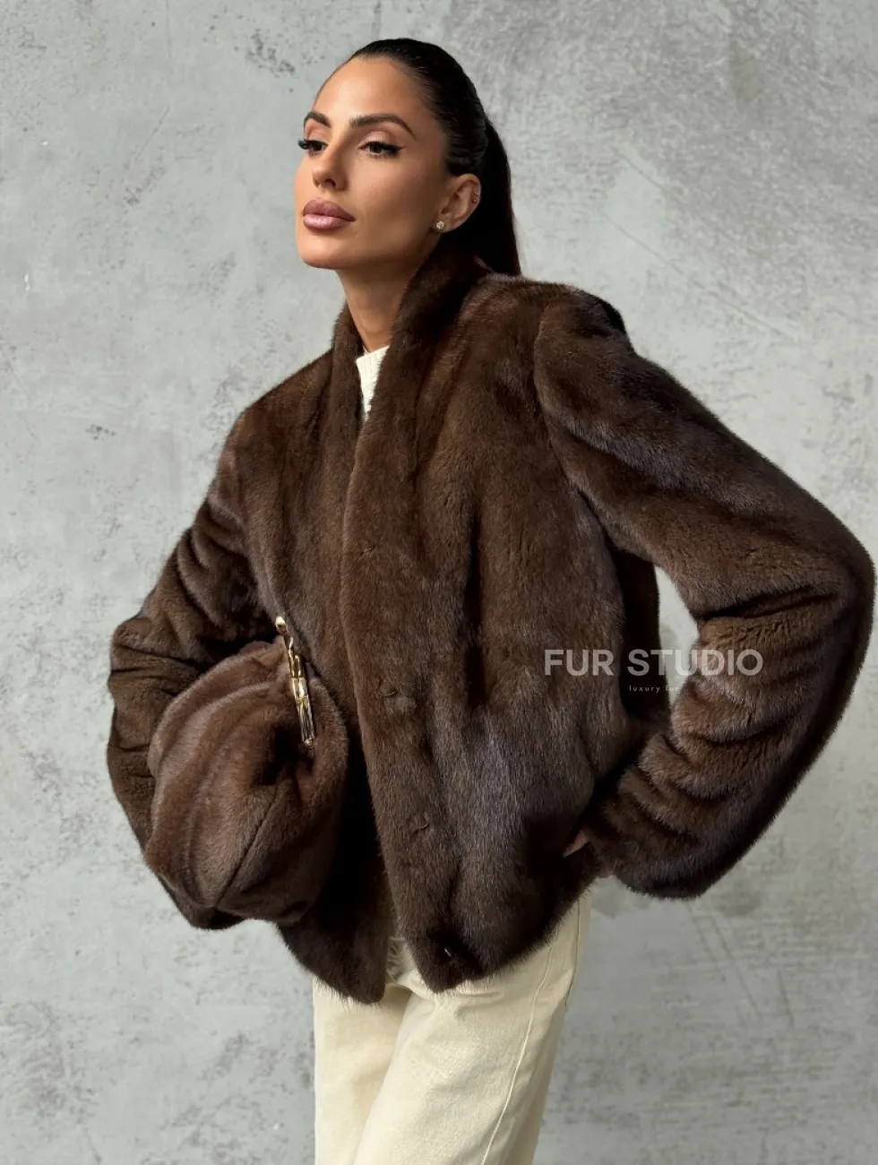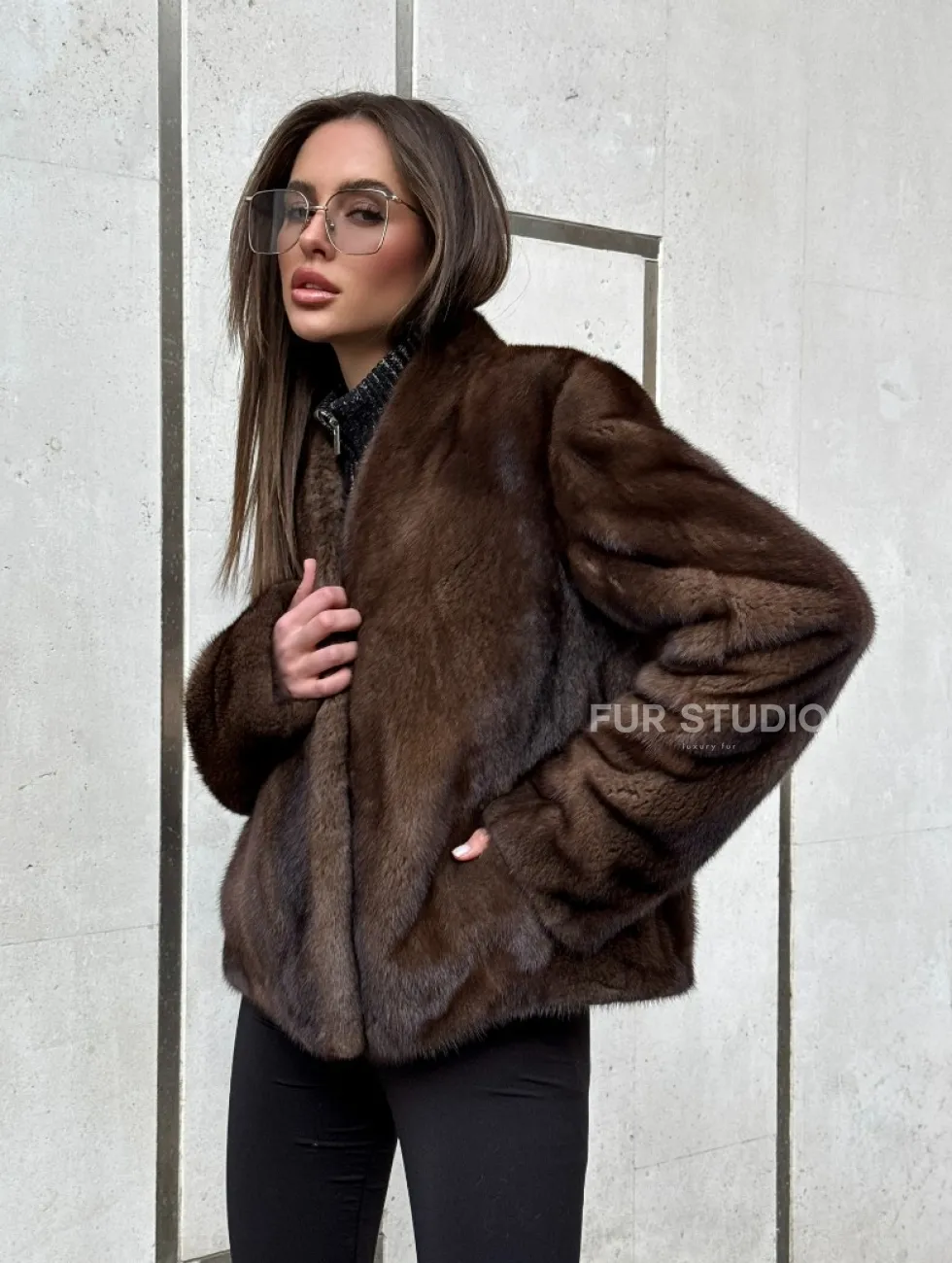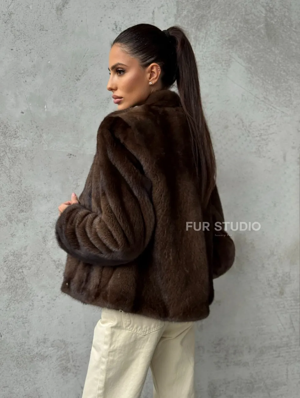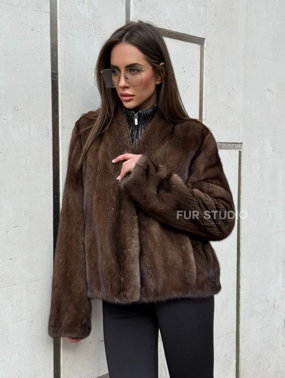 Меховой кроп - жакет из норки цвета соболь с V-образным воротником доступна для покупки в нашем шоуруме Furs Studio в Чите. У нас так же есть доставка во все города России. Добавьте немного роскоши в свой гардероб с этой шубой, которая будет служить вам многие годы.