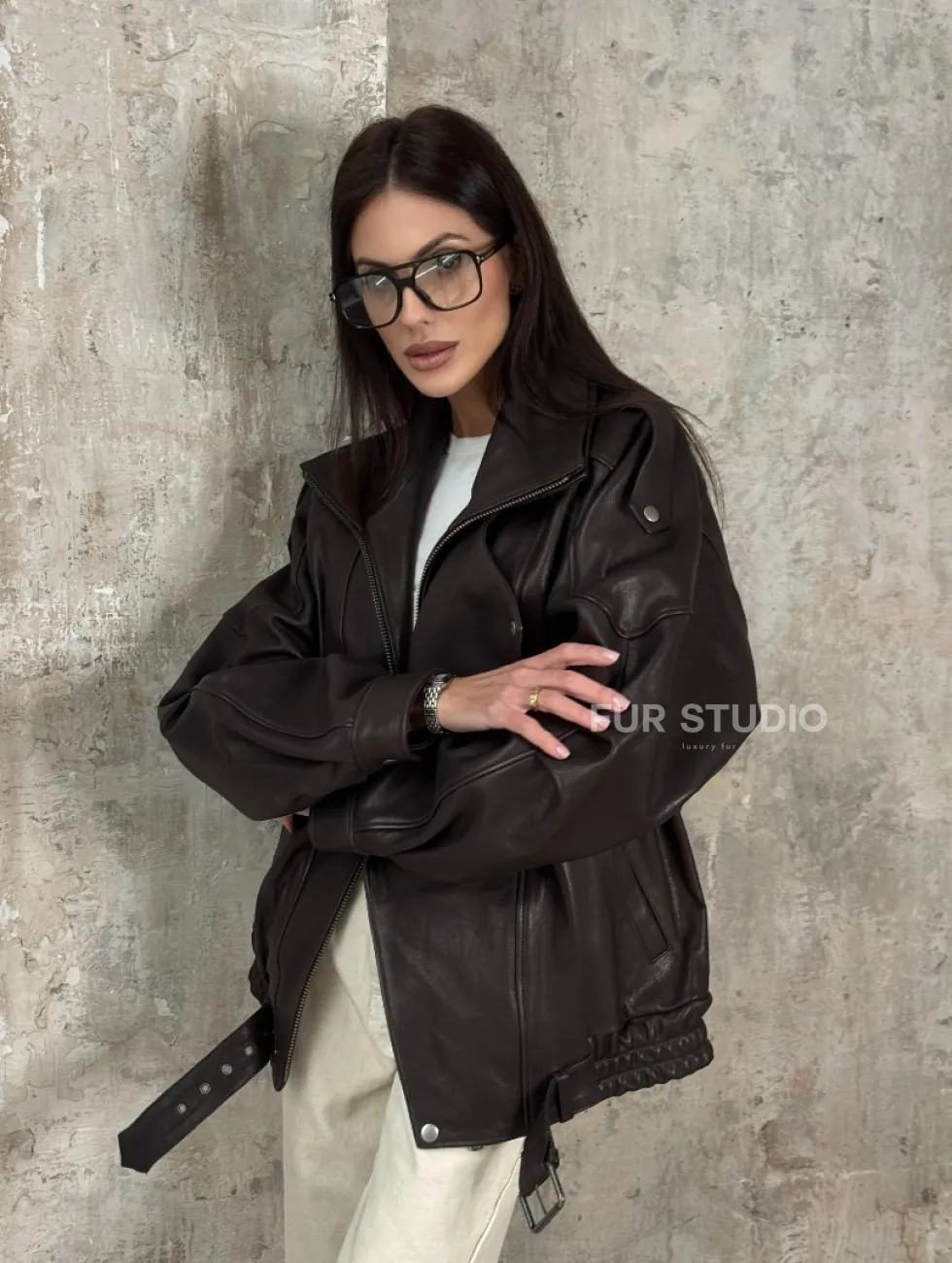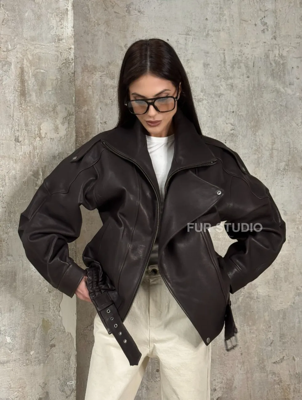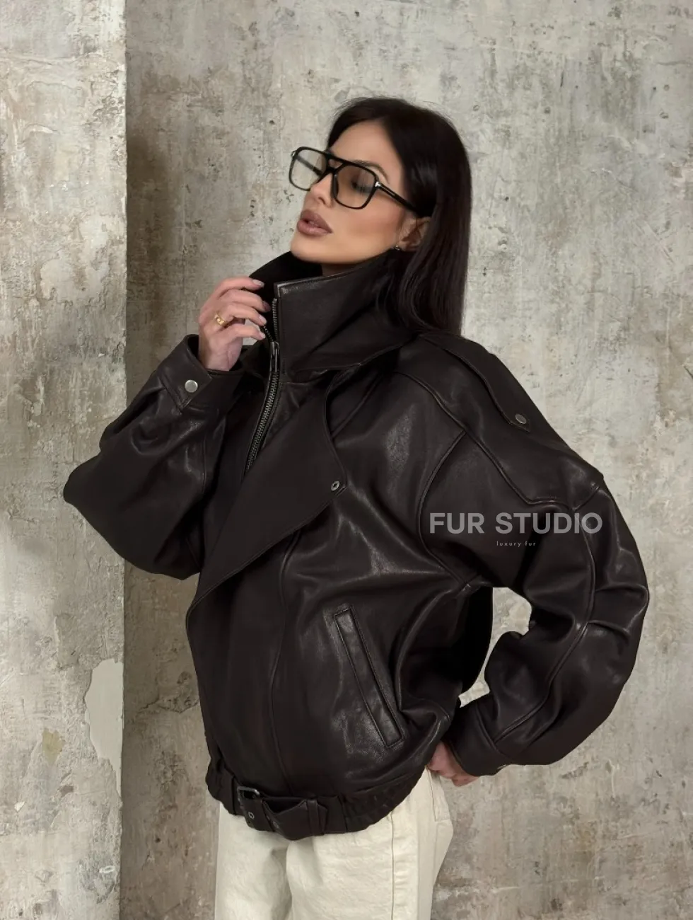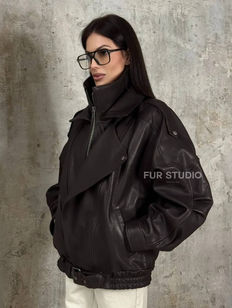 Модная кожаная куртка - бомбер на резинке из натуральной гладкой кожи доступна для покупки в нашем шоуруме Furs Studio в Чите, где также предоставляется удобная доставка во все города России.
