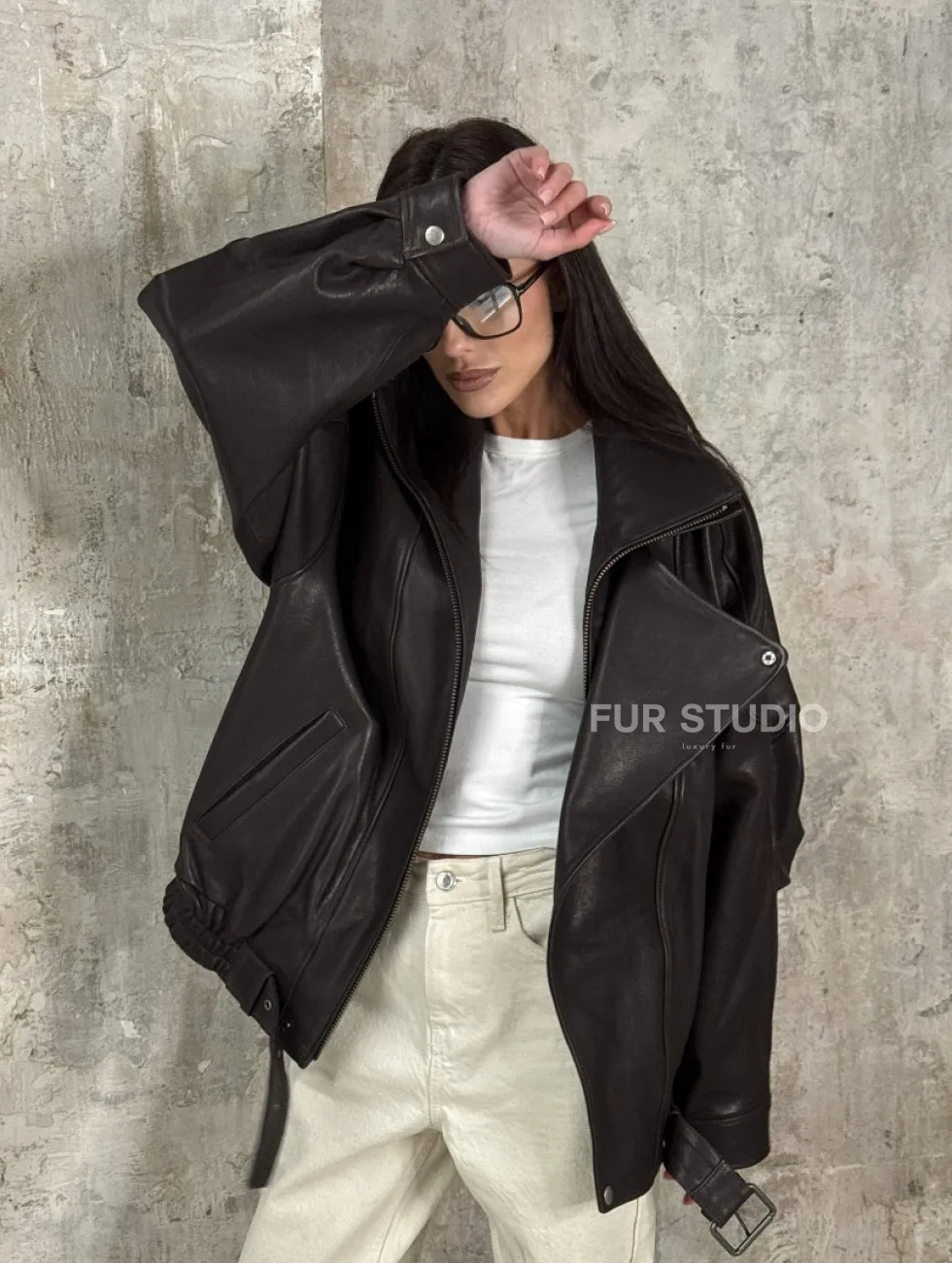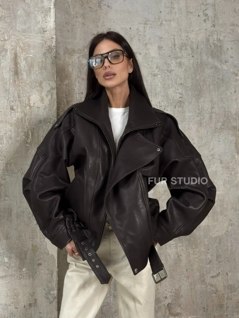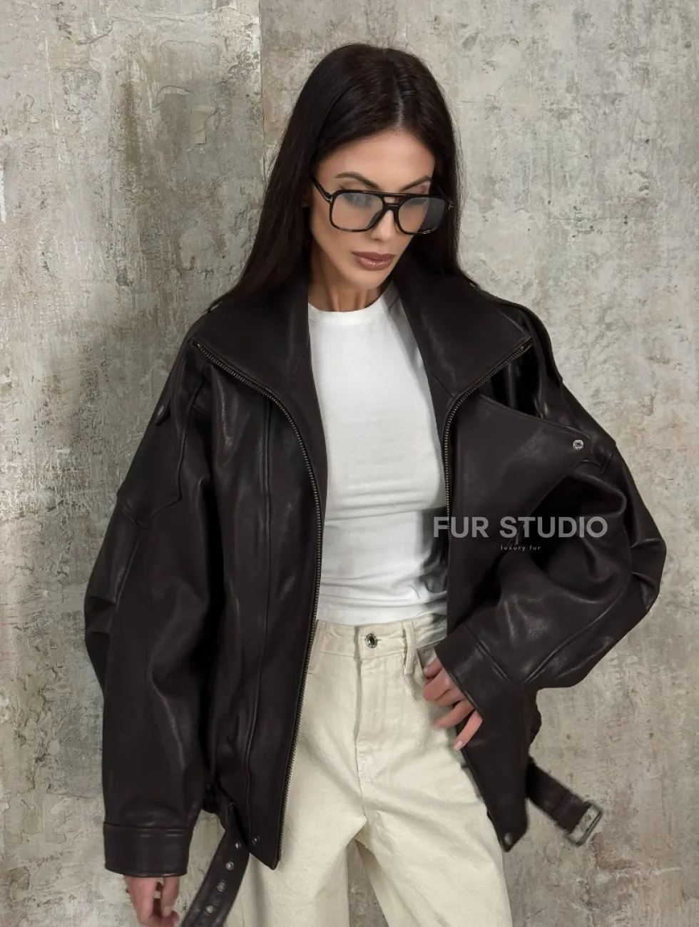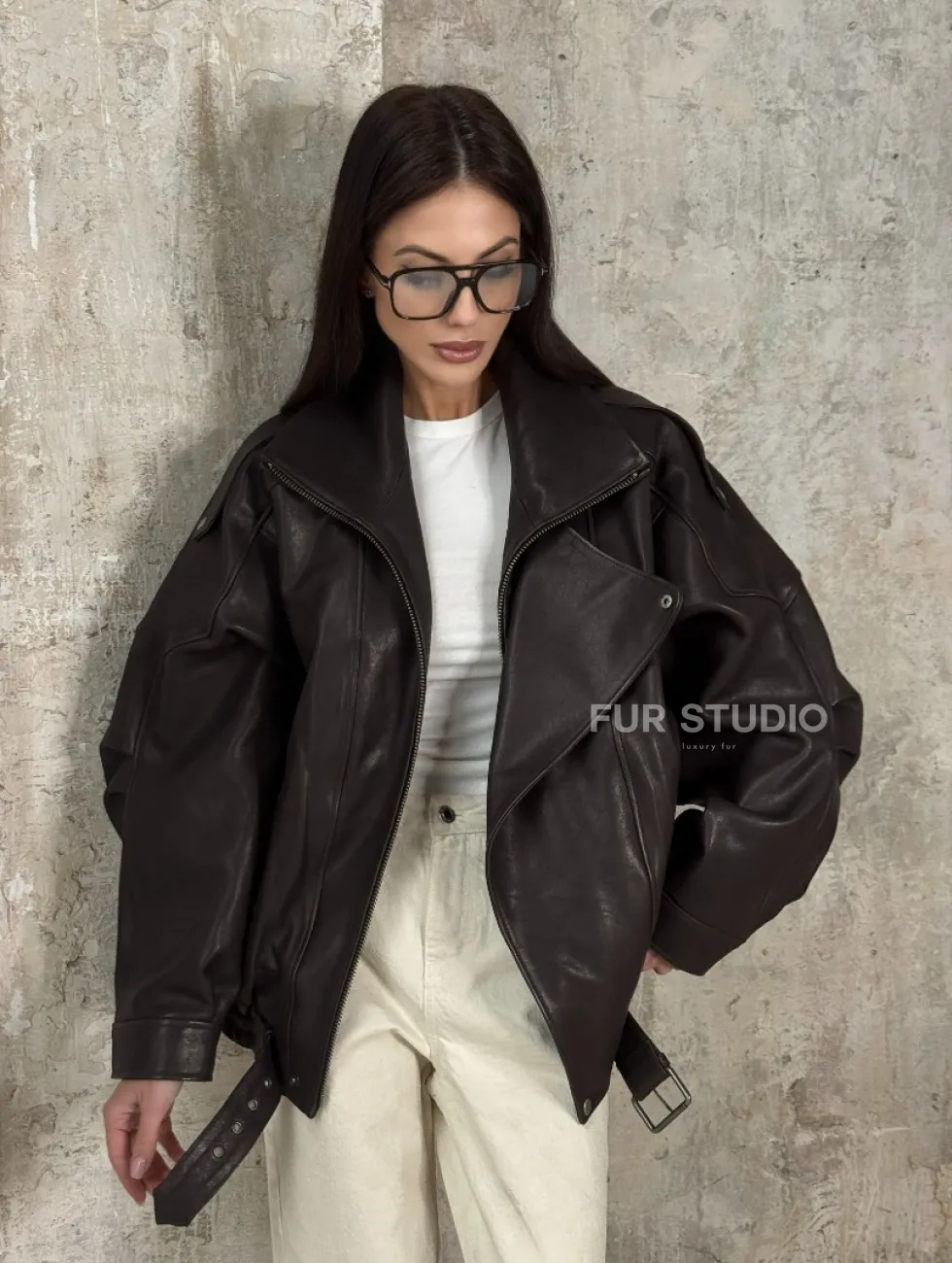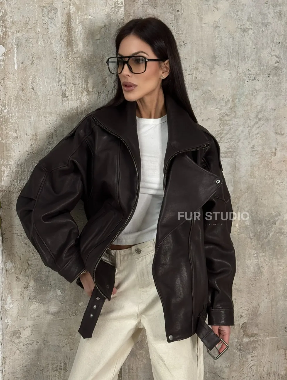 Модная кожаная куртка - бомбер на резинке из натуральной гладкой кожи доступна для покупки в нашем шоуруме Furs Studio в Чите, где также предоставляется удобная доставка во все города России.