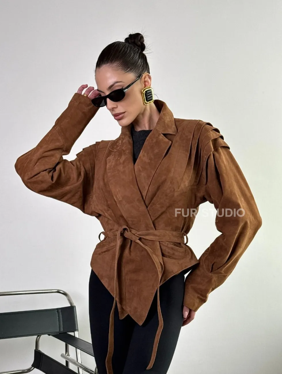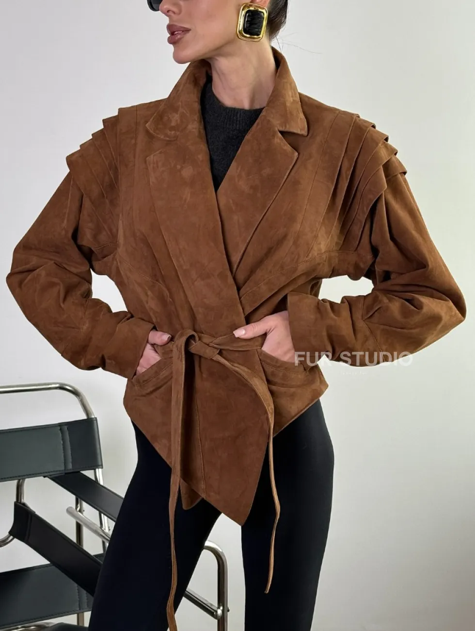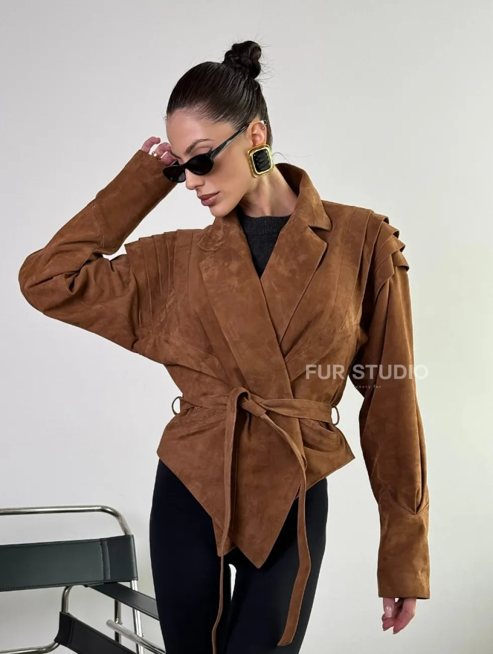 Модная приталенная куртка с плечиками - крылышками из замши Camel доступна для покупки в нашем шоуруме Furs Studio в Чите, где также предоставляется удобная доставка во все города России.