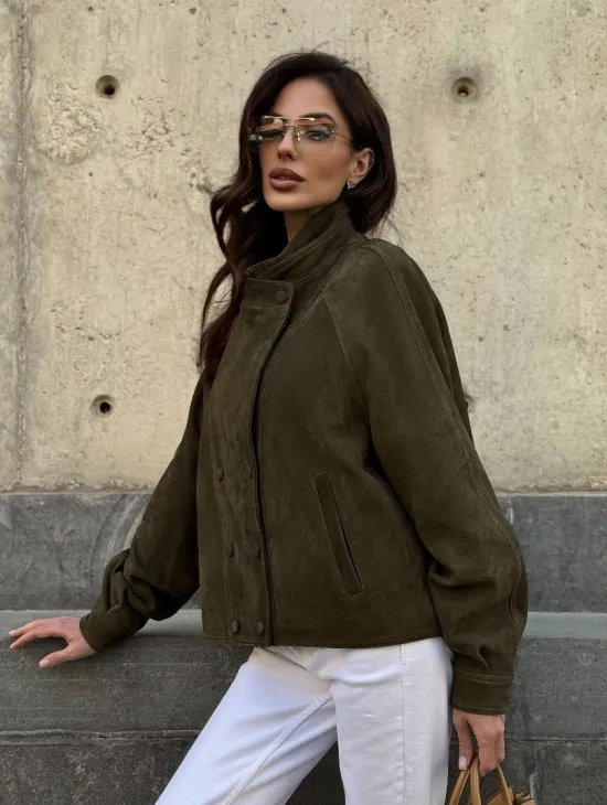 Модная винтажная универсальная укороченная куртка-бомбер из натуральной кожи (замши) доступна для покупки в нашем шоуруме Furs Studio в Чите, где также предоставляется удобная доставка во все города России.