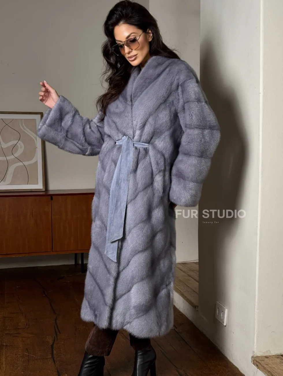 Мех данной шубы аукционная норка, цвет голубой. Предлагается в размерах от 42 до 48. Длина модели 115-120 см, что выгодно подчеркивает фигуру девушек. Эта модель идеально подойдет для девушек и женщин, предпочитающих роскошные натуральные меха.