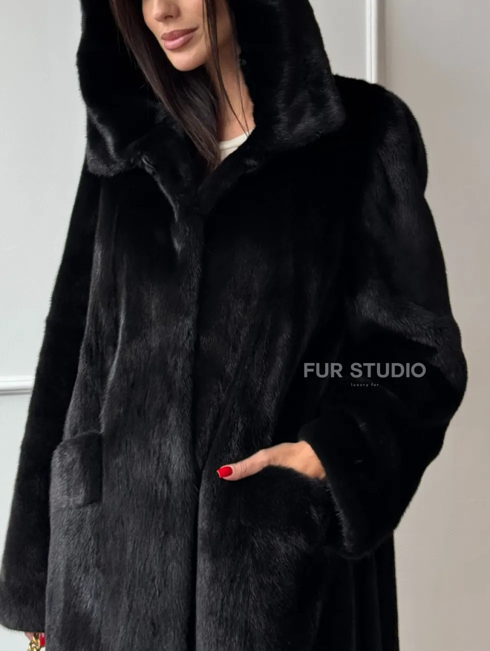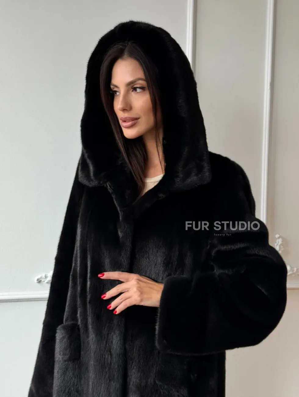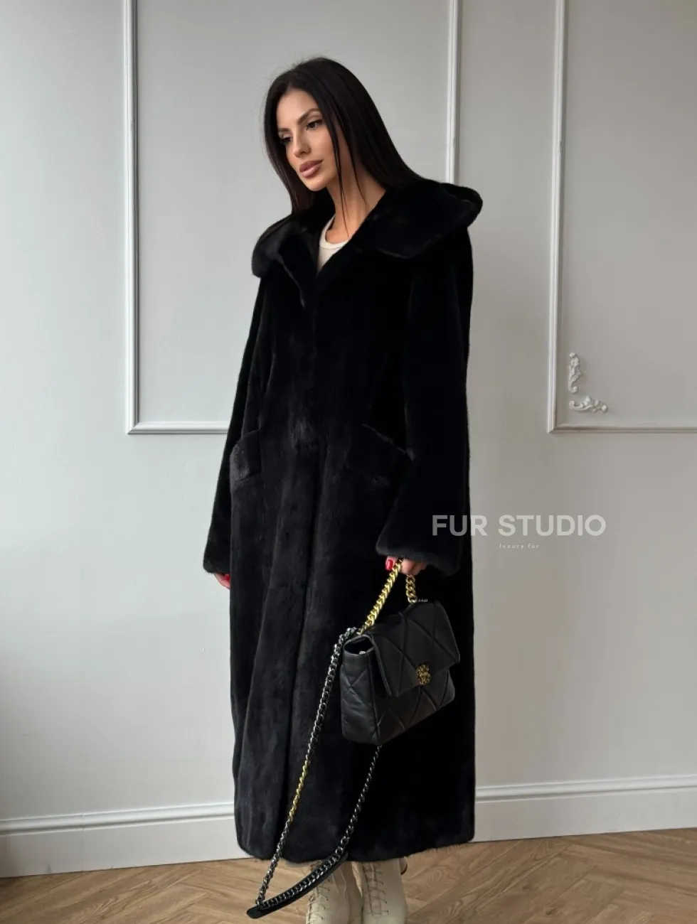 Натуральная черная женская шуба из меха норки Blackglama с капюшоном доступна для покупки в нашем шоуруме Furs Studio в Чите. У нас так же есть доставка во все города России. Добавьте немного роскоши в свой гардероб с этой шубой, которая будет служить вам многие годы.