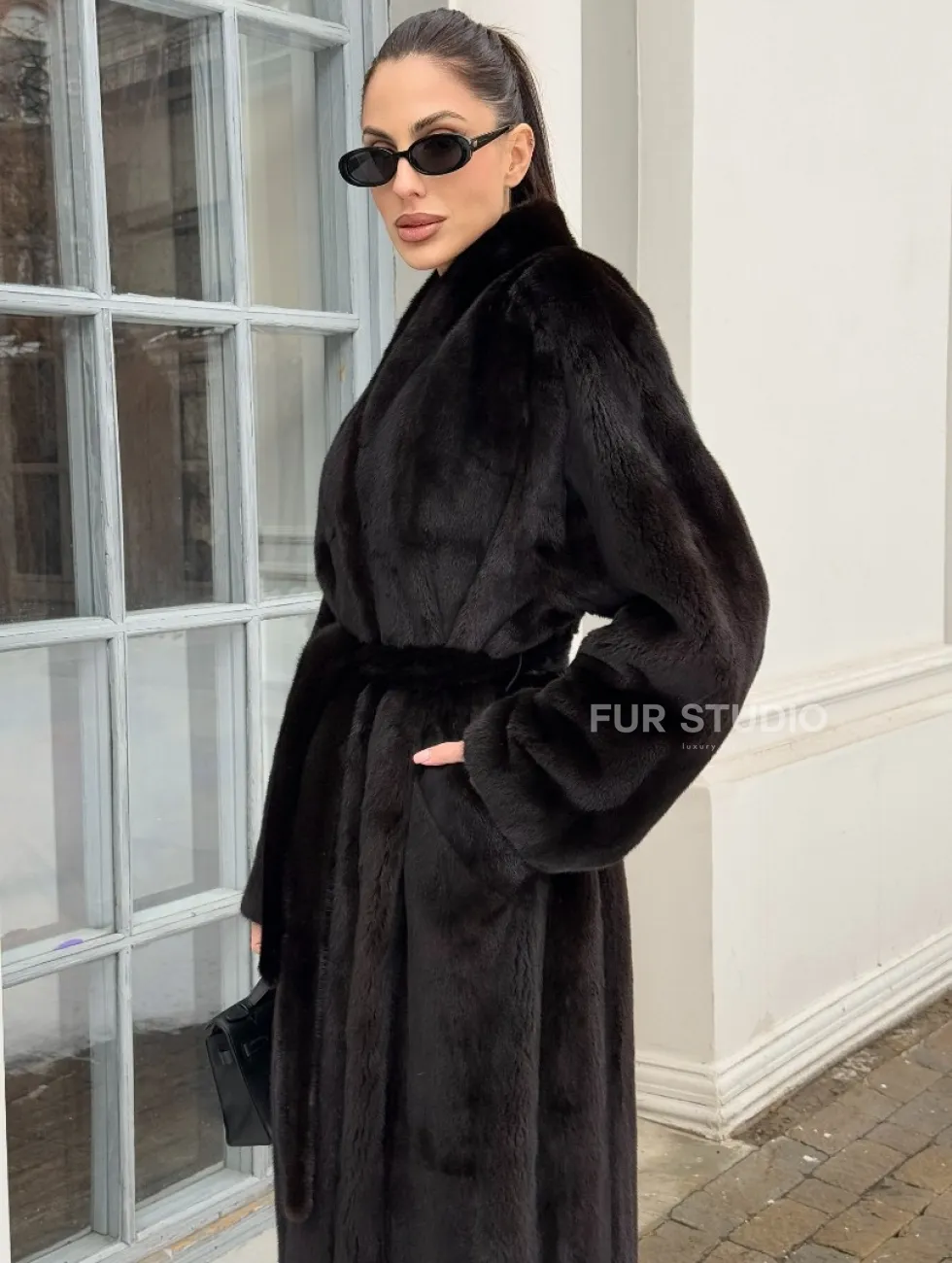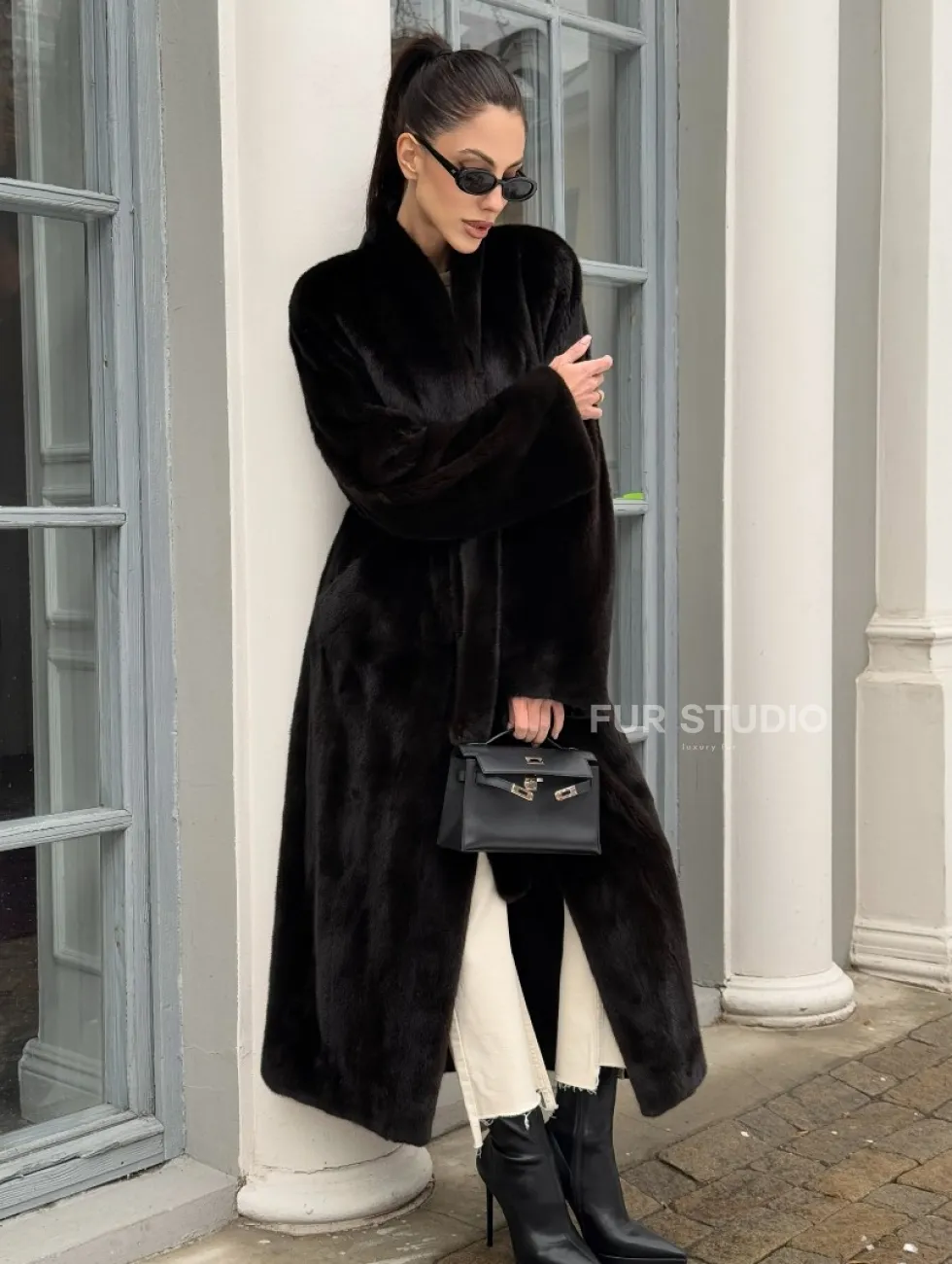 Мех данной шубы скандинавская норка, цвет коричневый. Предлагается в размерах от 42 до 44 с (46 по 52 индивидуальный пошив). Длина модели 125-130 см, что выгодно подчеркивает фигуру девушек. Эта модель идеально подойдет для девушек и женщин, предпочитающих роскошные натуральные меха.