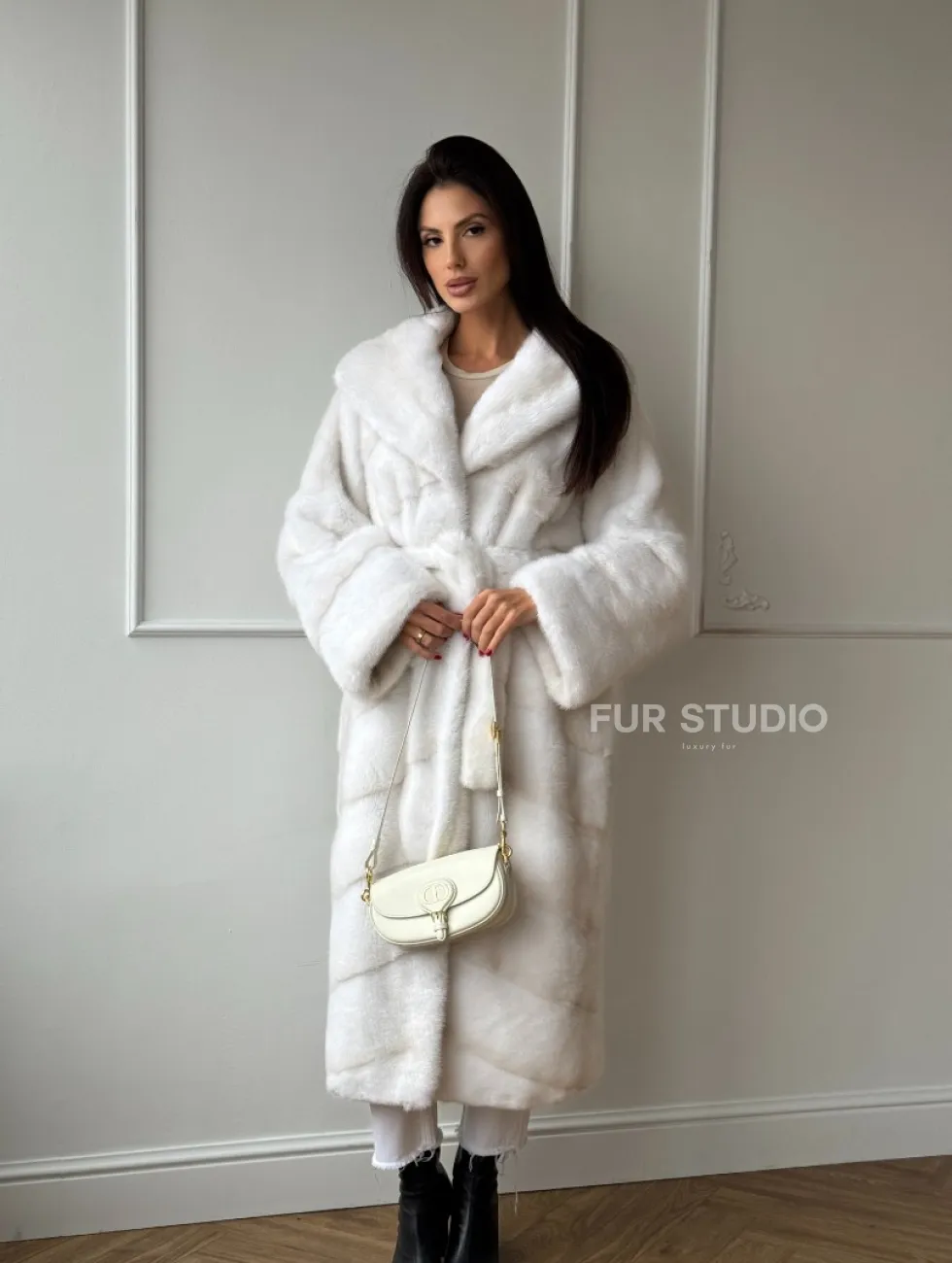 Мех данной шубы аукционная норка , цвет белый. Предлагается в размерах от 42 до 50. Длина модели 115-120 см, что выгодно подчеркивает фигуру девушек. Эта модель идеально подойдет для девушек и женщин, предпочитающих роскошные натуральные меха.