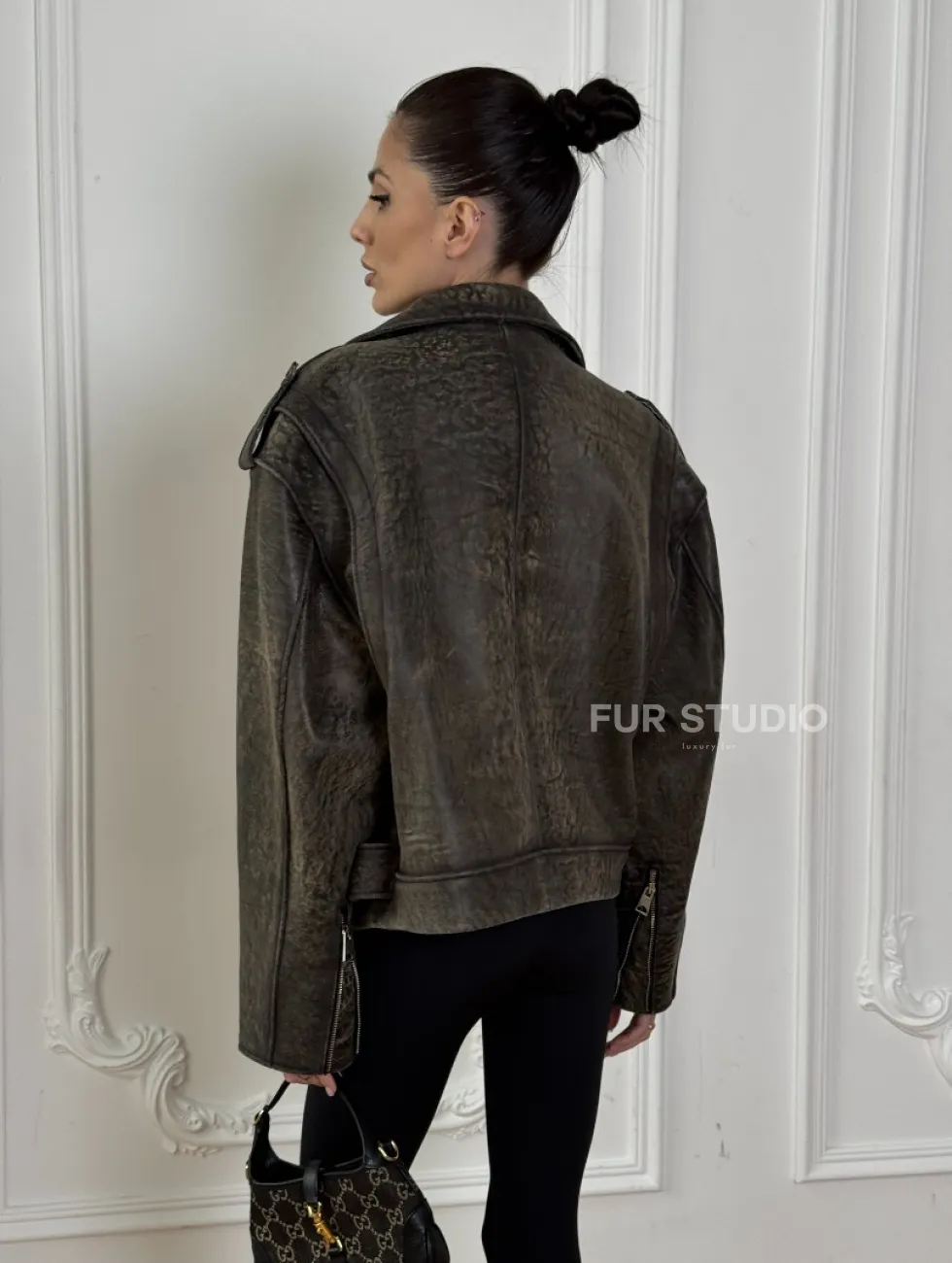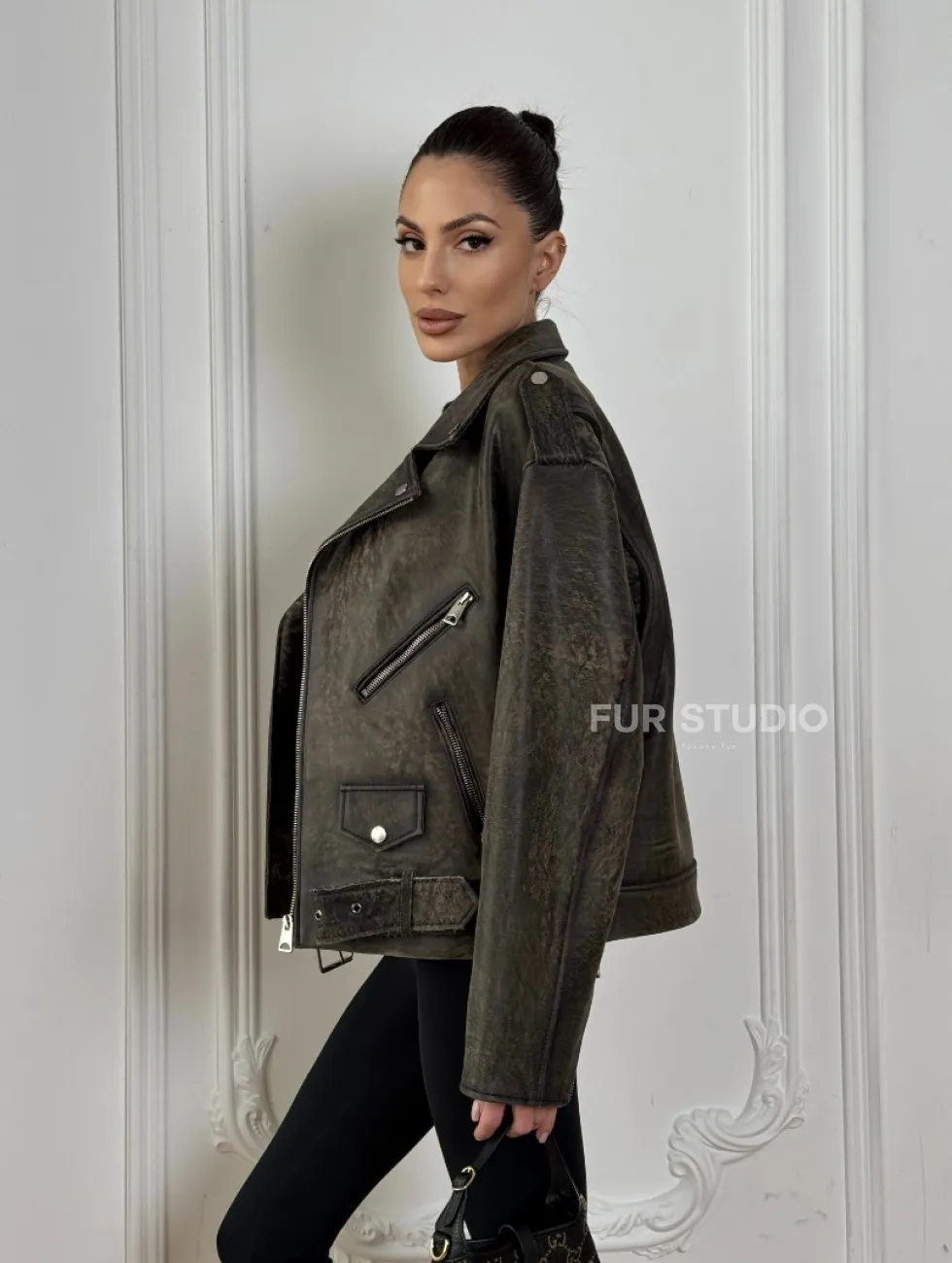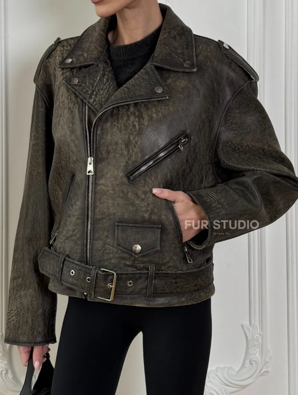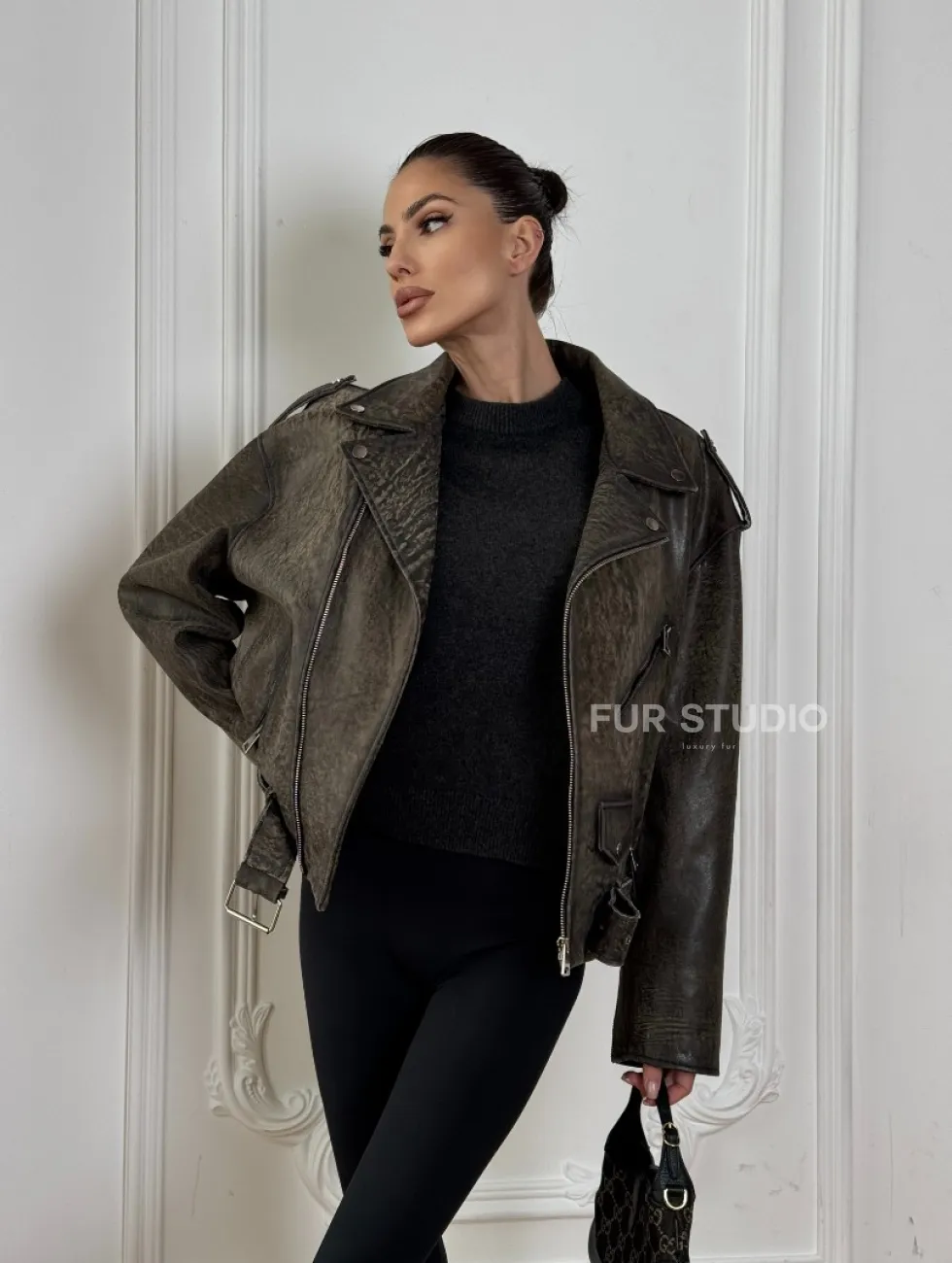 Натуральная женская кожаная косуха в стиле Vintage весна - 2025 доступна для покупки в нашем шоуруме Furs Studio в Чите, где также предоставляется удобная доставка во все города России.