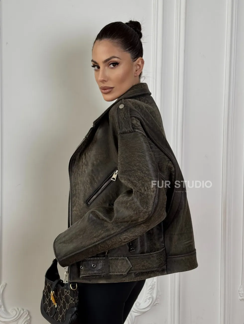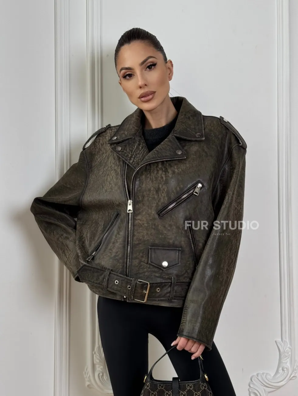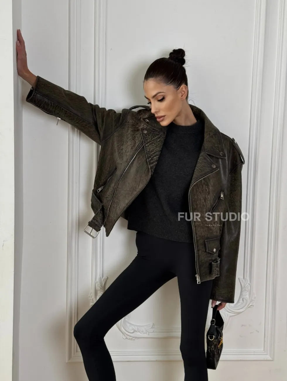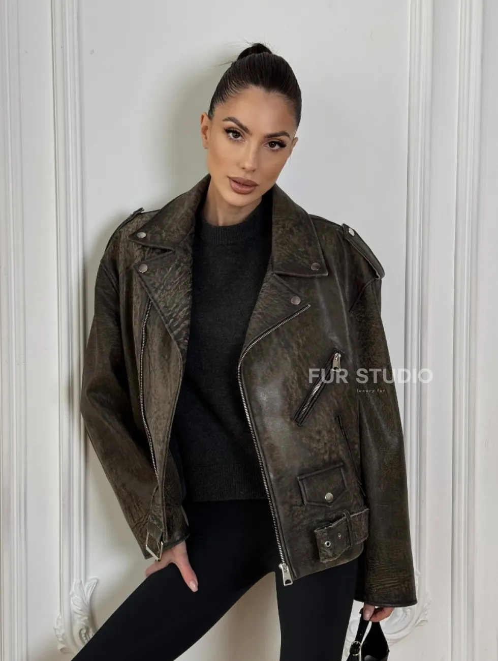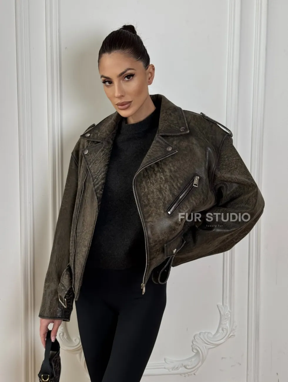 Натуральная женская кожаная косуха в стиле Vintage весна - 2025 доступна для покупки в нашем шоуруме Furs Studio в Чите, где также предоставляется удобная доставка во все города России.