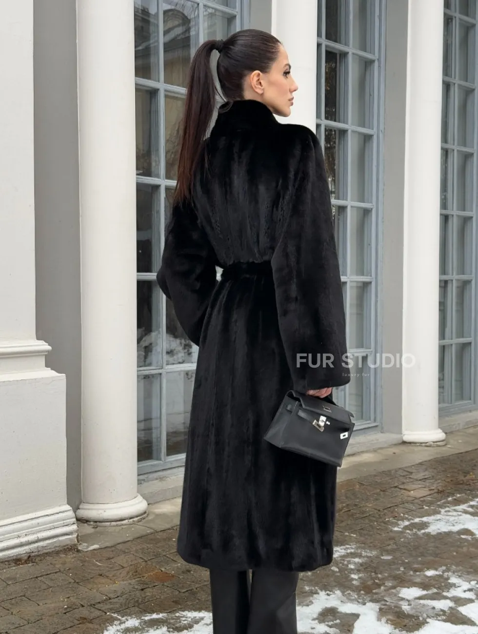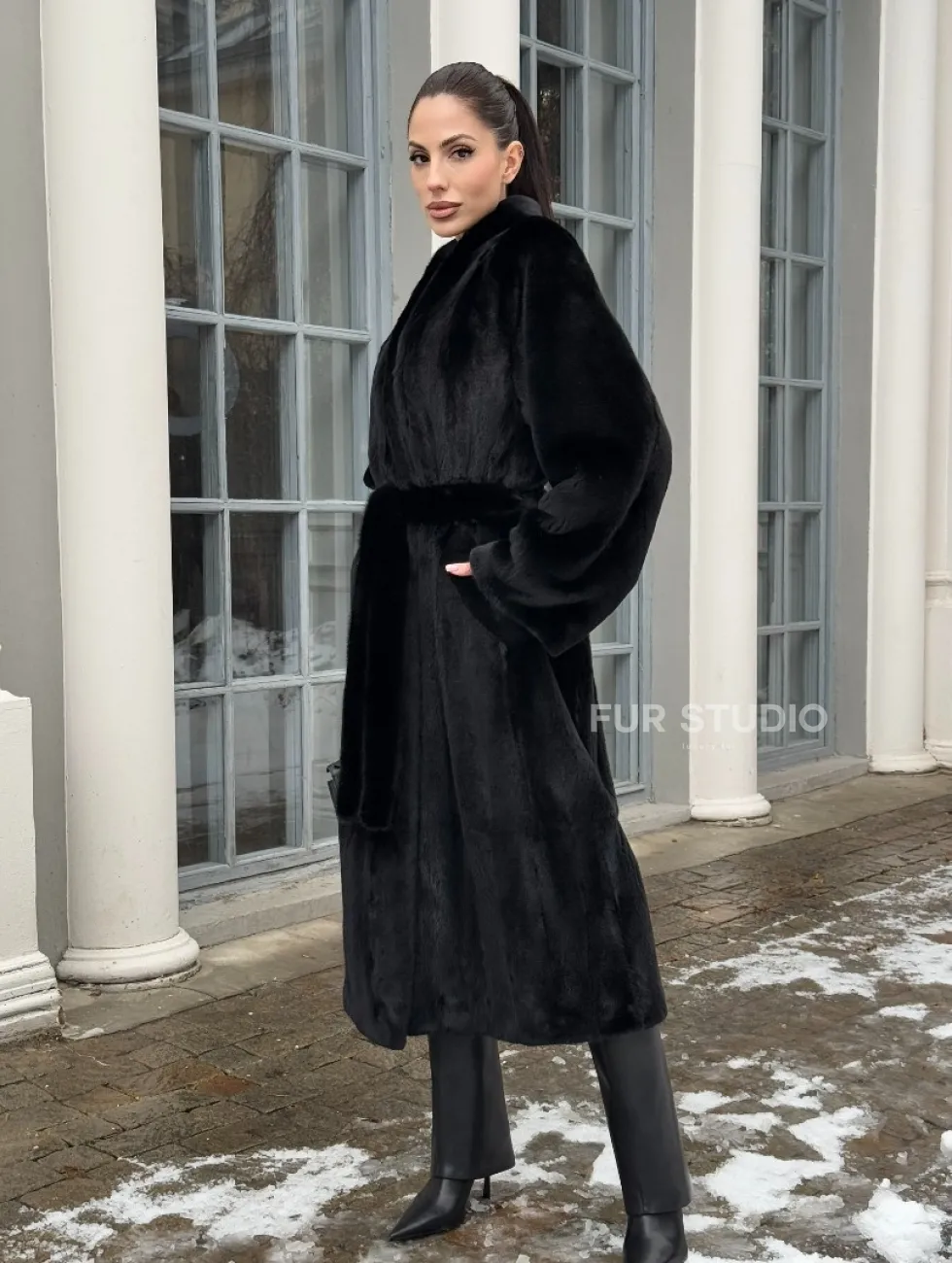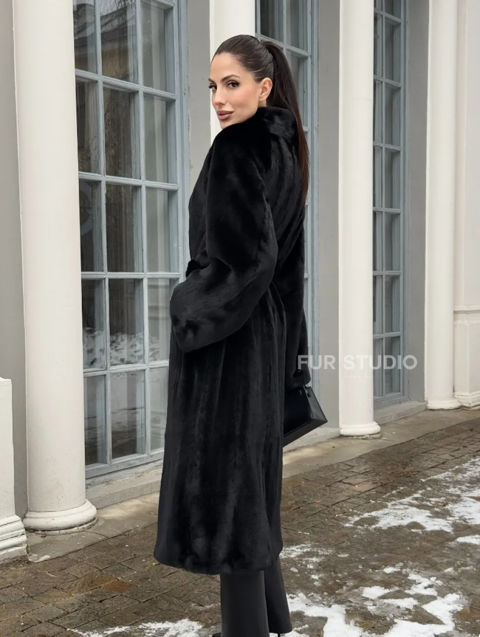 Мех данной шубы скандинавская норка, цвет черный. Предлагается в размерах от 42 до 48 с (50 по 54 индивидуальный пошив). Длина модели 115-120 см, что выгодно подчеркивает фигуру девушек. Эта модель идеально подойдет для девушек и женщин, предпочитающих роскошные натуральные меха.