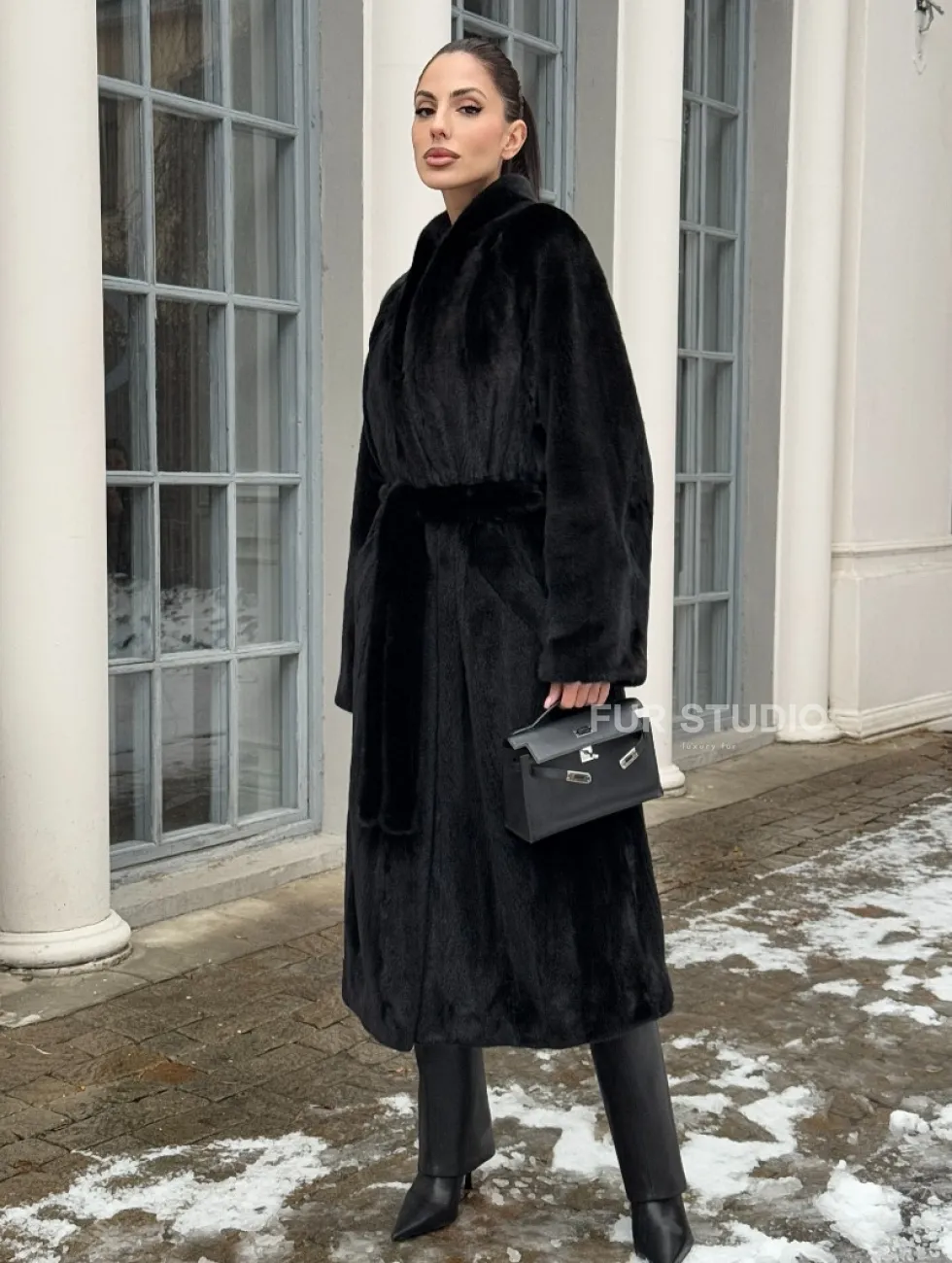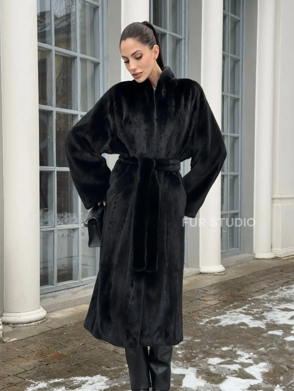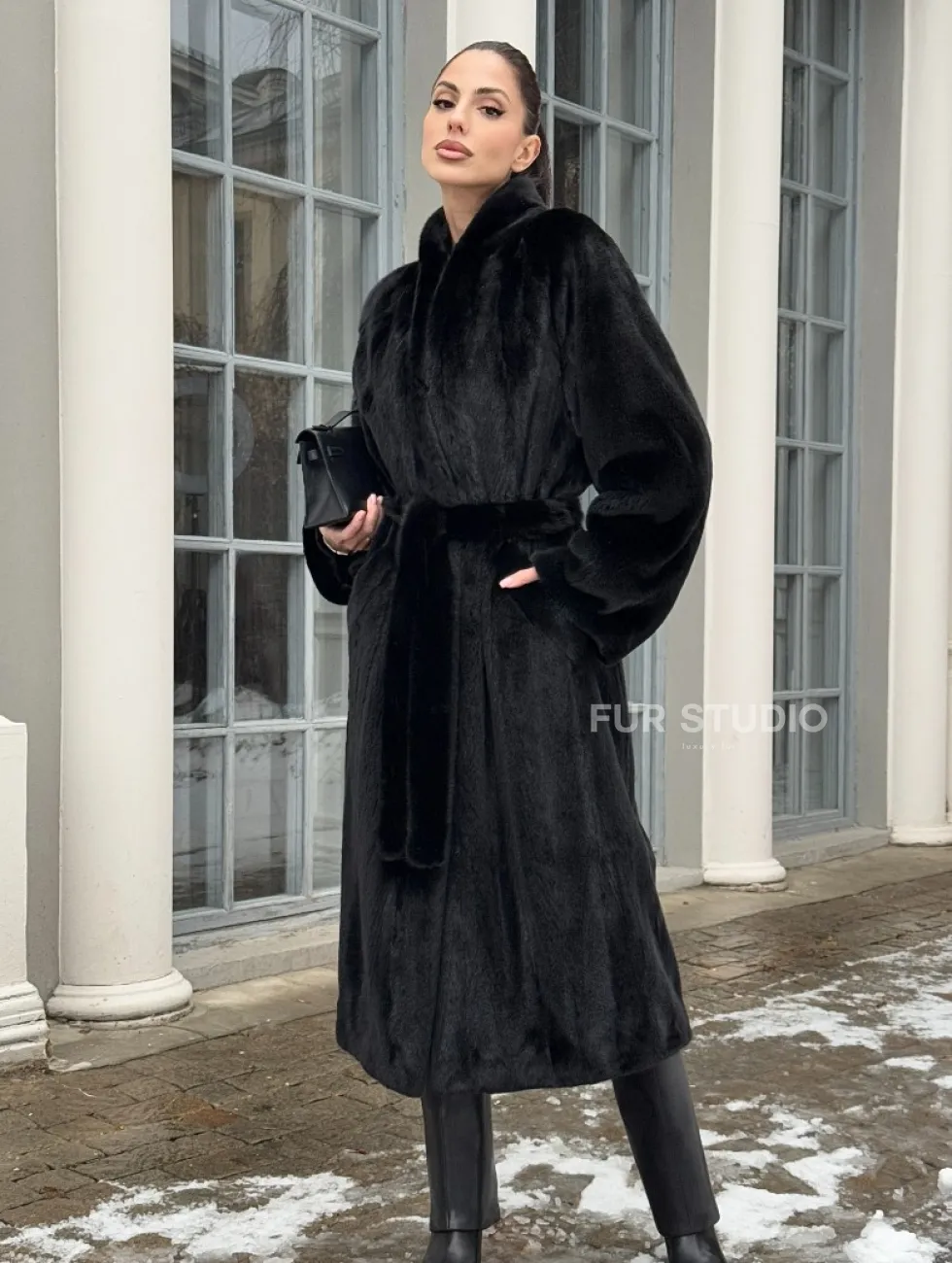 Мех данной шубы скандинавская норка, цвет черный. Предлагается в размерах от 42 до 48 с (50 по 54 индивидуальный пошив). Длина модели 115-120 см, что выгодно подчеркивает фигуру девушек. Эта модель идеально подойдет для девушек и женщин, предпочитающих роскошные натуральные меха.