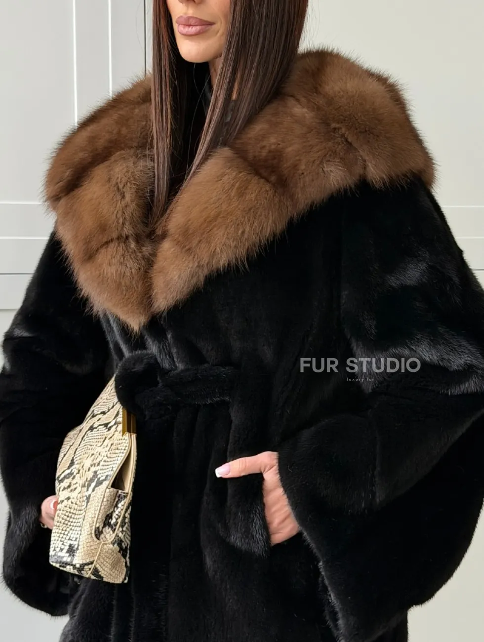 Мех данной шубы аукционная норка , цвет черный. Предлагается в размерах от 42 до 54. Длина модели 105-110 см, что выгодно подчеркивает фигуру девушек. Эта модель идеально подойдет для девушек и женщин, предпочитающих роскошные натуральные меха.