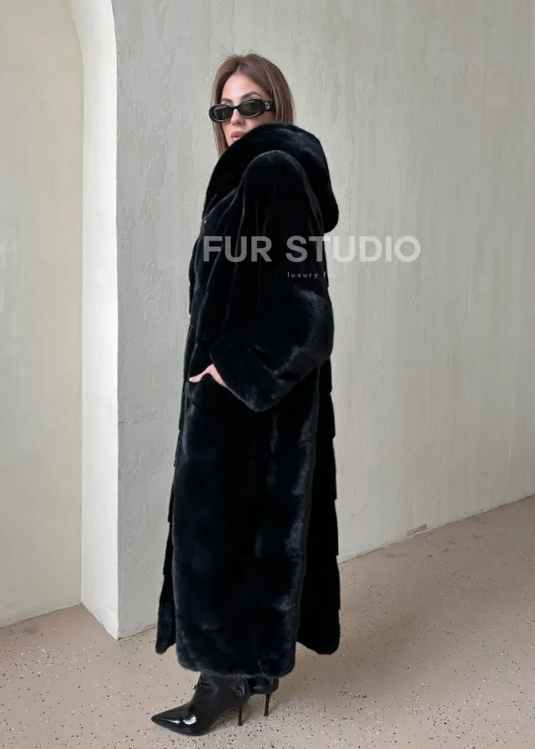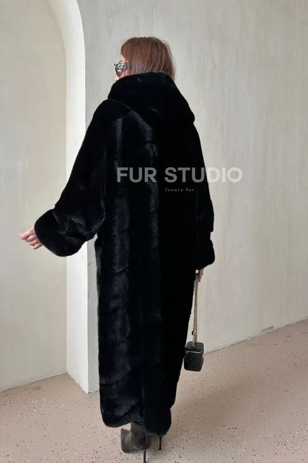 Мех данной шубы аукционная норка, цвет черный. Предлагается в размерах от 44 до 64. Длина модели 115-120 см, что выгодно подчеркивает фигуру девушек. Эта модель идеально подойдет для девушек и женщин, предпочитающих роскошные натуральные меха.