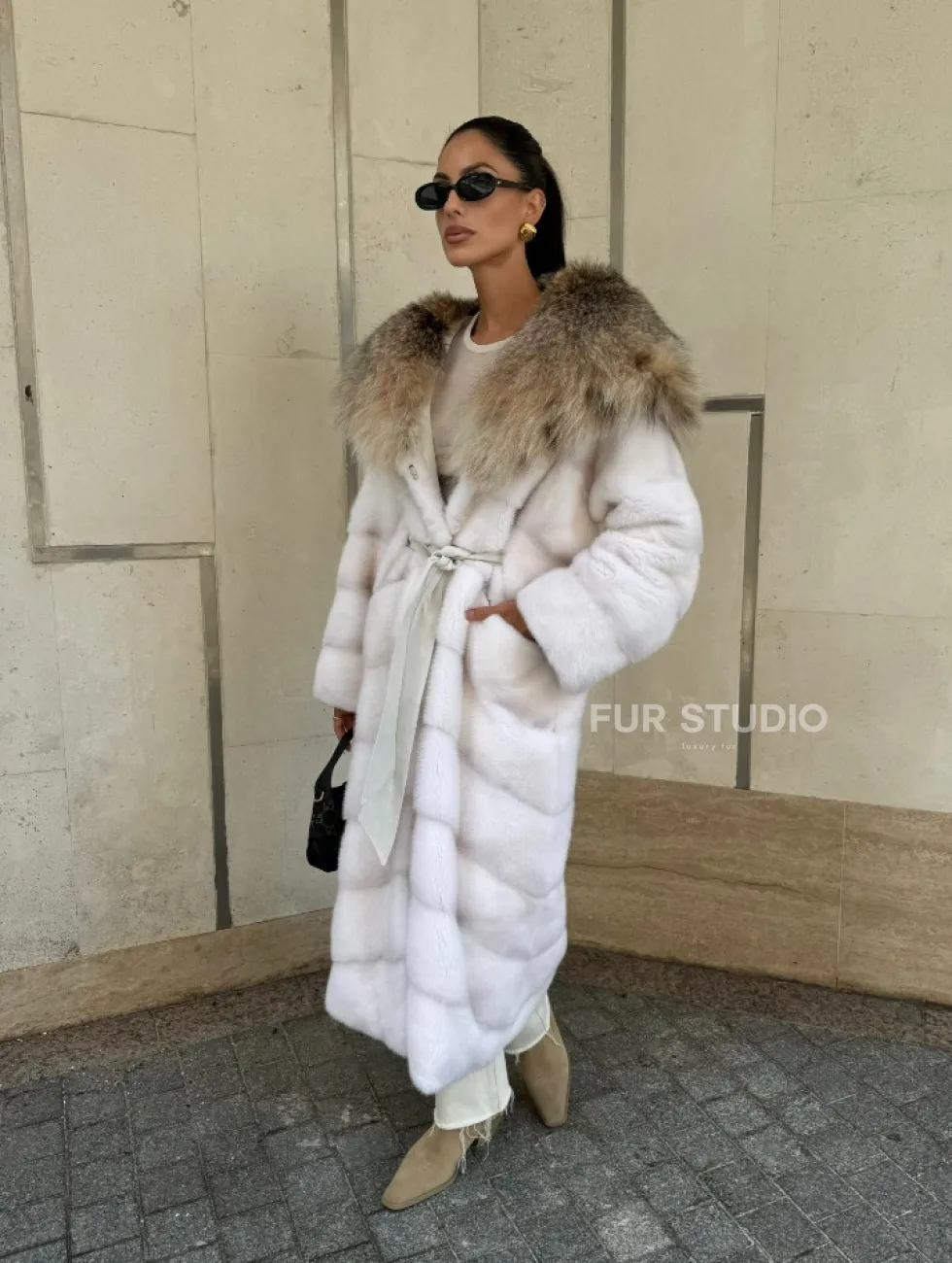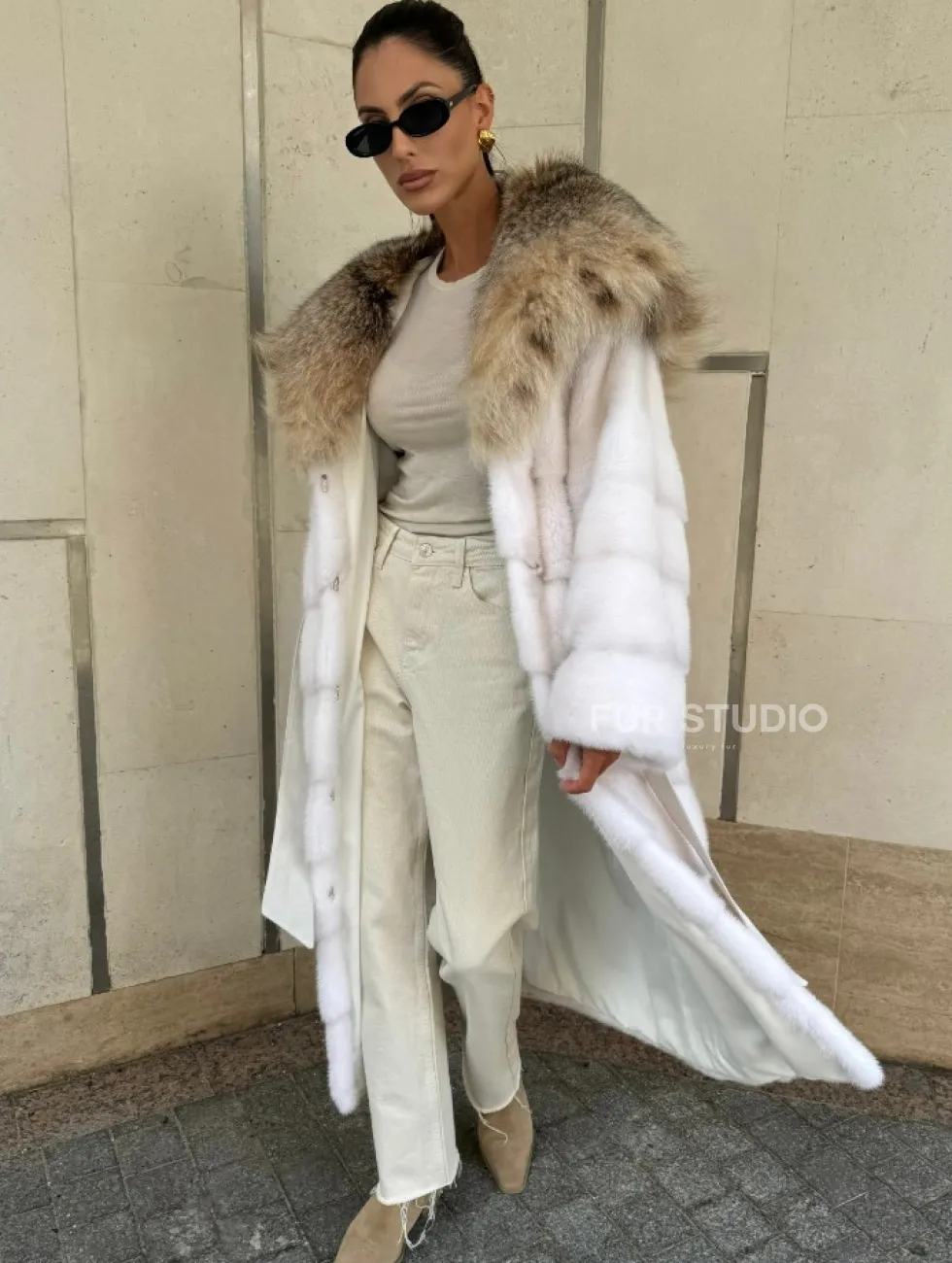 Мех данной шубы аукционная норка, цвет белый. Предлагается в размерах от 42 до 54. Длина модели 115-120 см, что выгодно подчеркивает фигуру девушек. Эта модель идеально подойдет для девушек и женщин, предпочитающих роскошные натуральные меха.
