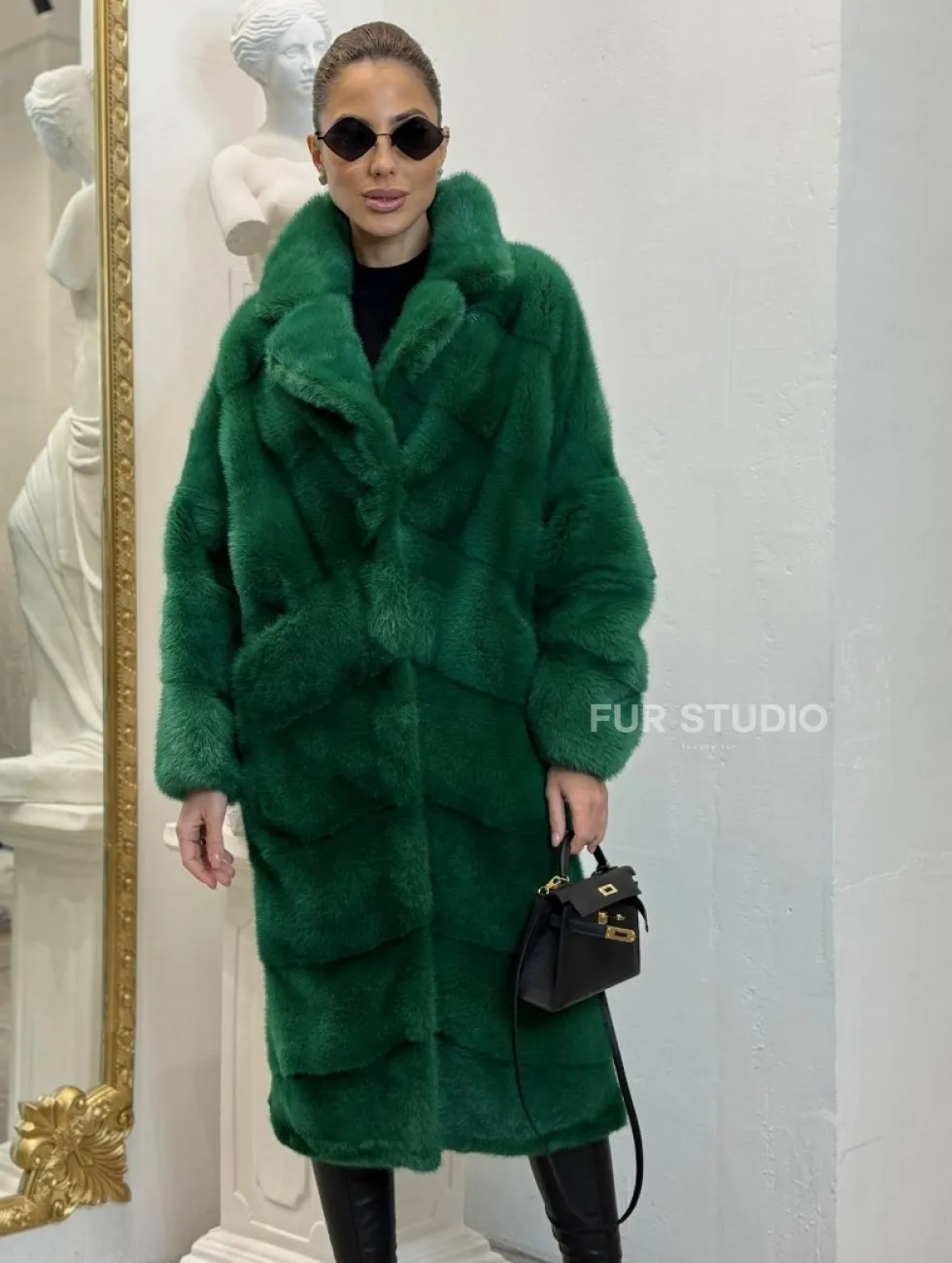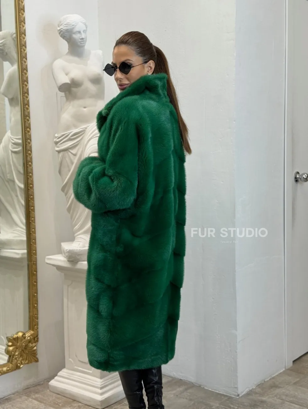Мех данной шубы аукционная норка, цвет зеленый. Предлагается в размерах от 42 до 48. Длина модели 105-110 см, что выгодно подчеркивает фигуру девушек. Эта модель идеально подойдет для девушек и женщин, предпочитающих роскошные натуральные меха.