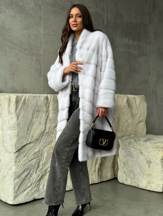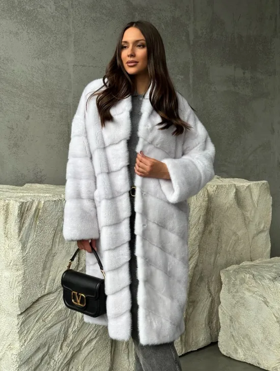 Мех данной шубы аукционная норка, цвет бежевый. Предлагается в размерах от 40 до 50 (oversize). Длина модели 75-80 см, что выгодно подчеркивает фигуру девушек. Эта модель идеально подойдет для девушек и женщин, предпочитающих роскошные натуральные меха.
