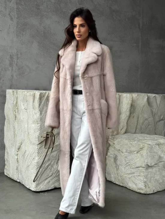 Мех данной шубы аукционная норка, цвет бежевый. Предлагается в размерах от 42 до 48. Длина модели 70-75 см, что выгодно подчеркивает фигуру девушек. Эта модель идеально подойдет для девушек и женщин, предпочитающих роскошные натуральные меха.