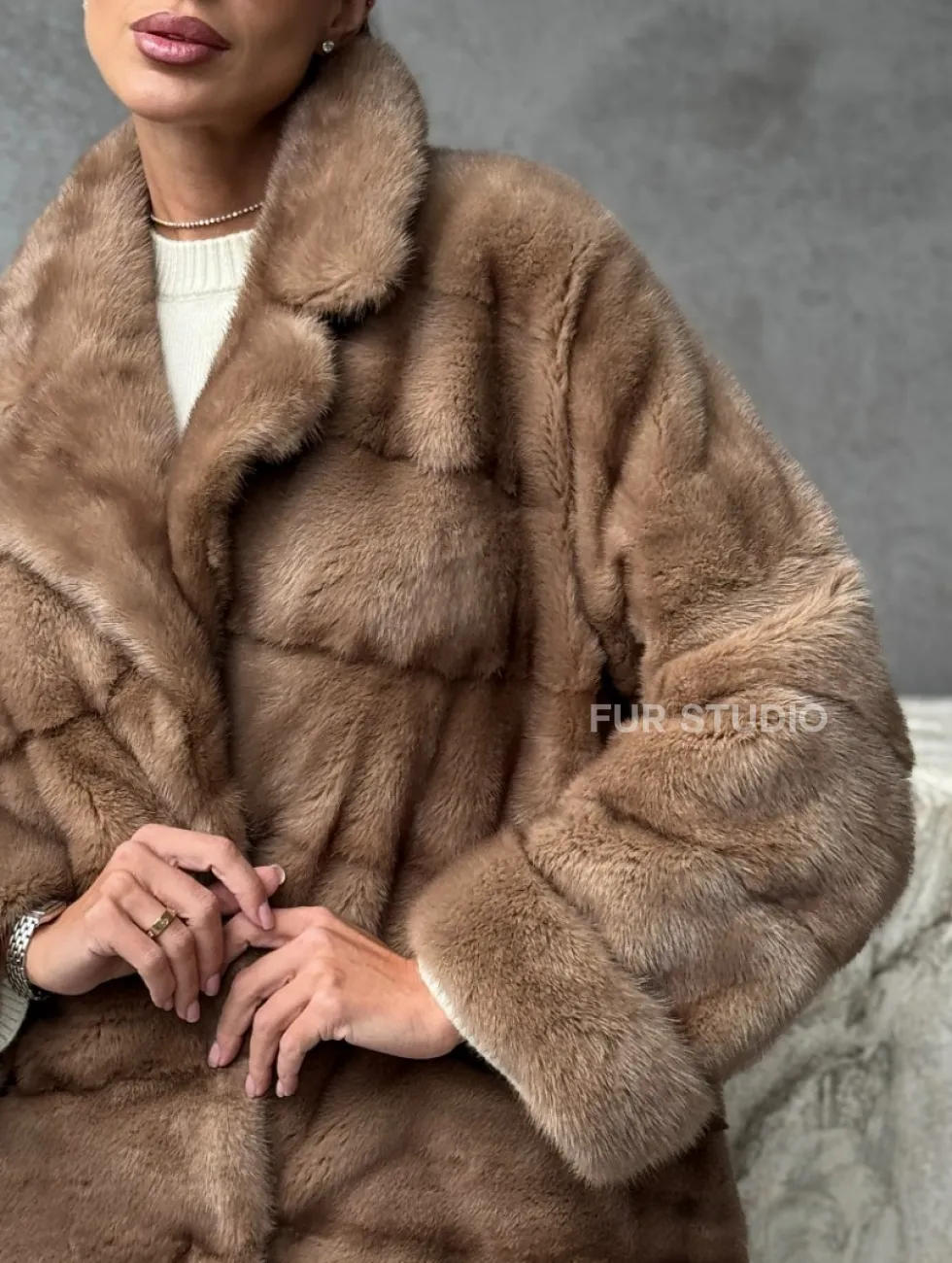 Мех данной шубы аукционная норка, цвет бежевый. Предлагается в размерах от 42 до 50. Длина модели 65-70 см , что выгодно подчеркивает фигуру девушек. Эта модель идеально подойдет для девушек и женщин, предпочитающих роскошные натуральные меха.