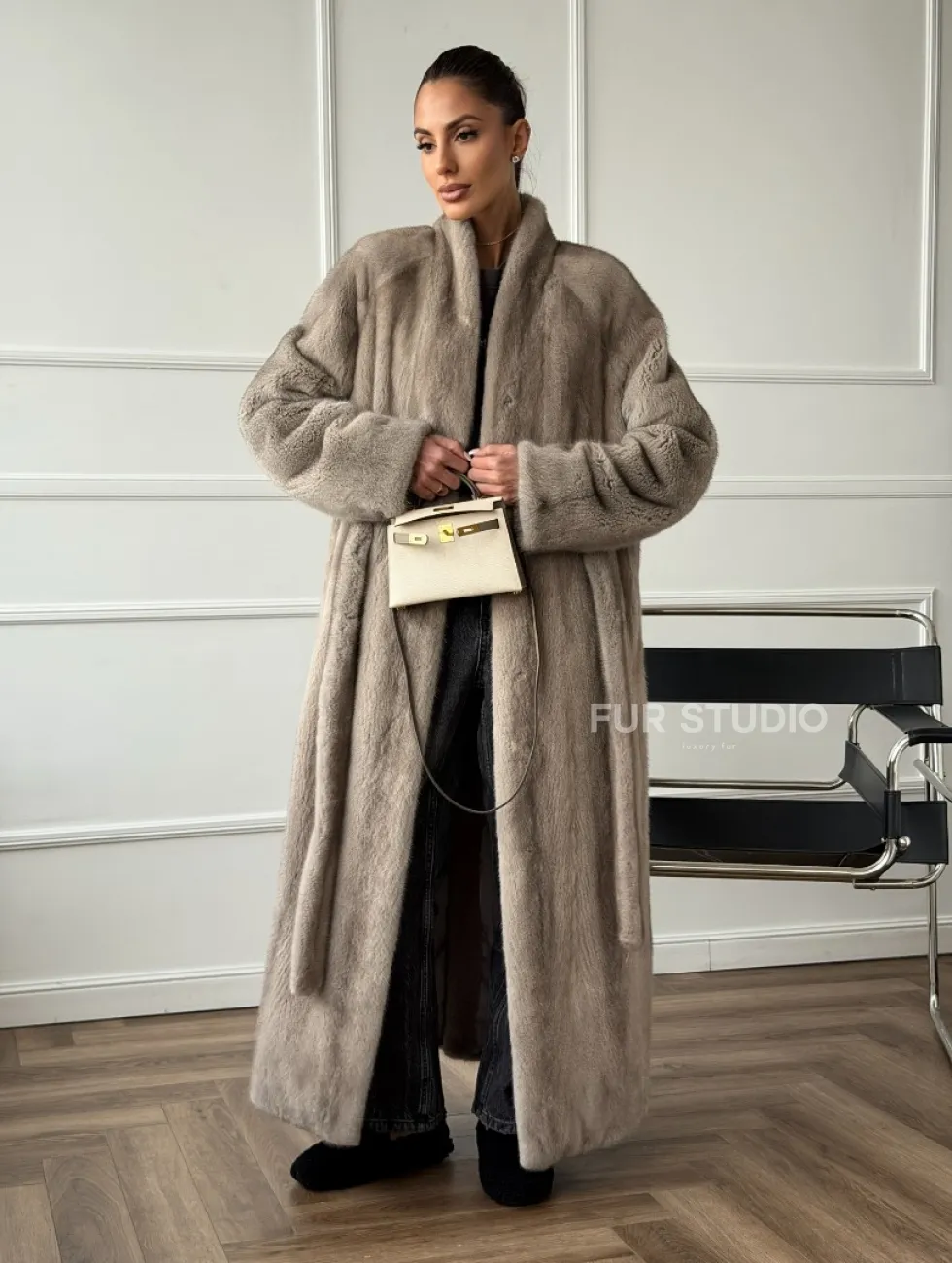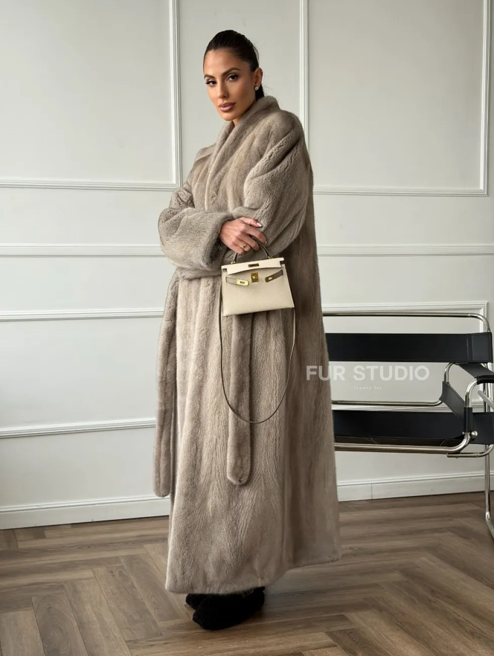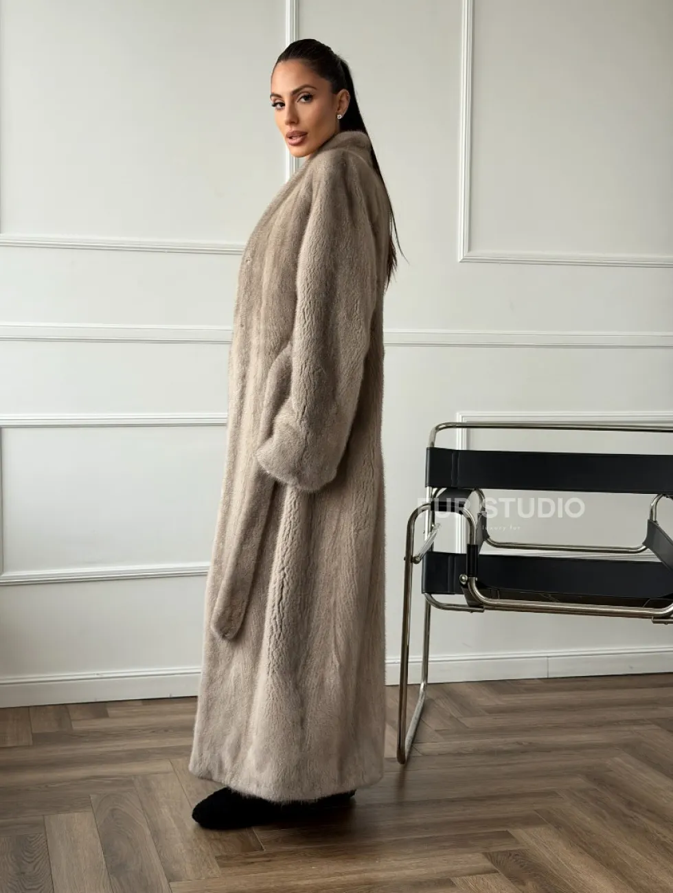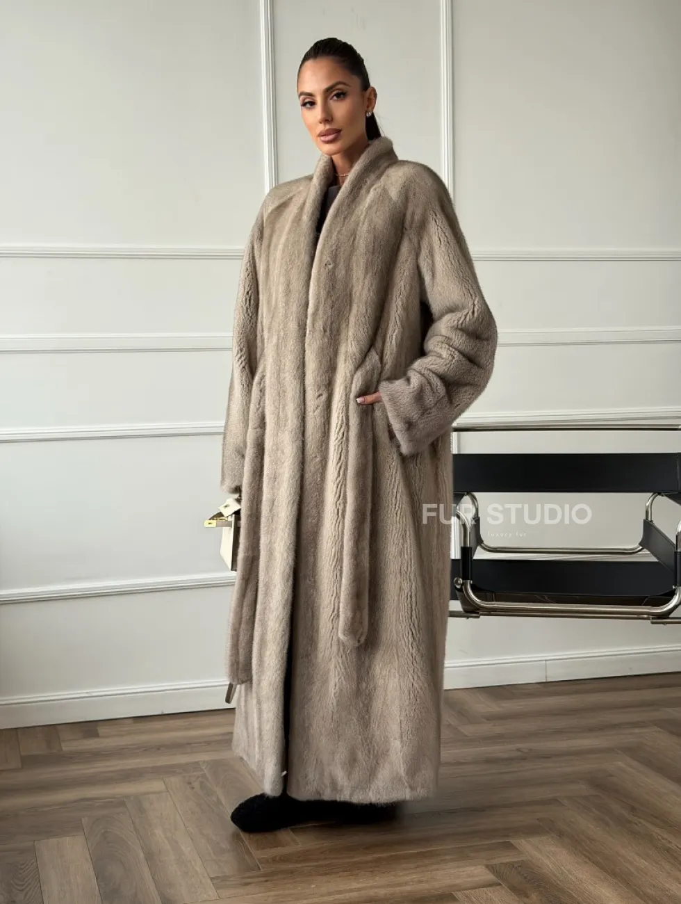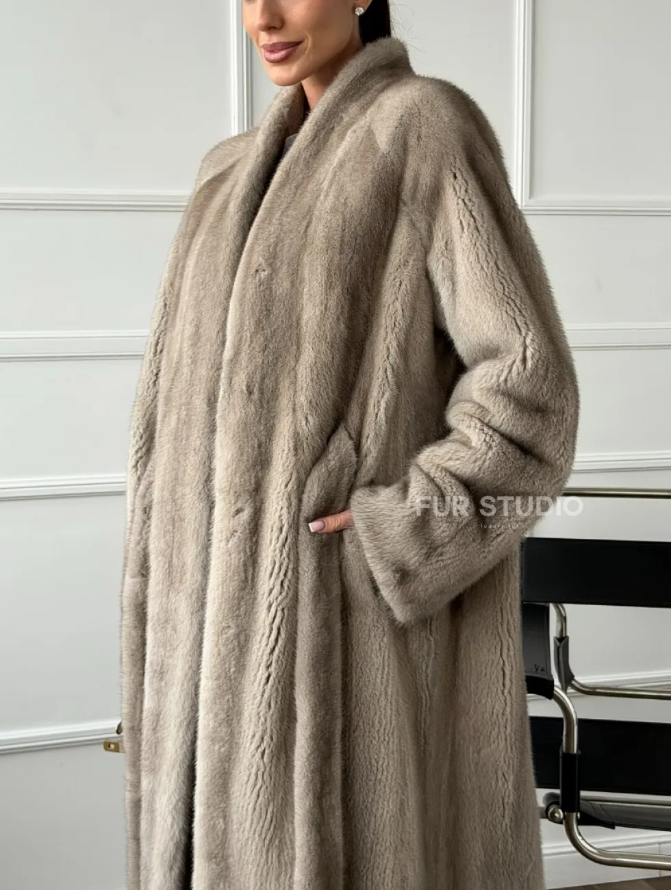 Мех данной шубы аукционная норка, цвет серый. Предлагается в размерах от 42 до 52. Длина модели 125-130 см, что выгодно подчеркивает фигуру девушек. Эта модель идеально подойдет для девушек и женщин, предпочитающих роскошные натуральные меха.