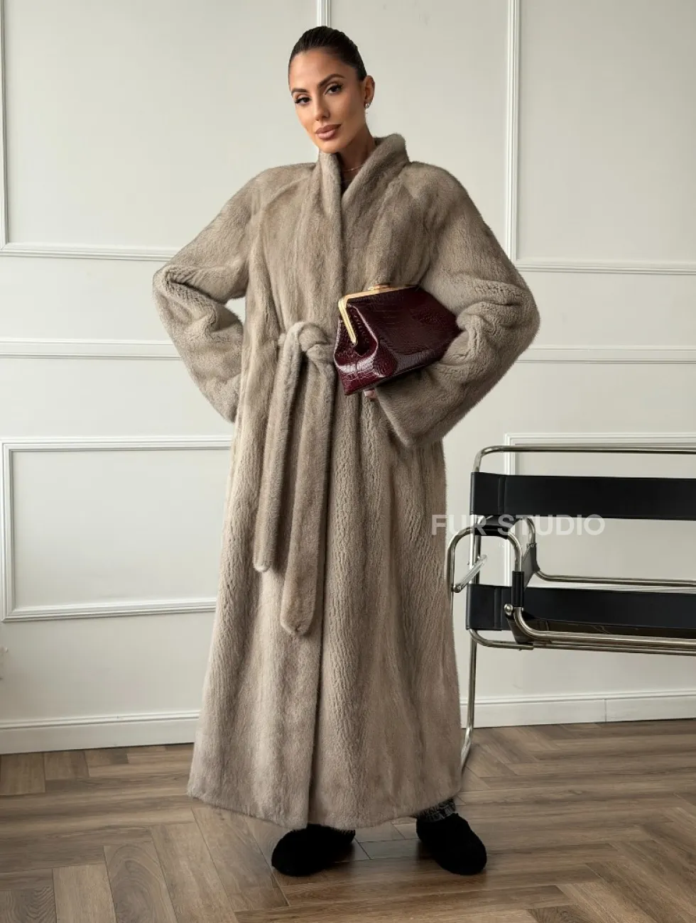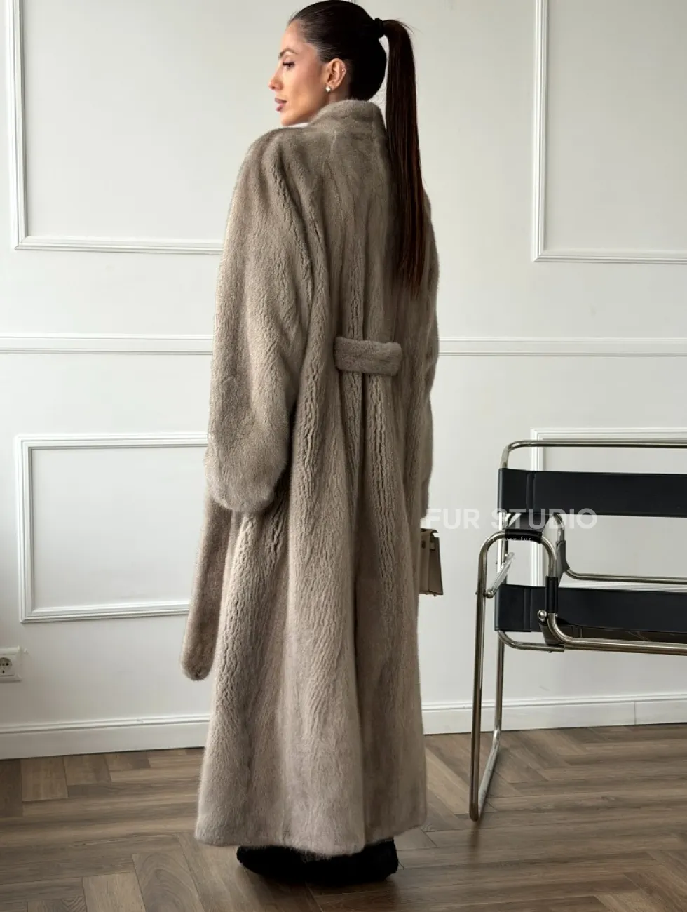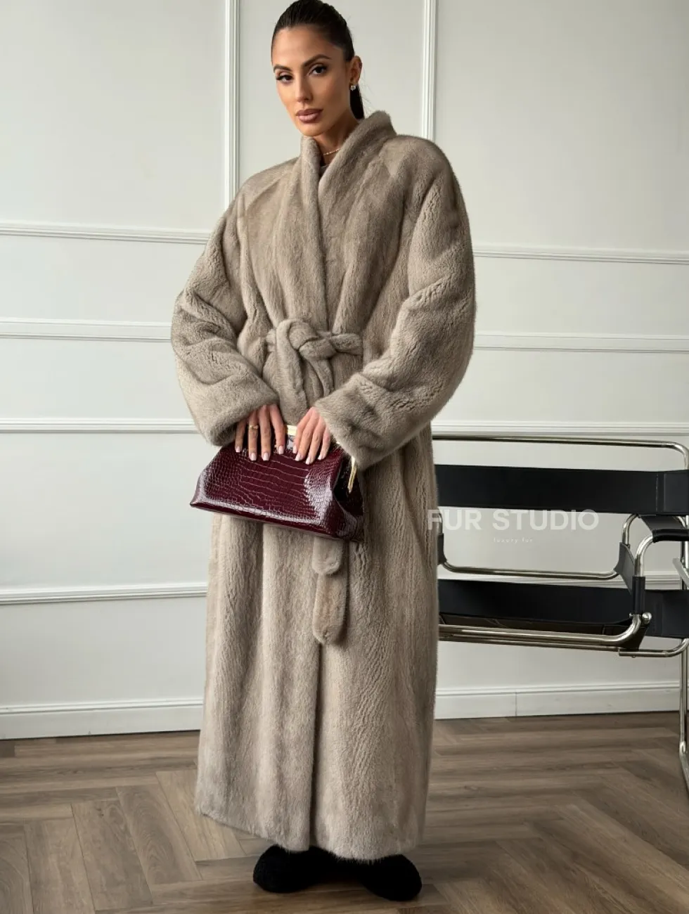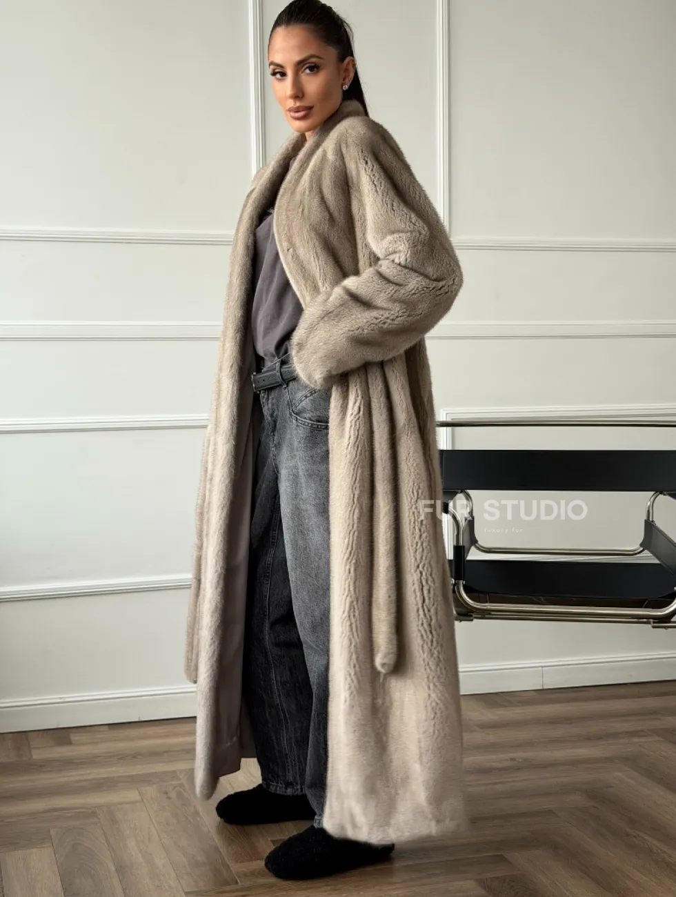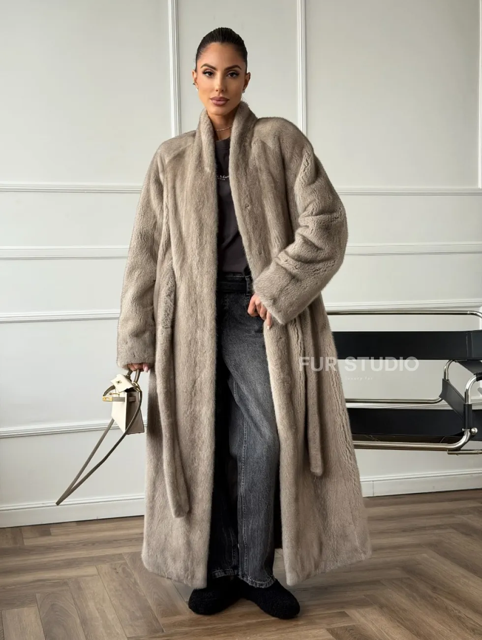 Мех данной шубы аукционная норка, цвет серый. Предлагается в размерах от 42 до 52. Длина модели 125-130 см, что выгодно подчеркивает фигуру девушек. Эта модель идеально подойдет для девушек и женщин, предпочитающих роскошные натуральные меха.