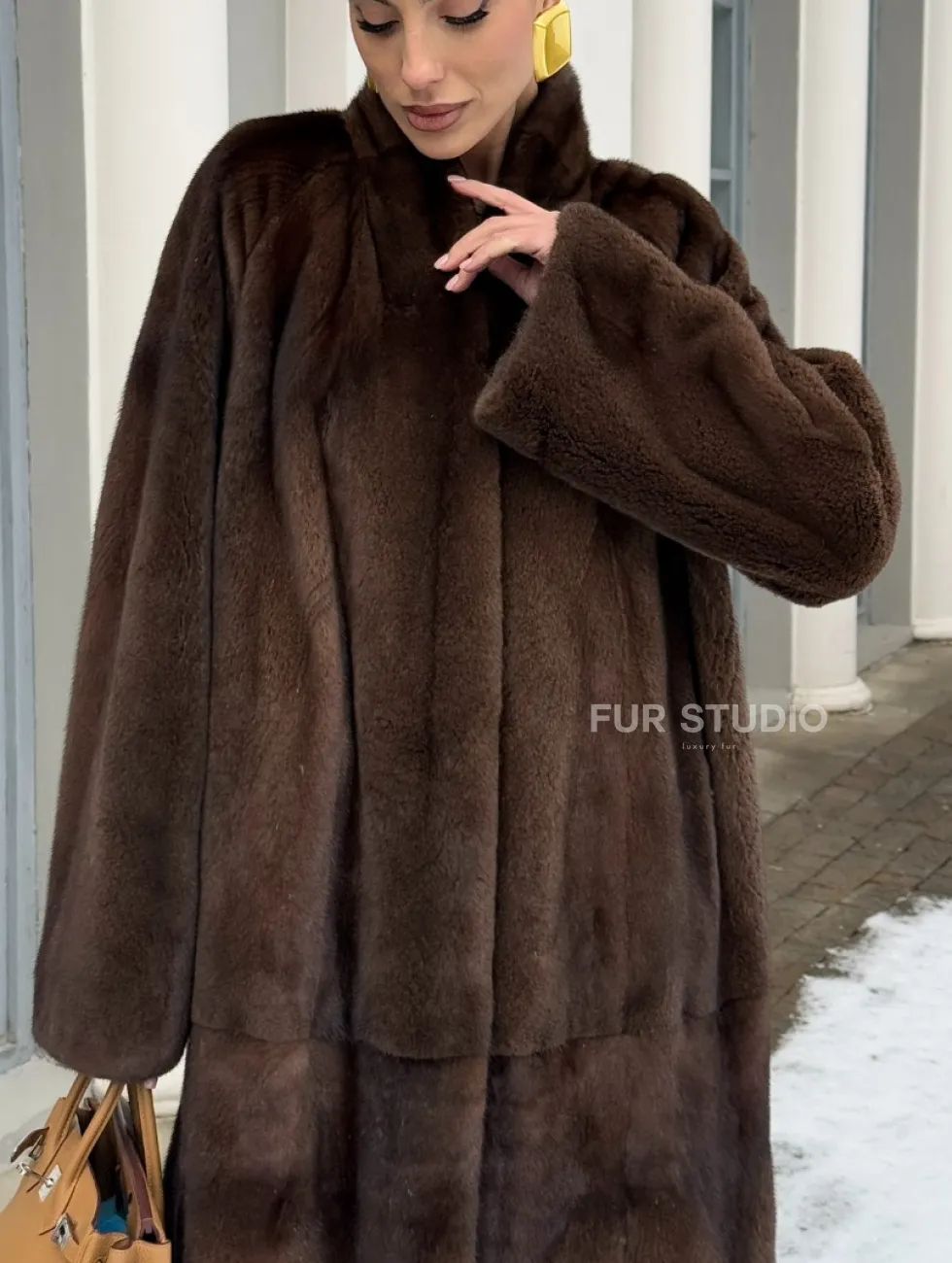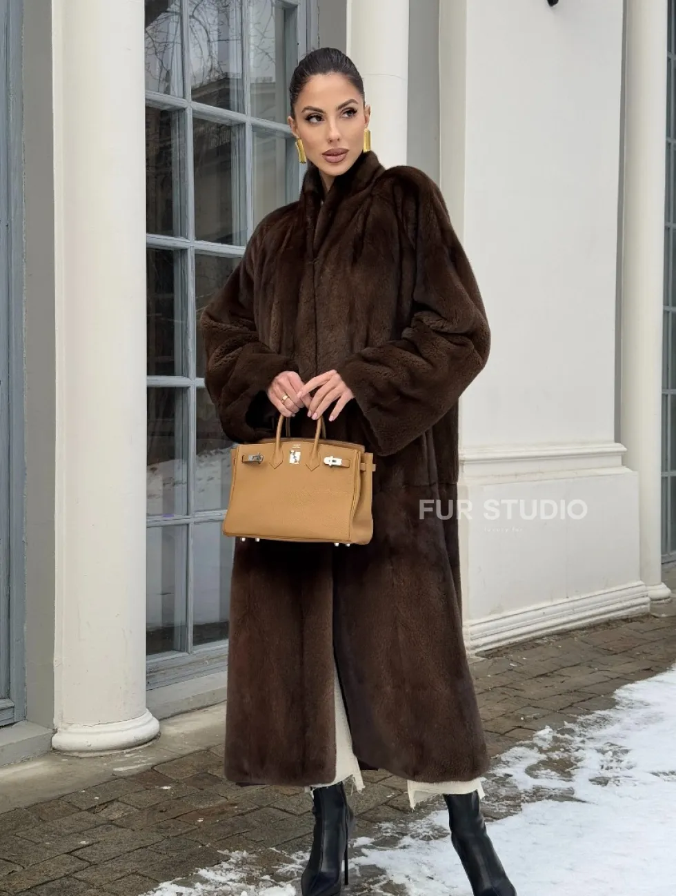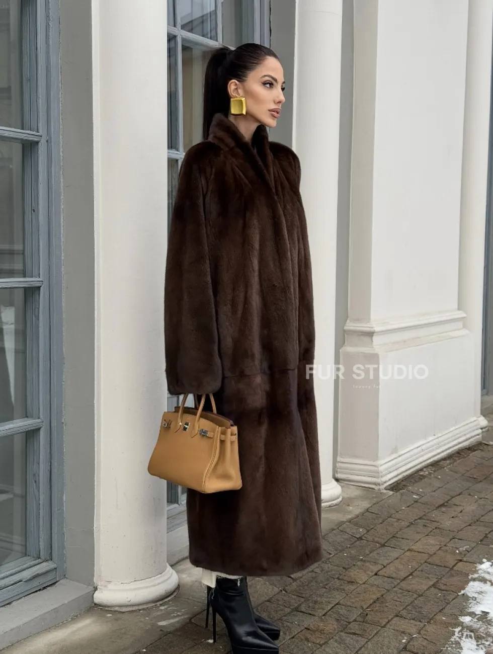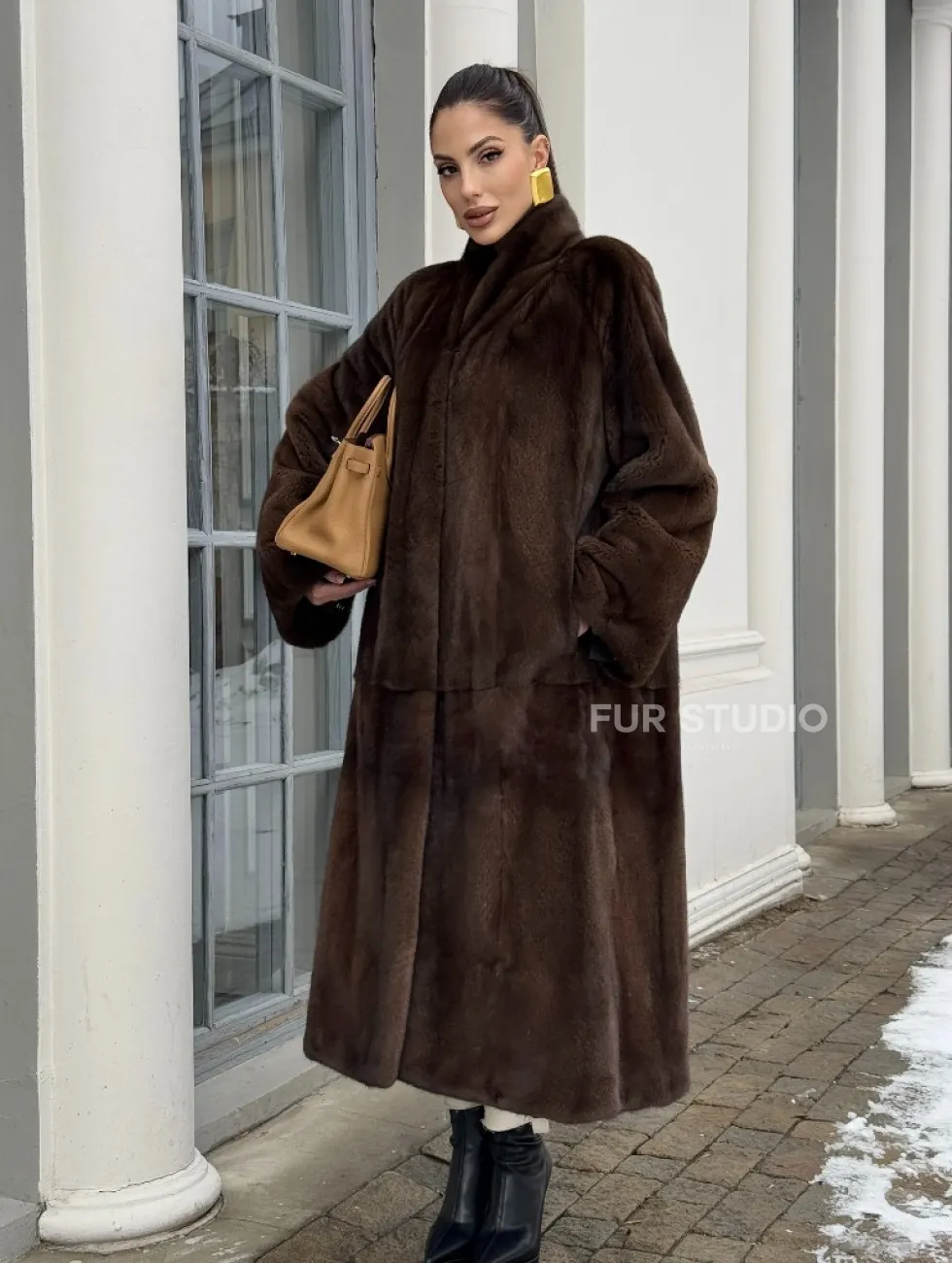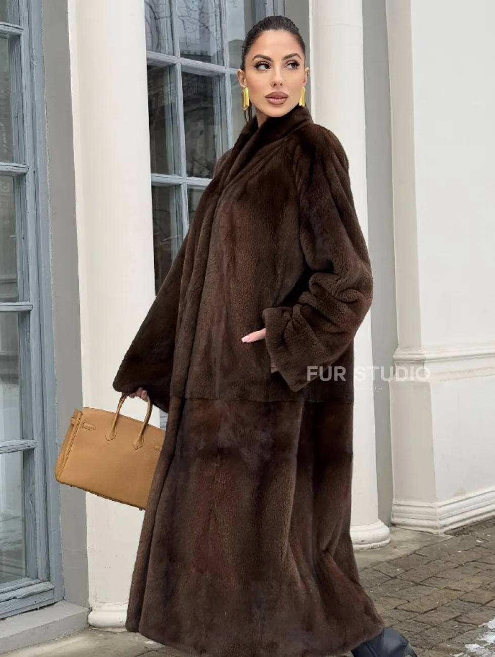 Мех данной шубы скандинавская норка, цвет коричневый. Предлагается в размерах от 50 до 54. Длина модели 120-125 см, что выгодно подчеркивает фигуру девушек. Эта модель идеально подойдет для девушек и женщин, предпочитающих роскошные натуральные меха.