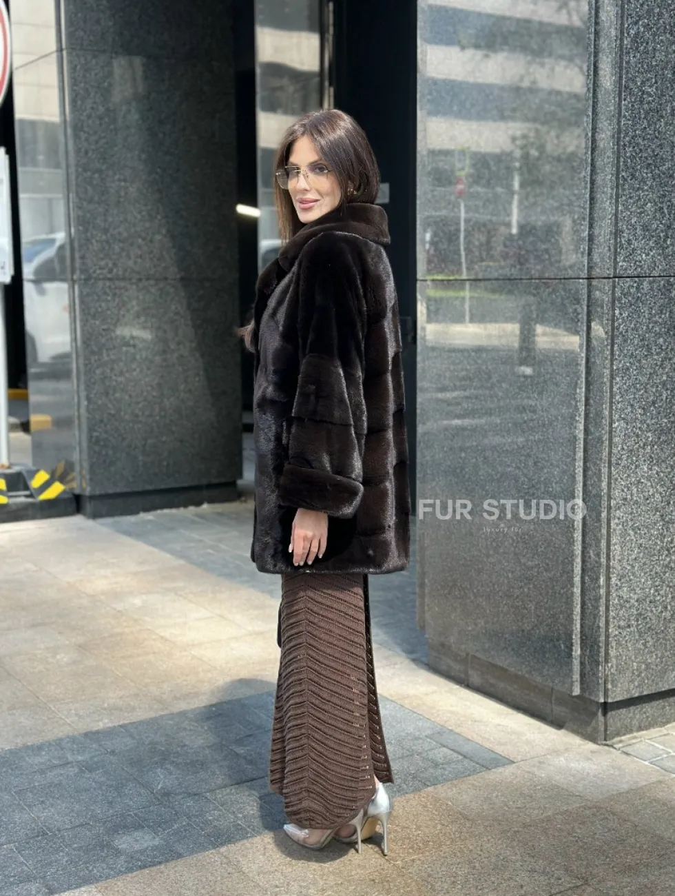 Мех данной шубы аукционная норка, цвет коричневый. Предлагается в размерах от 42 до 50. Длина модели 75-80 см, что выгодно подчеркивает фигуру девушек. Эта модель идеально подойдет для девушек и женщин, предпочитающих роскошные натуральные меха.
