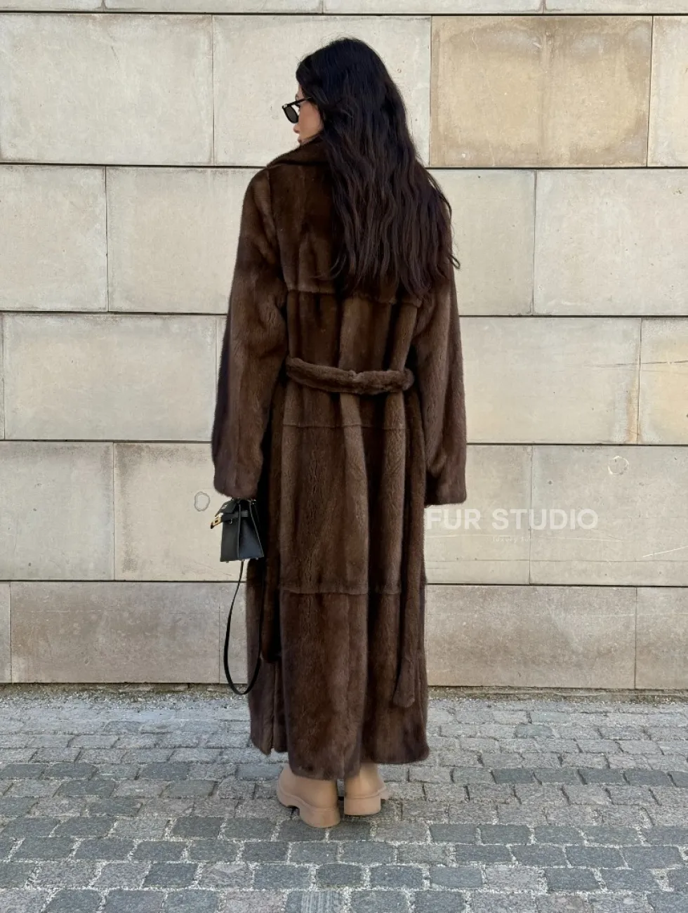 Мех данной шубы аукционная норка , цвет коричневый. Предлагается в размерах от 42 до 52. Длина модели 125-130 см, что выгодно подчеркивает фигуру девушек. Эта модель идеально подойдет для девушек и женщин, предпочитающих роскошные натуральные меха.