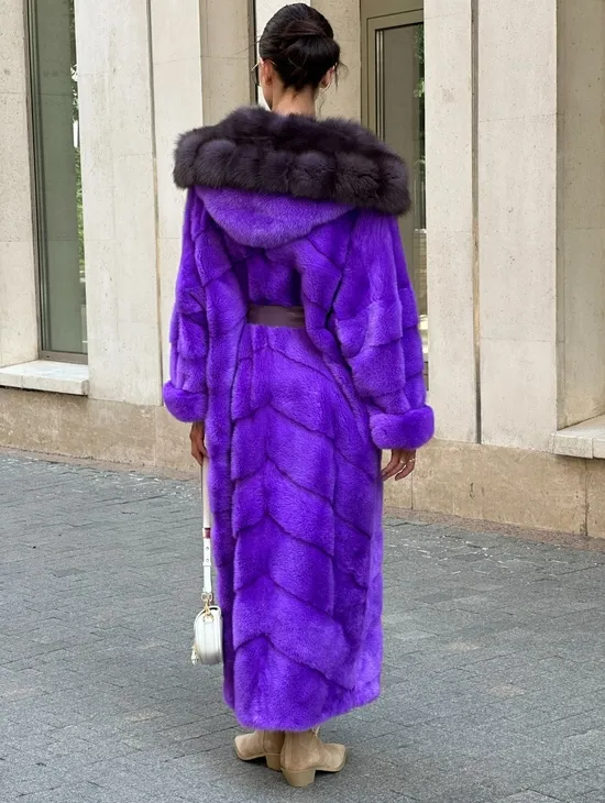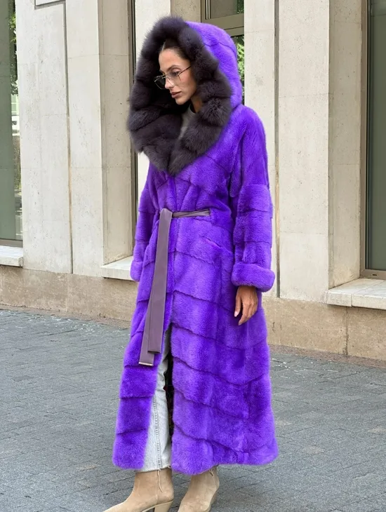 Мех данной шубы аукционная норка , цвет фиолетовый. Предлагается в размерах от 42 до 68. Длина модели 115-120 см, что выгодно подчеркивает фигуру девушек. Эта модель идеально подойдет для девушек и женщин, предпочитающих роскошные натуральные меха.