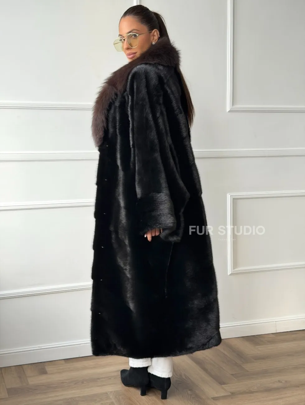 Мех данной шубы аукционная норка , цвет черный. Предлагается в размерах от 44 до 58. Длина модели 115-120 см, что выгодно подчеркивает фигуру девушек. Эта модель идеально подойдет для девушек и женщин, предпочитающих роскошные натуральные меха.